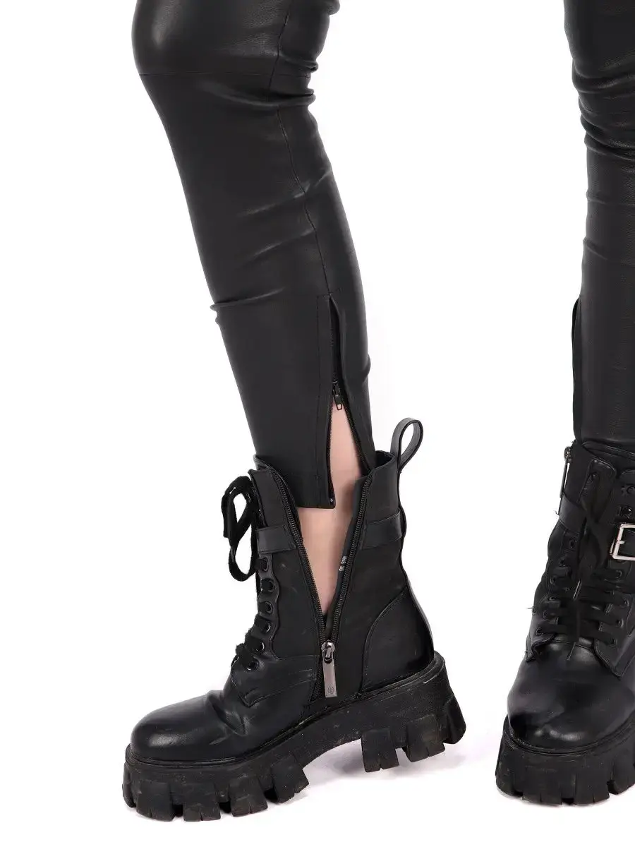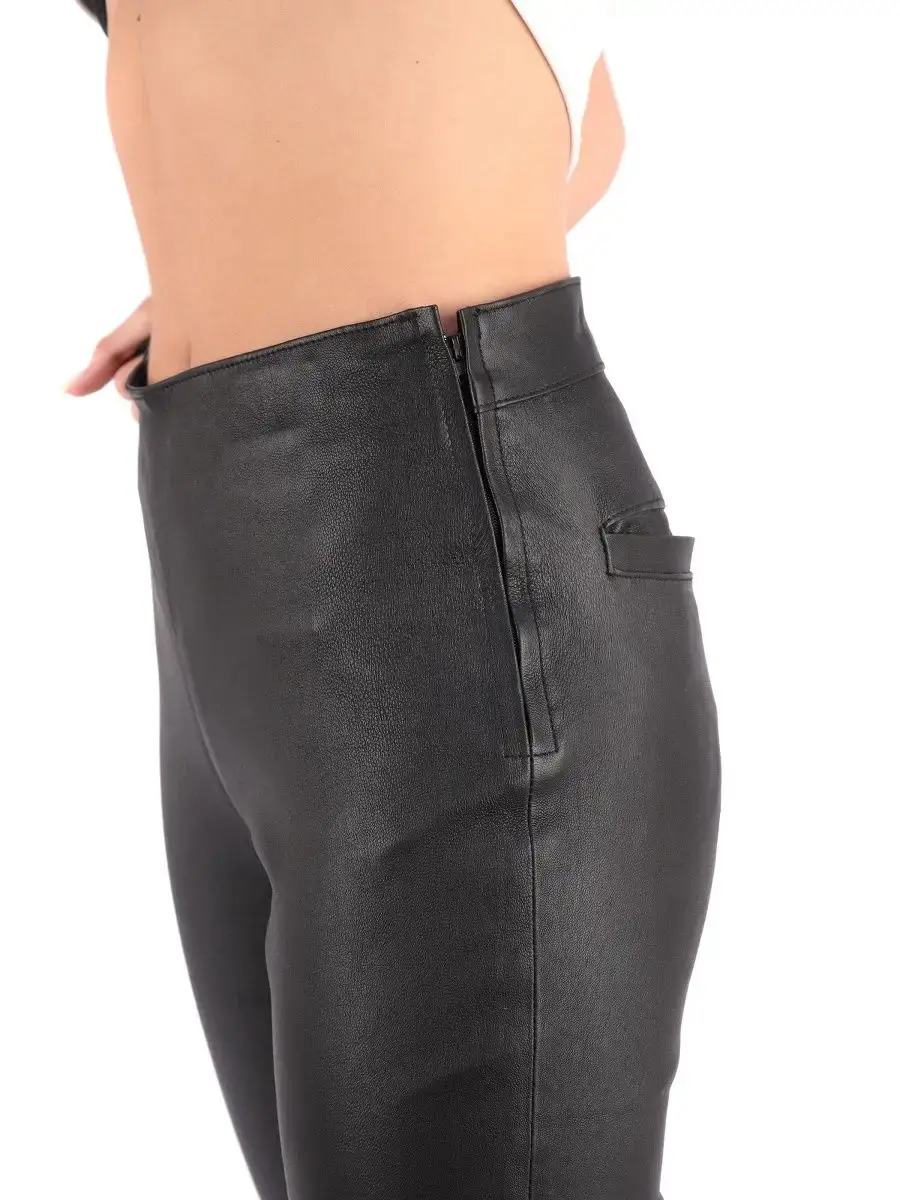 Женские кожаные брюки из натуральной кожи ягненка, эластичны и хорошо тянутся, отлично поддерживают фигуру. Брюки женские зауженные с потайными молниями внизу штанин. Длина по внешнему шву 96см. MONDIAL Производство Турция.