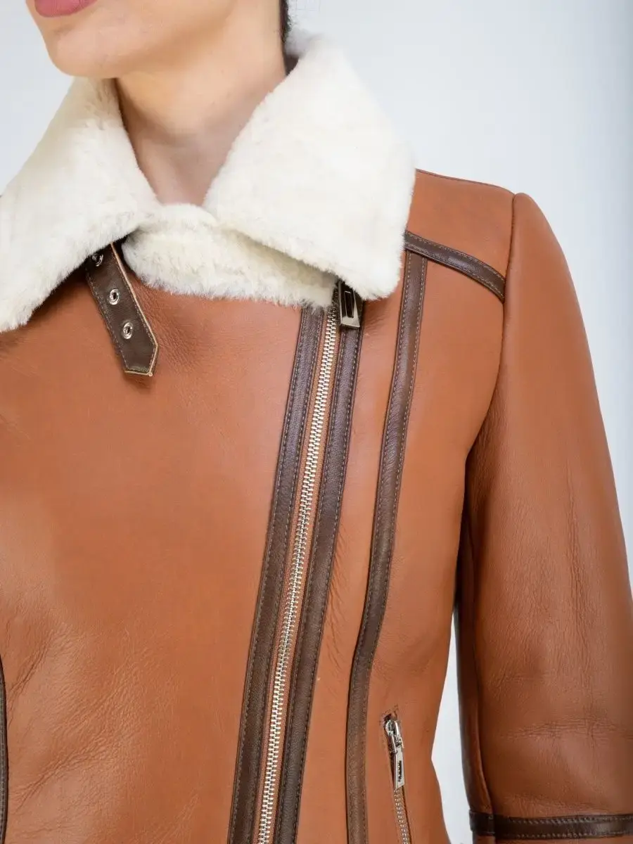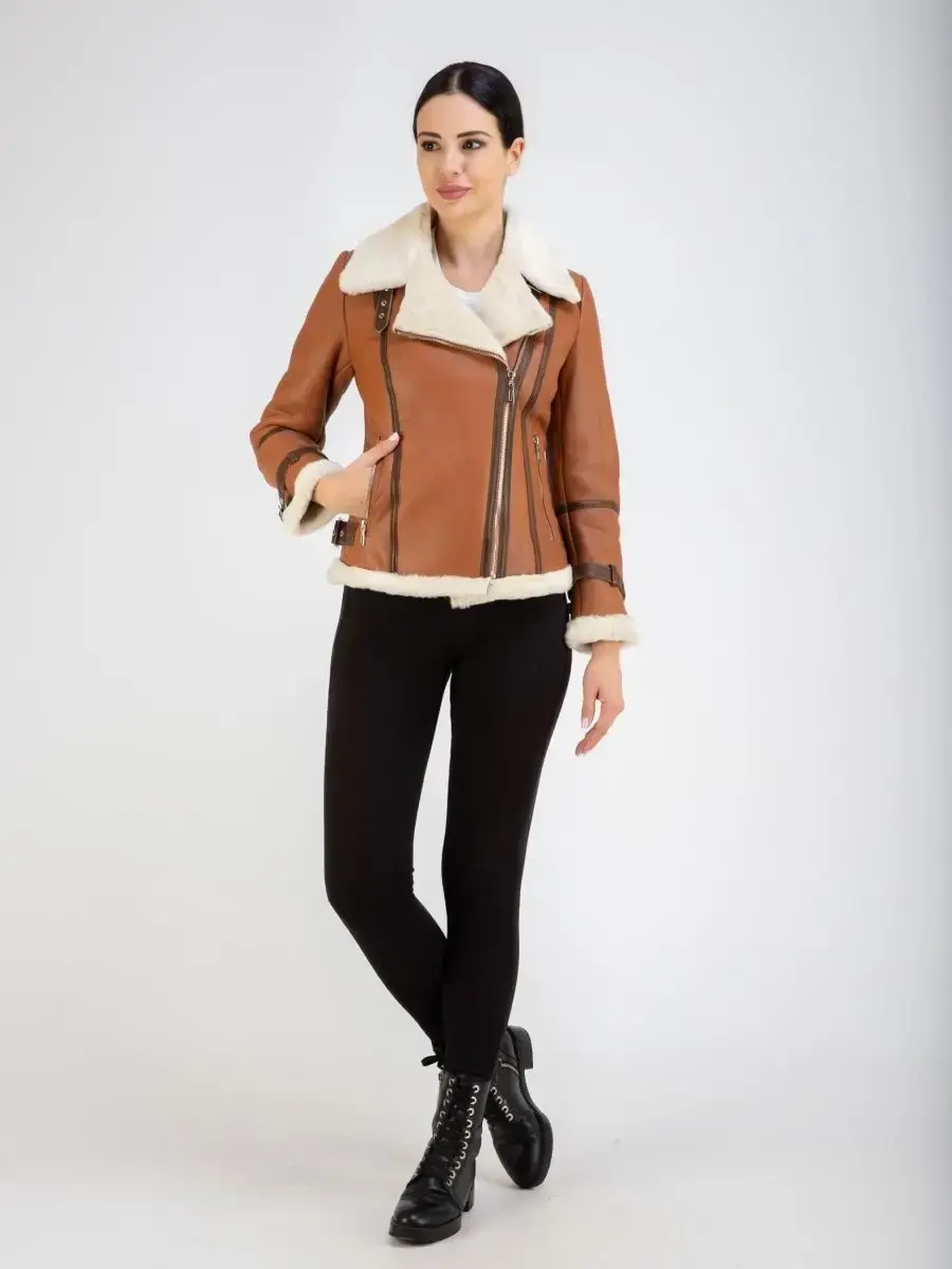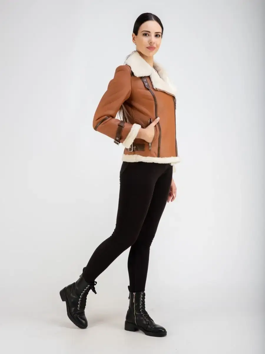 Дубленка женская авиатор короткая - стильная и современная модель из 100 % натуральной овчины. Укороченная модная куртка - дубленка женская натуральная авиатор или пилот очень эффектная, с одной стороны придает образу грубость и брутальность, а с другой подчёркивает женственный стиль. Качественная дубленка женская зимняя легко сочетается как с джинсами, так и с классическими брюками. Дубленка авиатор из натурального меха зимняя куртка с мехом - трендовая верхняя одежда для девушек и женщин. Дубленка авиатор женская зимняя с декоративными вставками из натуральной кожи имеет два кармана на молнии по бакам, застежка ассиметричная молния делает дубленку удобной и комфортной при носке.