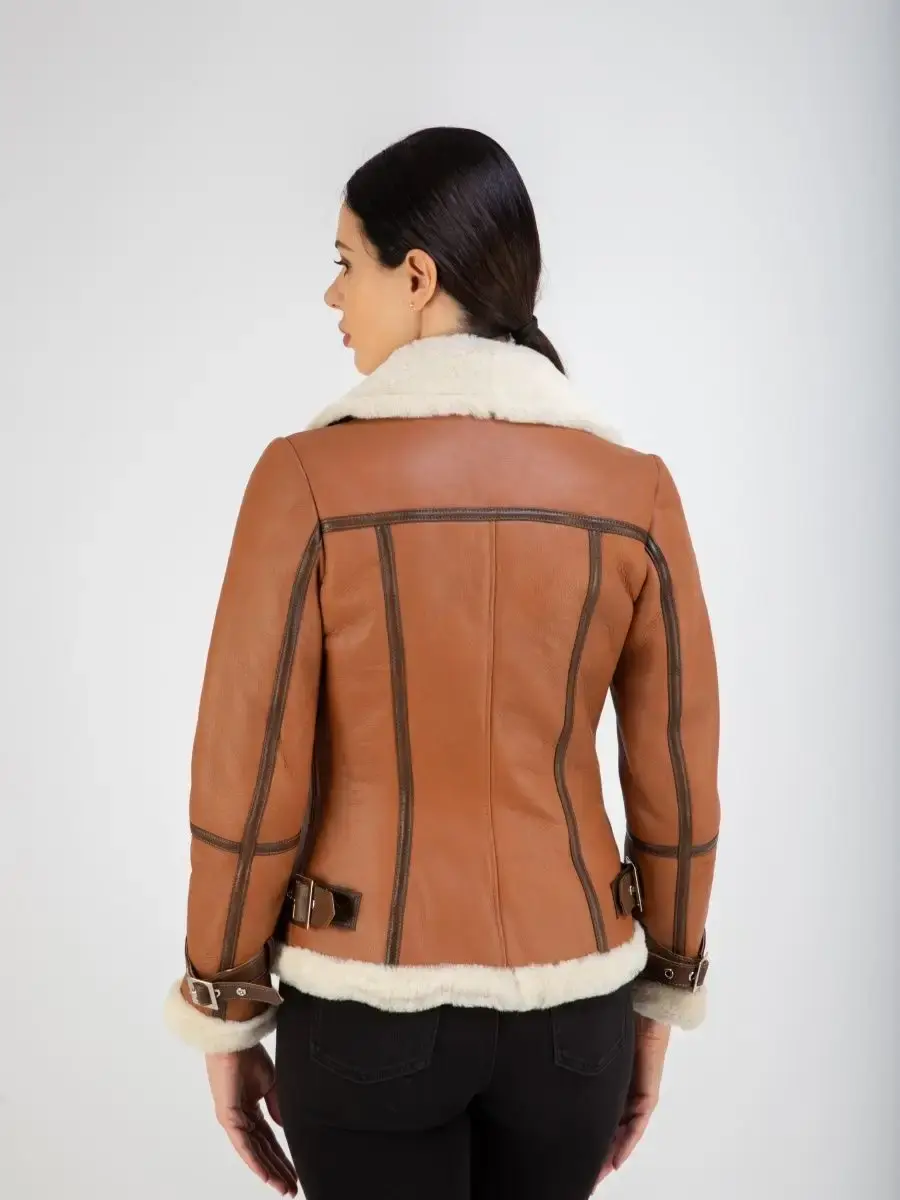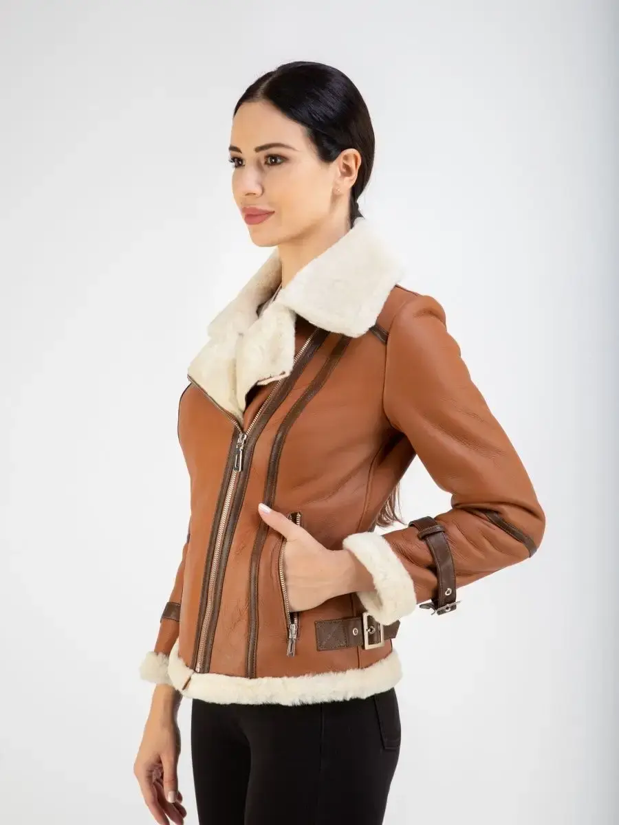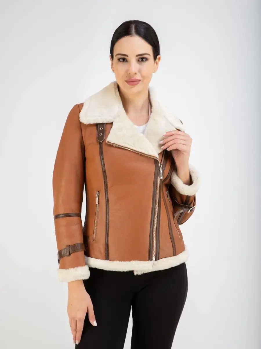 Дубленка женская авиатор короткая - стильная и современная модель из 100 % натуральной овчины. Укороченная модная куртка - дубленка женская натуральная авиатор или пилот очень эффектная, с одной стороны придает образу грубость и брутальность, а с другой подчёркивает женственный стиль. Качественная дубленка женская зимняя легко сочетается как с джинсами, так и с классическими брюками. Дубленка авиатор из натурального меха зимняя куртка с мехом - трендовая верхняя одежда для девушек и женщин. Дубленка авиатор женская зимняя с декоративными вставками из натуральной кожи имеет два кармана на молнии по бакам, застежка ассиметричная молния делает дубленку удобной и комфортной при носке.