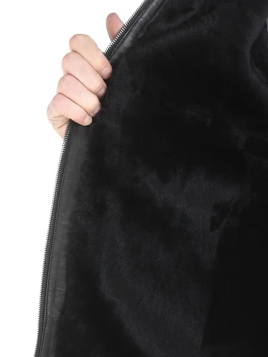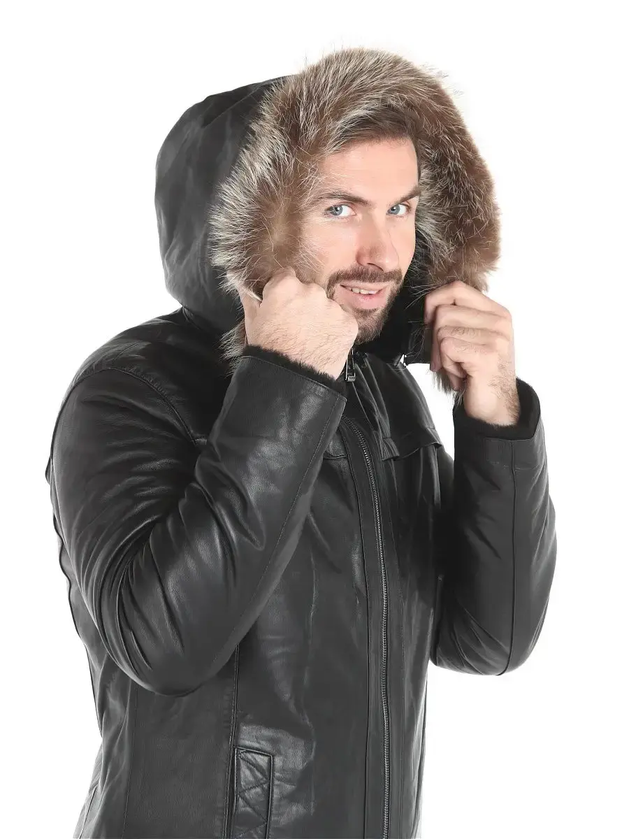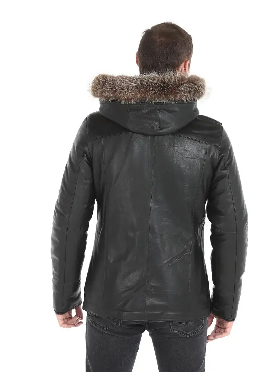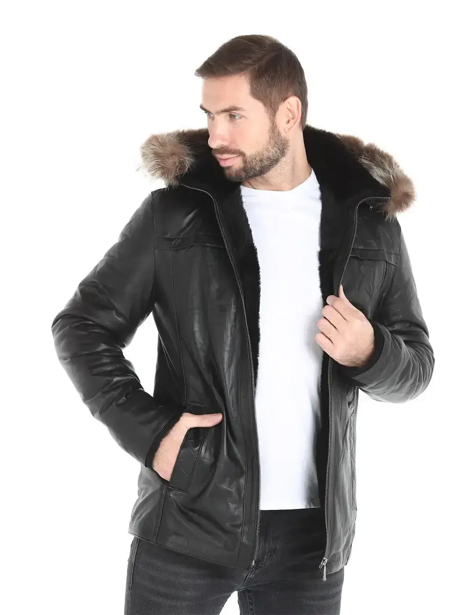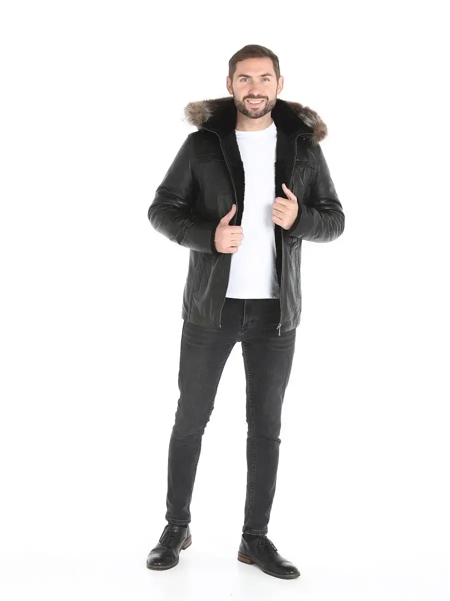 Мужская дубленка - зимняя куртка из 100% натуральной кожи ягненка с меховой подкладкой из овчины - мутон. Вставка на капюшоне из меха енота. Капюшон и мех съемный. Производство Турция.