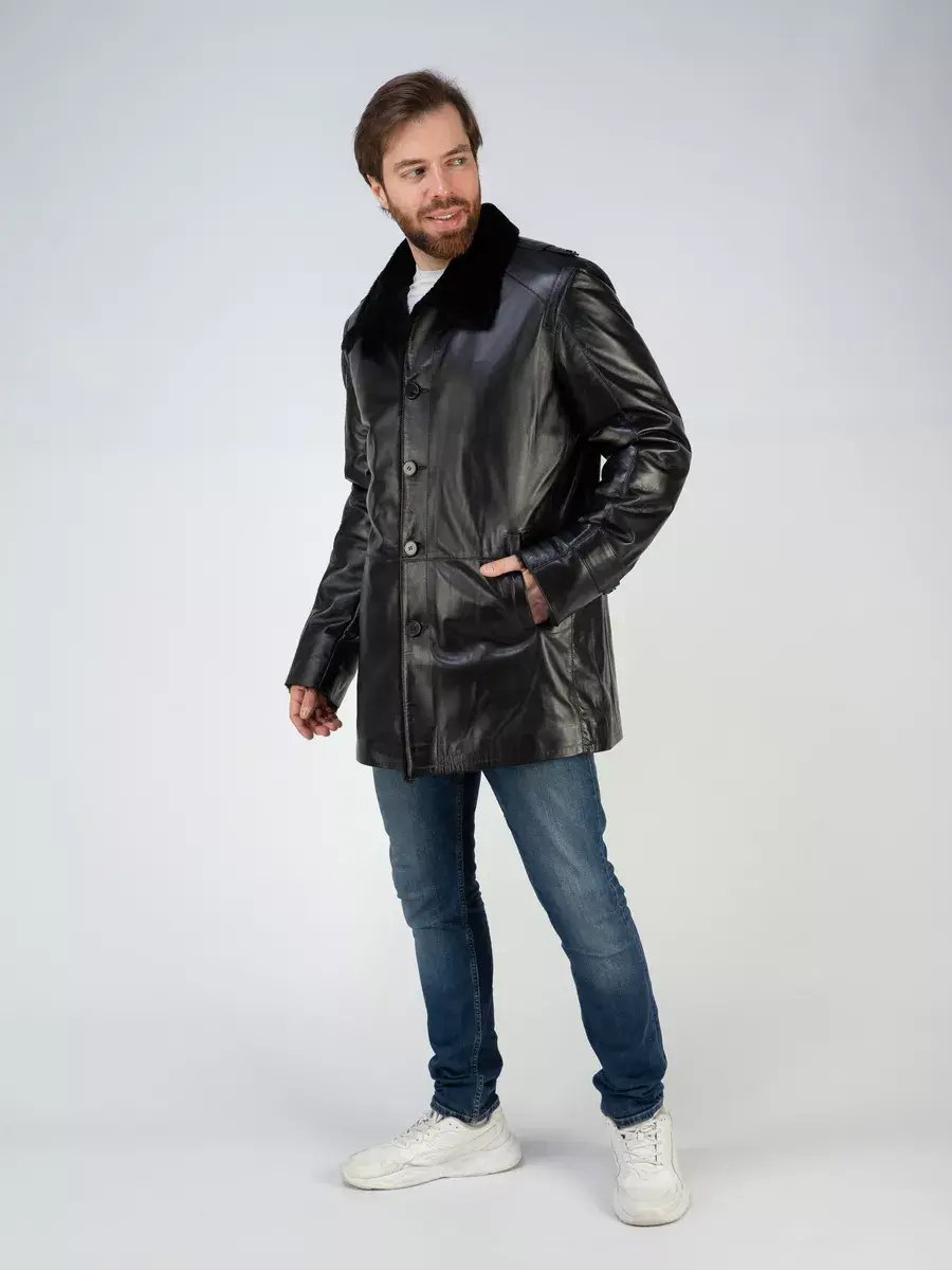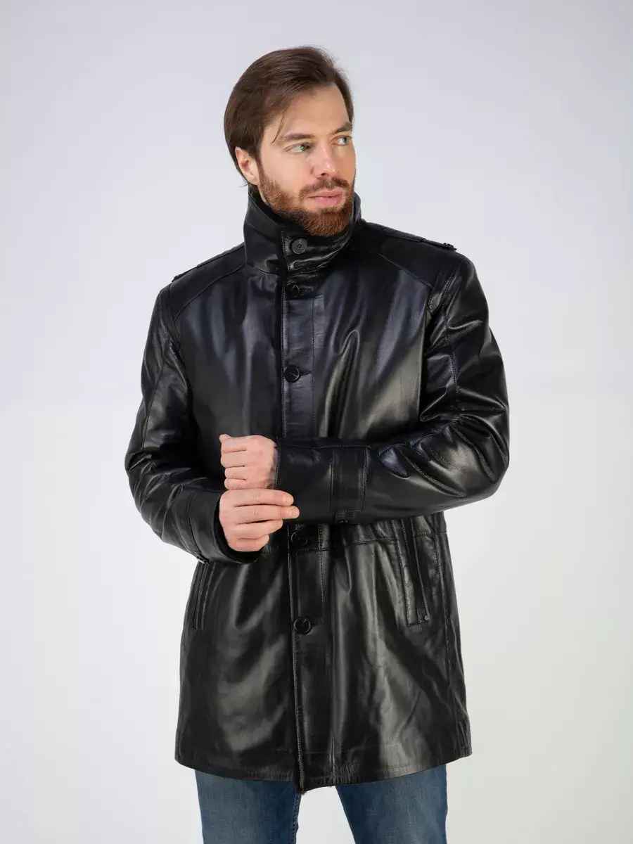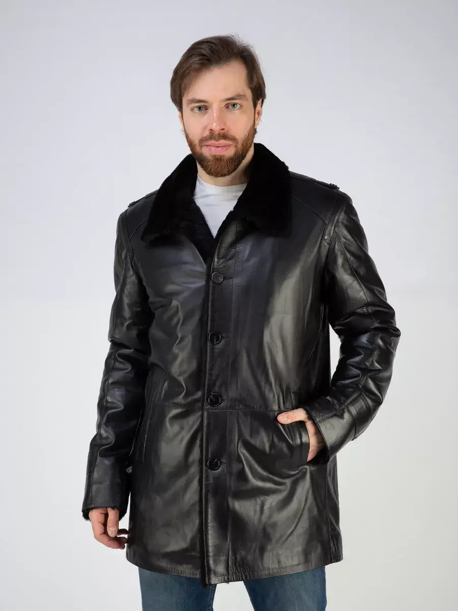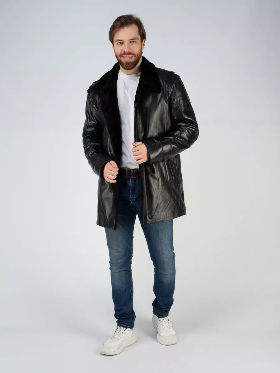 Стильный отложной - стойка воротник, гладкая кожа, прямой крой и декоративные погоны придают куртке - дубленке уникальность и изысканность, идеально впишется в деловой стиль и дополнит солидный образ мужчины или парня подростка, независимо от возраста. Застежка на пуговицах обеспечивает легкость и удобство в использовании, а прорезные карманы по бокам дополнительно увеличивают функциональность и практичность куртки средней длины.