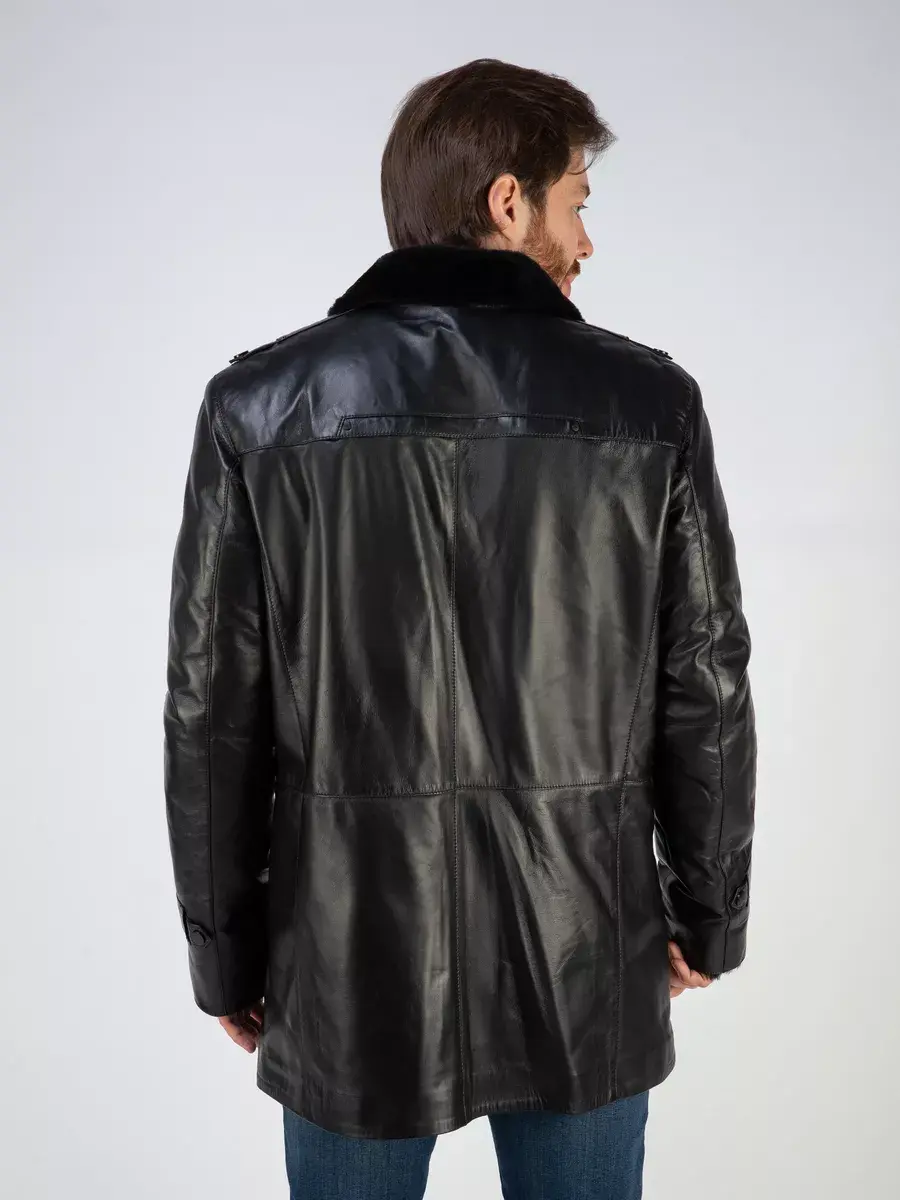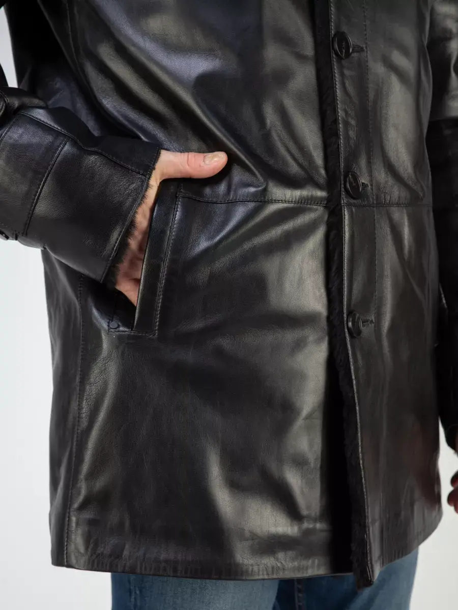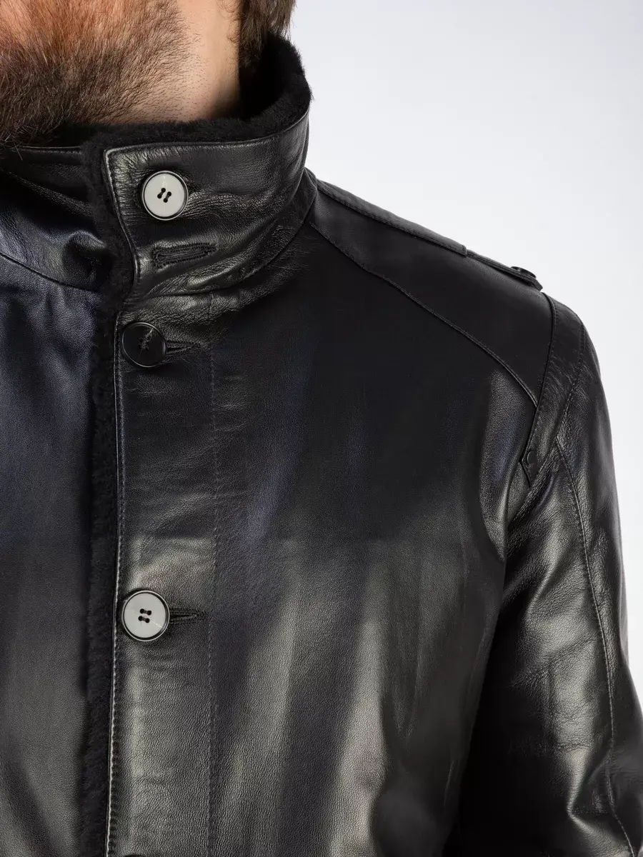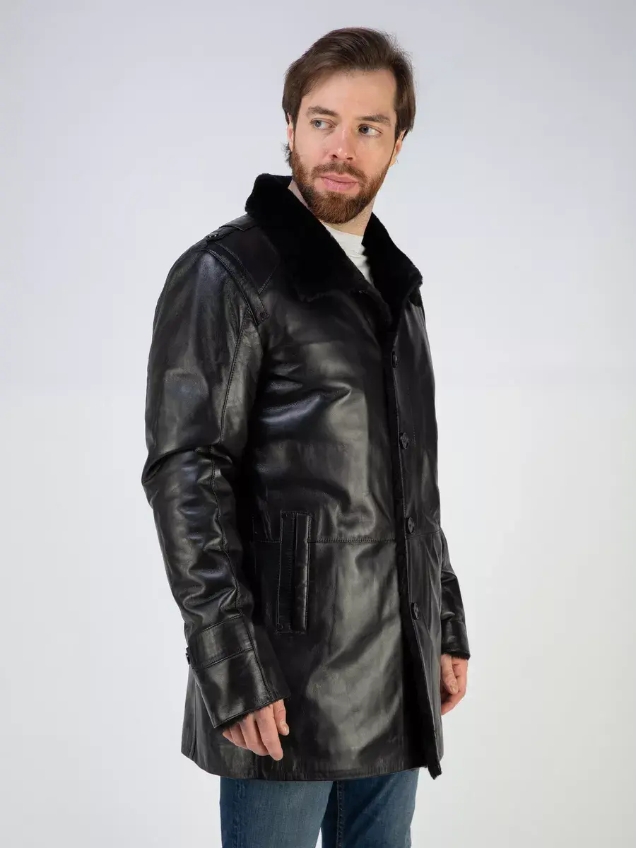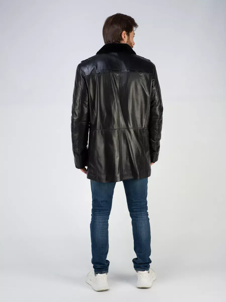 Стильный отложной - стойка воротник, гладкая кожа, прямой крой и декоративные погоны придают куртке - дубленке уникальность и изысканность, идеально впишется в деловой стиль и дополнит солидный образ мужчины или парня подростка, независимо от возраста. Застежка на пуговицах обеспечивает легкость и удобство в использовании, а прорезные карманы по бокам дополнительно увеличивают функциональность и практичность куртки средней длины.