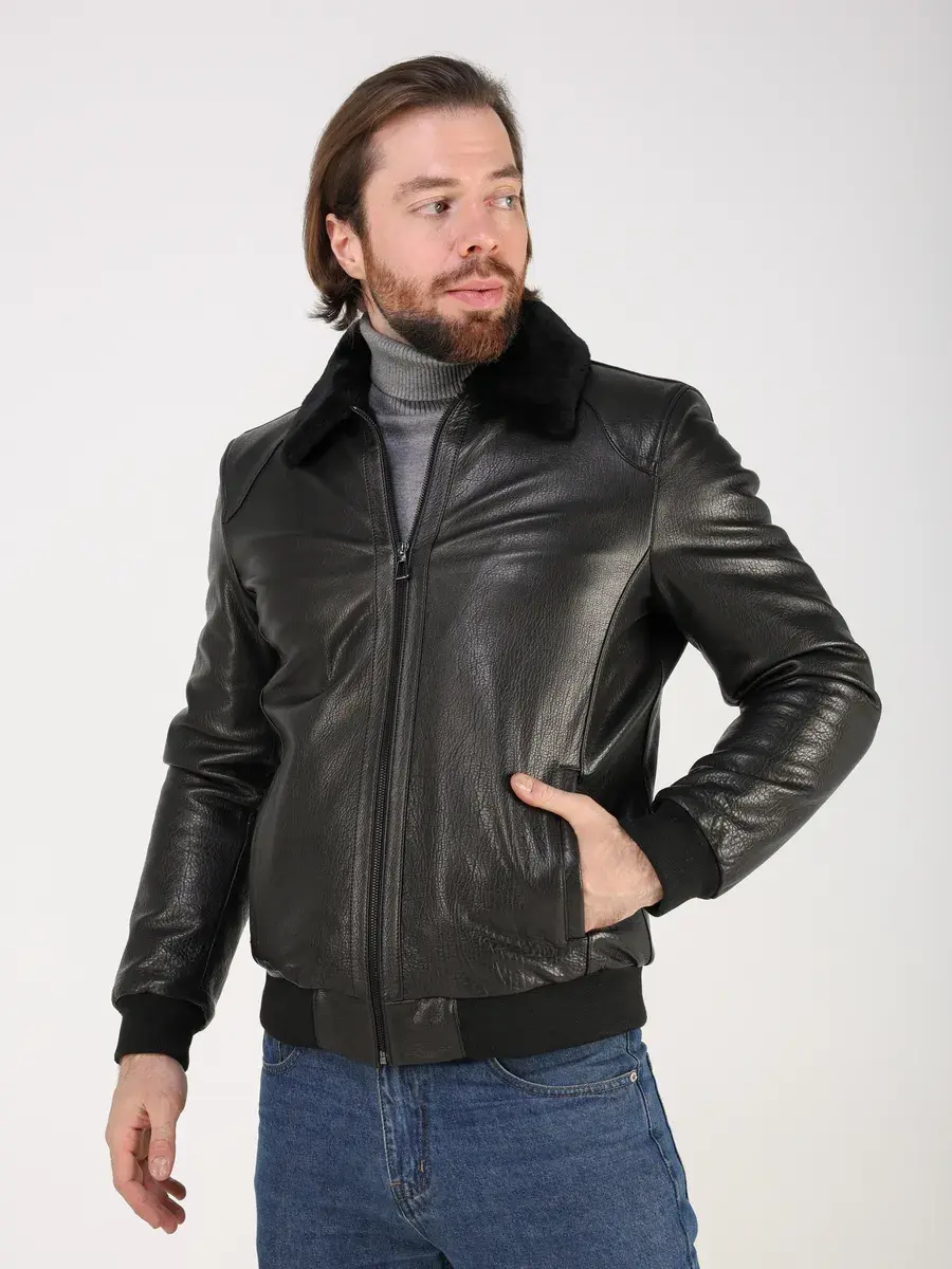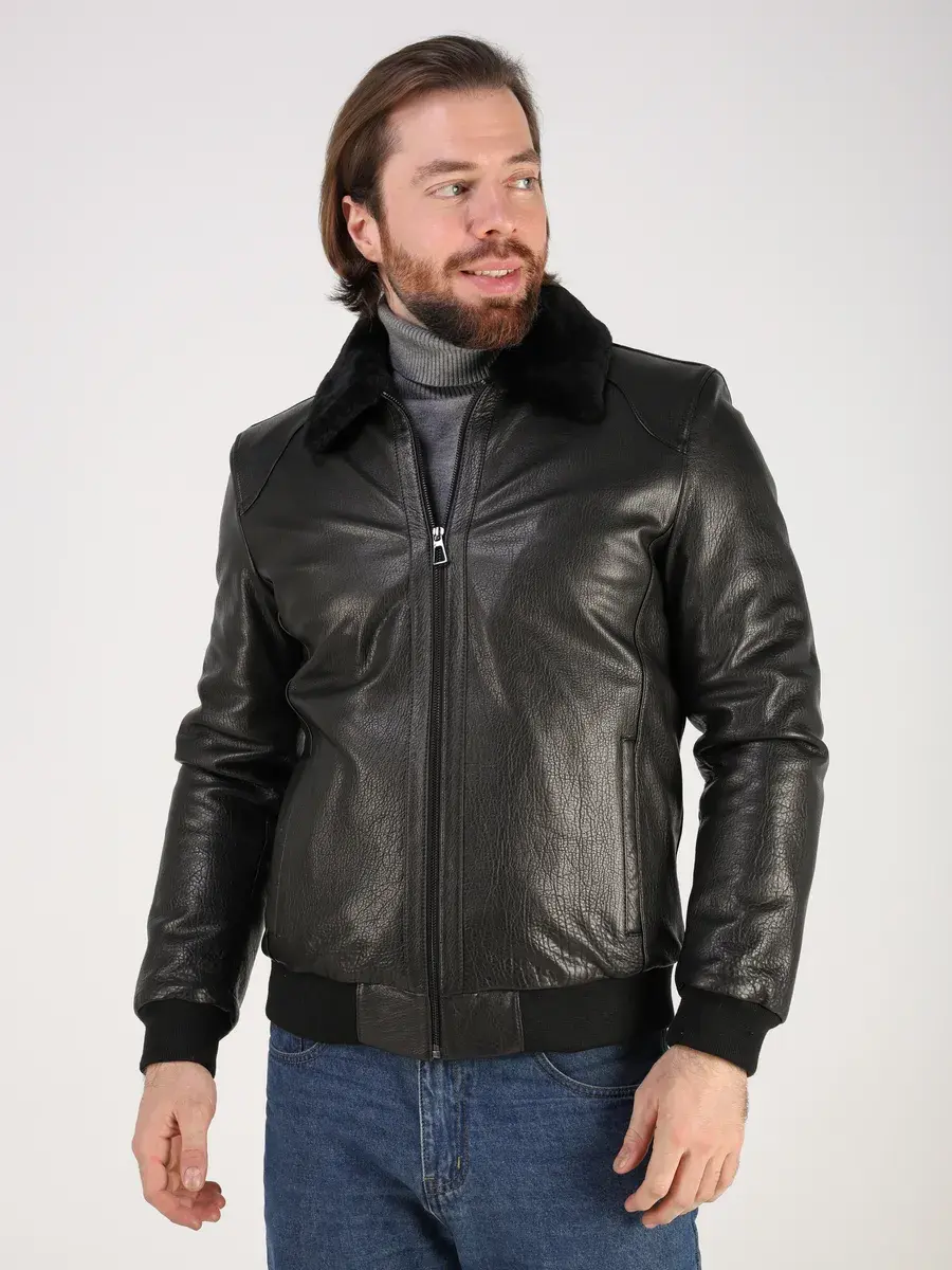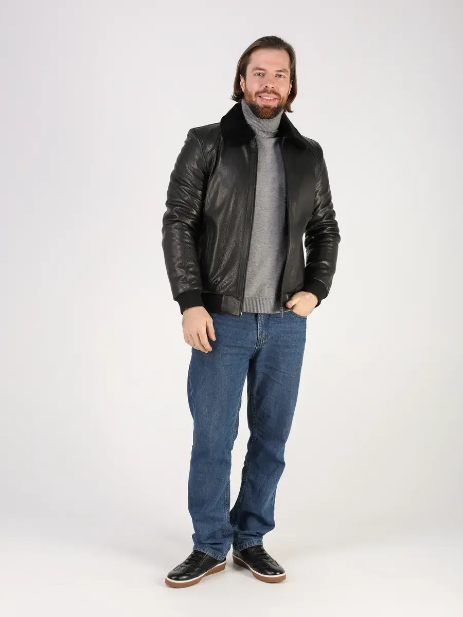 Стильный отложной - меховой воротник, прямой крой, дорогая фактурная кожа, трикотажные манжеты и утягивающий низ придают куртке - дубленке уникальность и изысканность, идеально впишется в деловой стиль и дополнит солидный образ мужчины или парня подростка, независимо от возраста. Дубленка мужская натуральная зимняя имеет застежку на молнии и прорезные карманы которые дополнительно увеличивают функциональность и практичность куртки средней длины. Рукава куртки утеплены синтепоном.
