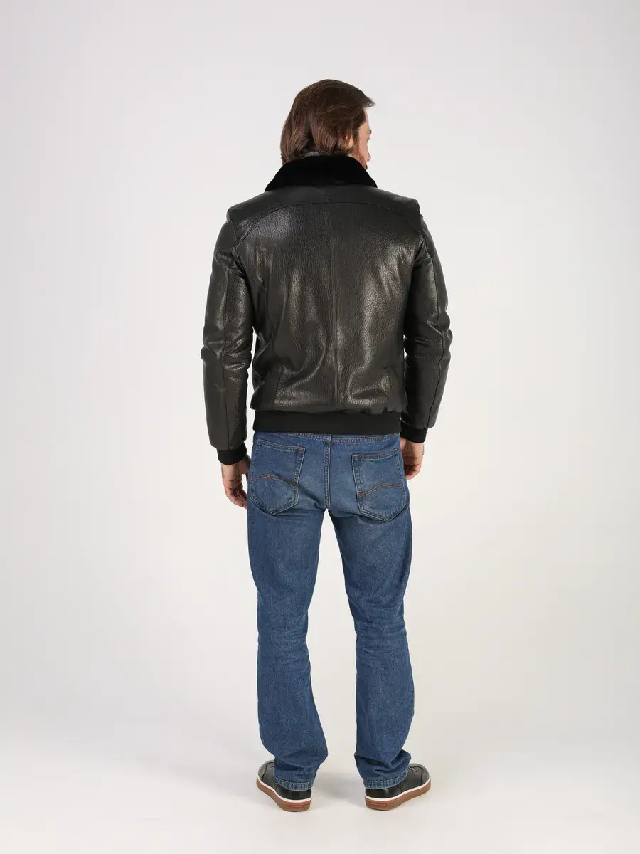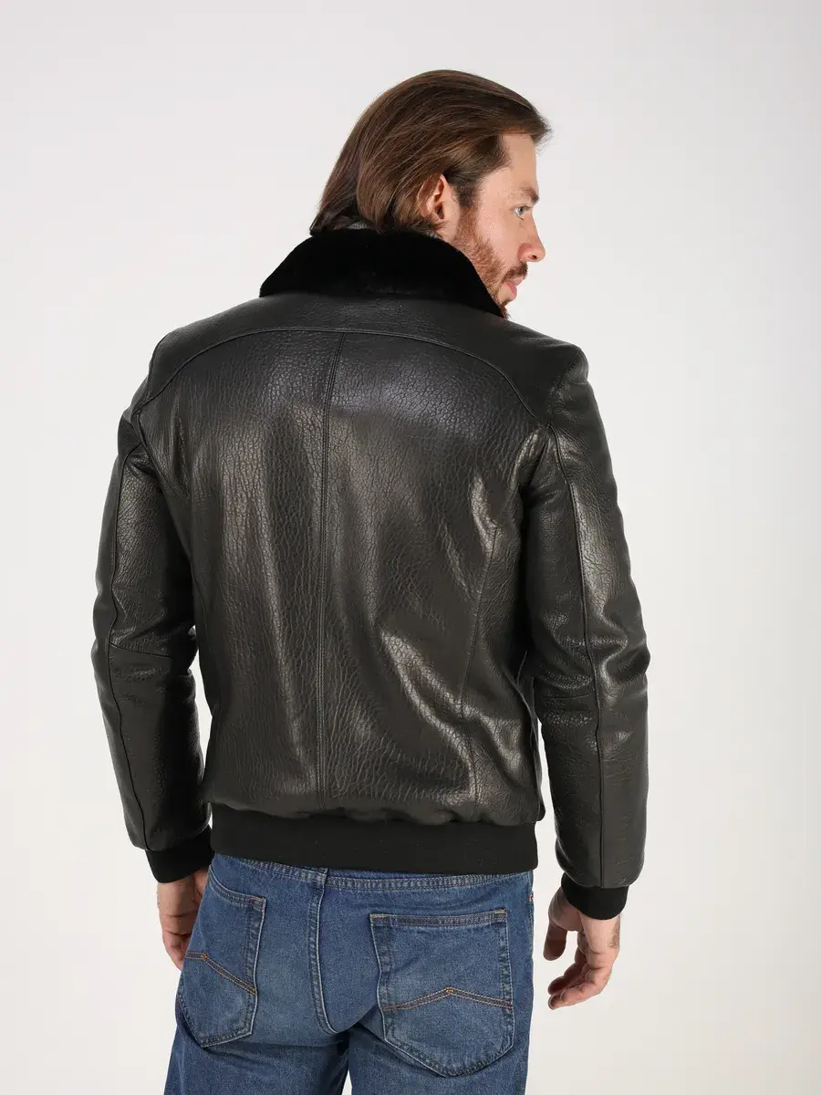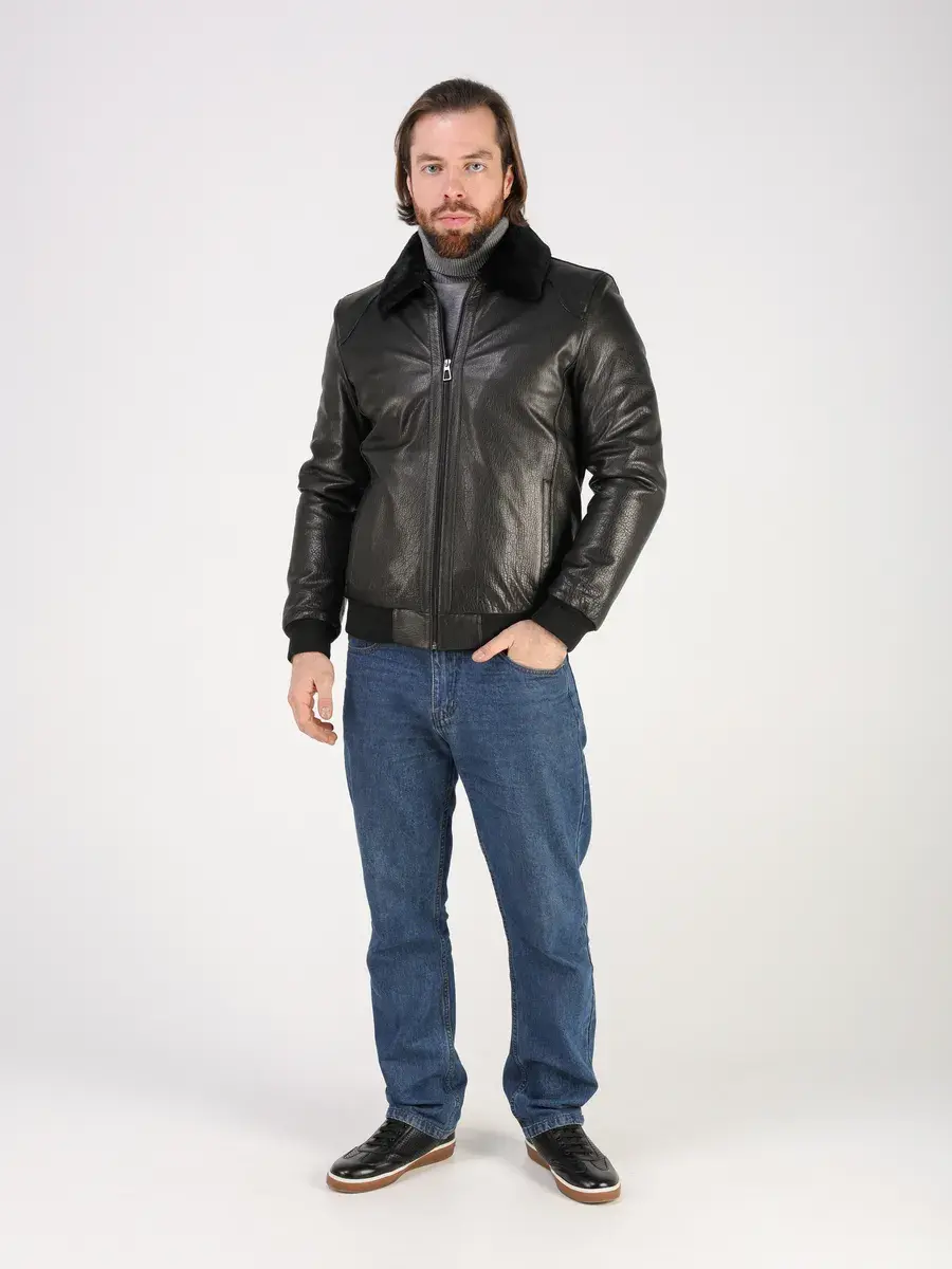 Стильный отложной - меховой воротник, прямой крой, дорогая фактурная кожа, трикотажные манжеты и утягивающий низ придают куртке - дубленке уникальность и изысканность, идеально впишется в деловой стиль и дополнит солидный образ мужчины или парня подростка, независимо от возраста. Дубленка мужская натуральная зимняя имеет застежку на молнии и прорезные карманы которые дополнительно увеличивают функциональность и практичность куртки средней длины. Рукава куртки утеплены синтепоном.