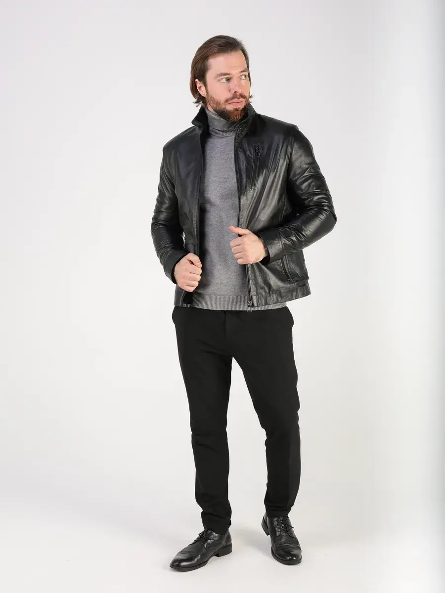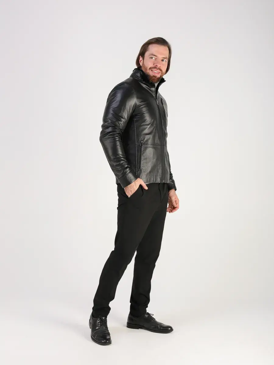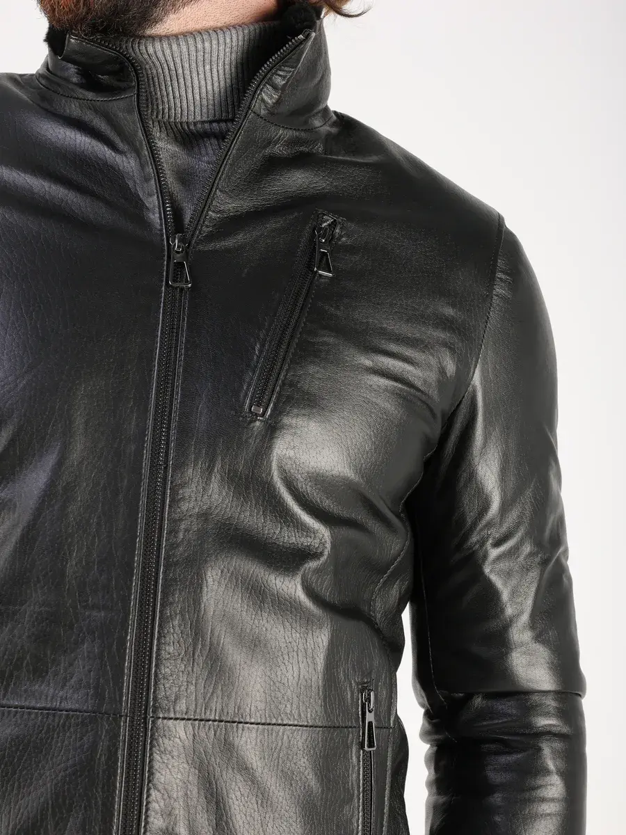 Стильный воротник стойка, прямой крой, дорогая фактурная кожа - джумбо, карман на груди придают куртке - дубленке уникальность и изысканность, идеально впишется в деловой стиль и дополнит солидный образ мужчины или парня подростка, независимо от возраста. Дубленка мужская натуральная зимняя имеет застежку на молнии и прорезные карманы которые дополнительно увеличивают функциональность и практичность куртки средней длины. Рукава куртки утеплены синтепоном, на рукавах трикотажный манжет.