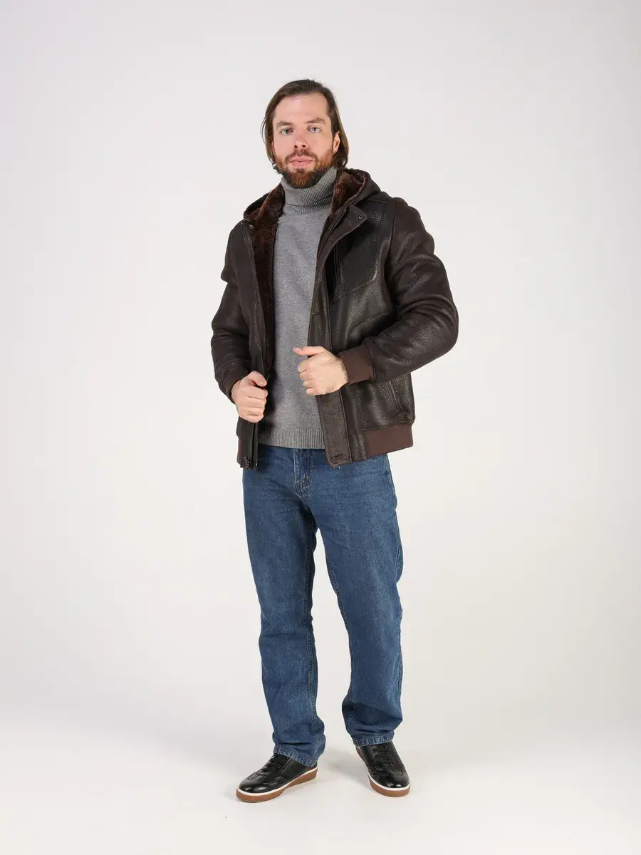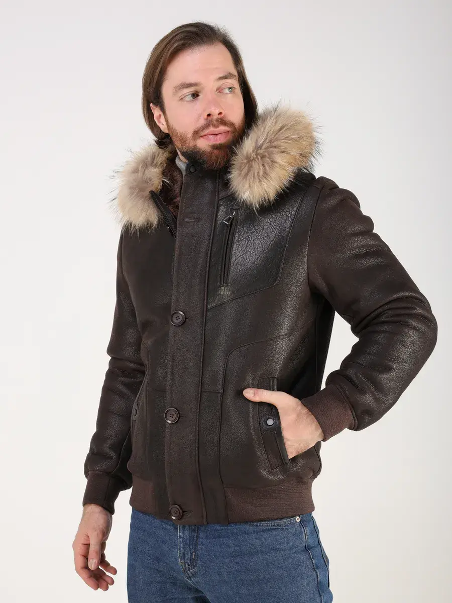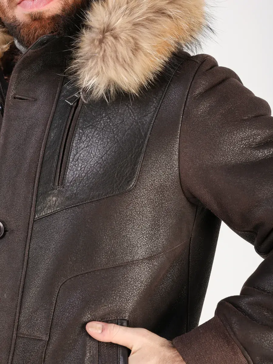 Съемная меховая опушка на капюшоне, прямой крой, фактура "крэк" и кожаные вставки придают куртке - дубленке уникальность и изысканность, идеально впишется в деловой стиль и дополнит солидный образ мужчины или подростка, независимо от возраста. Дубленка мужская натуральная зимняя имеет двойную застежку на молнии и пуговицы и прорезные карманы которые увеличивают функциональность куртки средней длины.