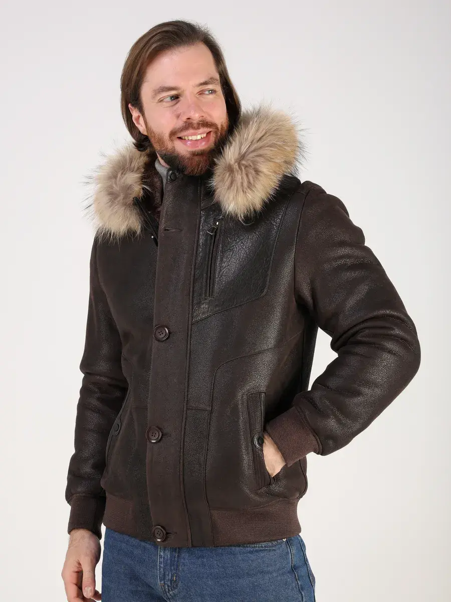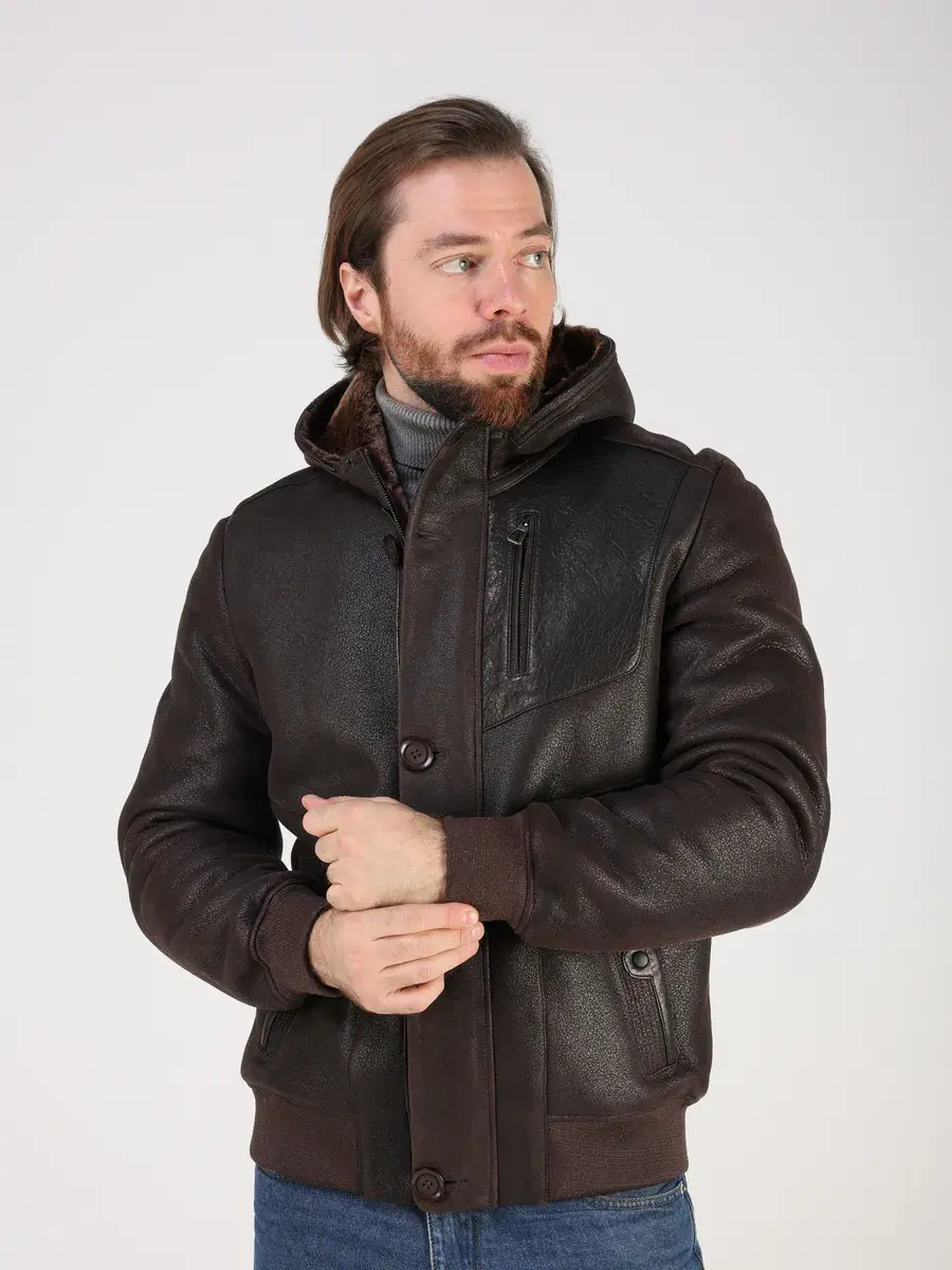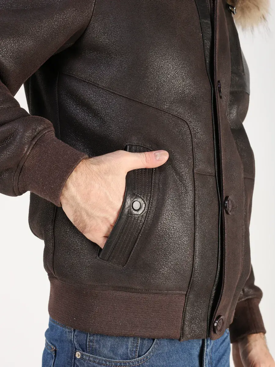 Съемная меховая опушка на капюшоне, прямой крой, фактура "крэк" и кожаные вставки придают куртке - дубленке уникальность и изысканность, идеально впишется в деловой стиль и дополнит солидный образ мужчины или подростка, независимо от возраста. Дубленка мужская натуральная зимняя имеет двойную застежку на молнии и пуговицы и прорезные карманы которые увеличивают функциональность куртки средней длины.