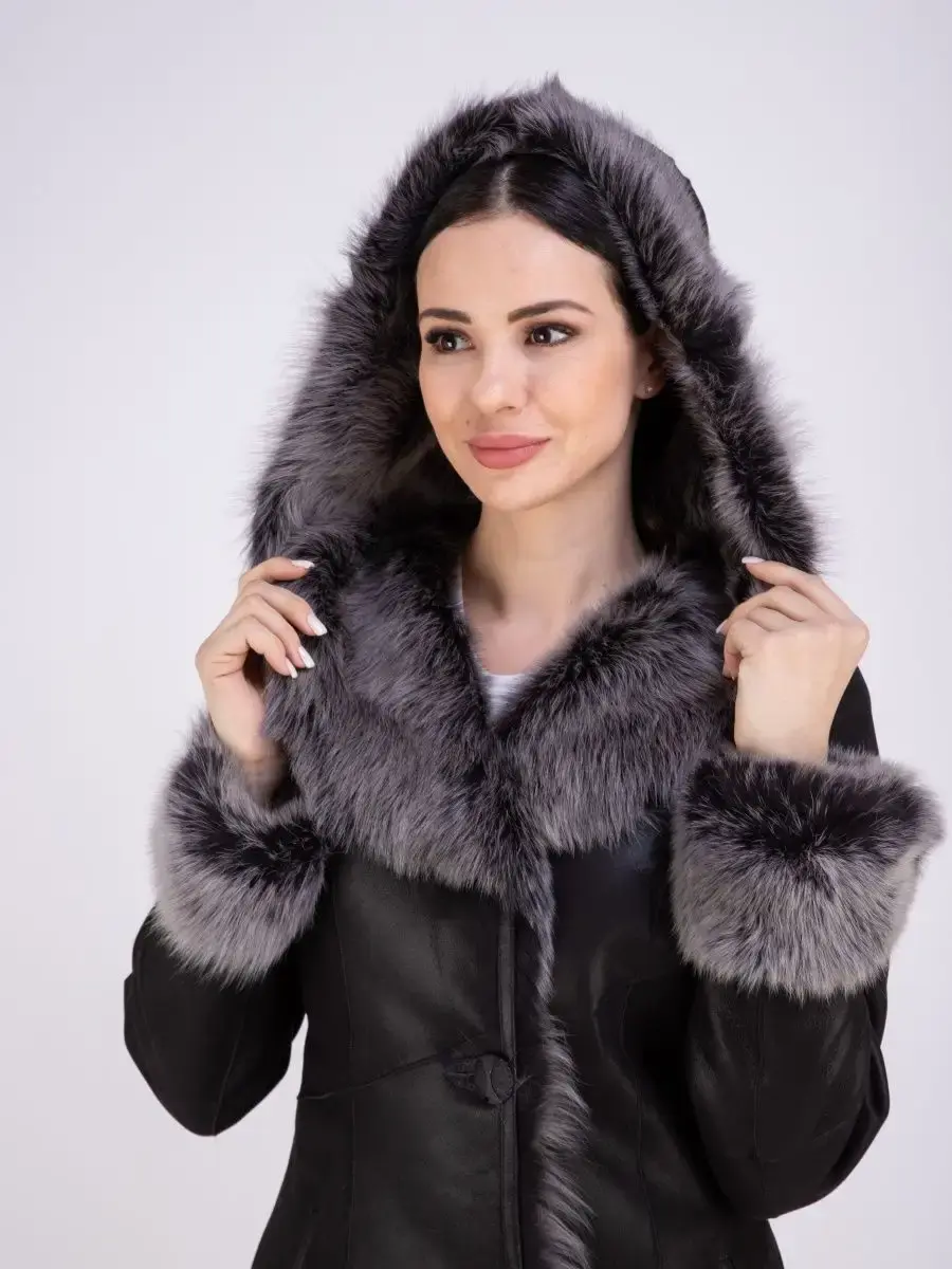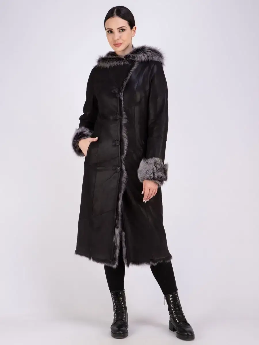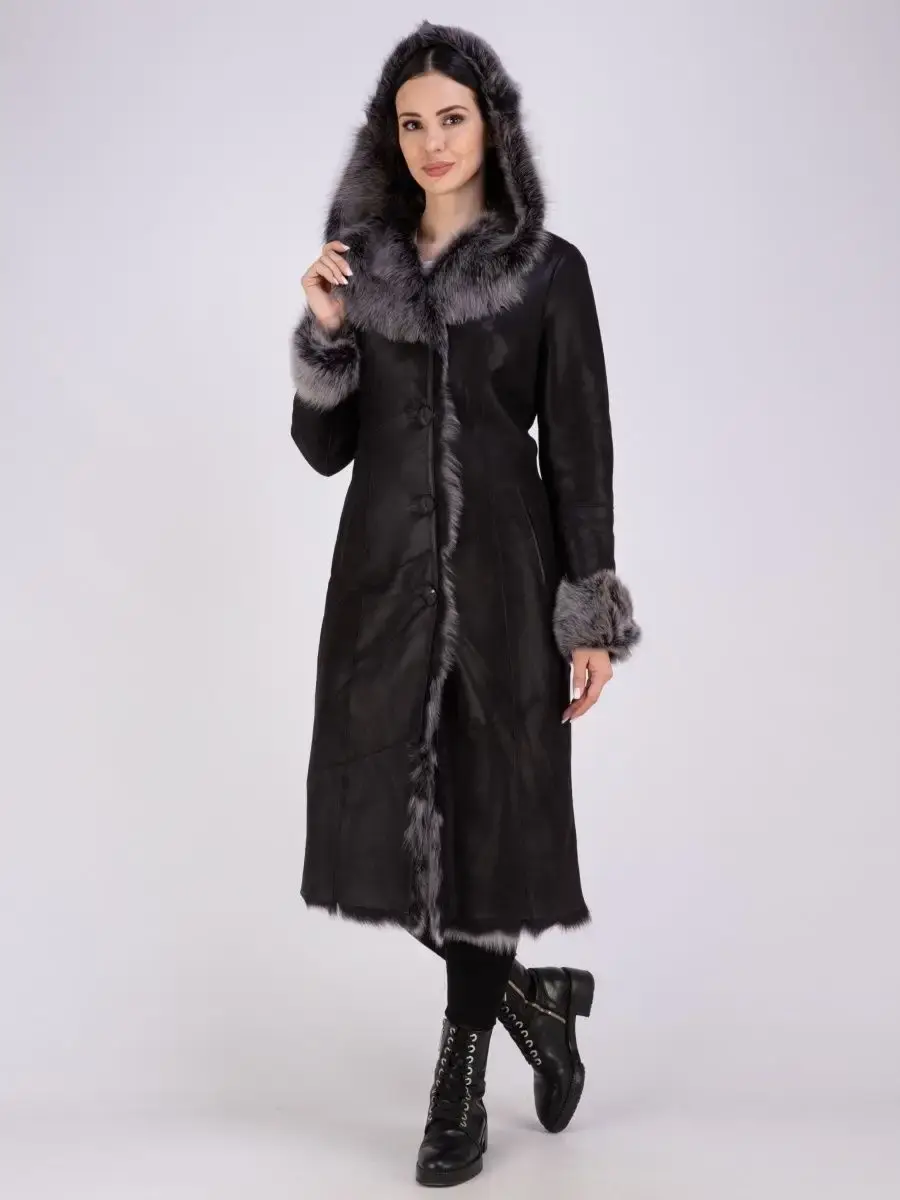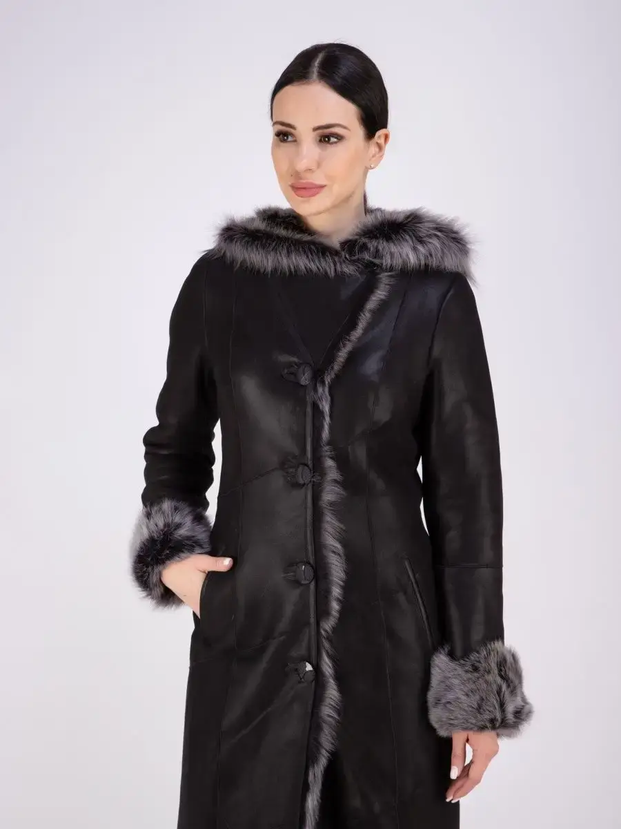 Стильная женская дубленка длинная из натуральной овчины - тоскана с объемным капюшоном. Дубленка женская натуральная приталенного кроя и прорезными карманами. В качестве застежки предусмотрена пуговицы.