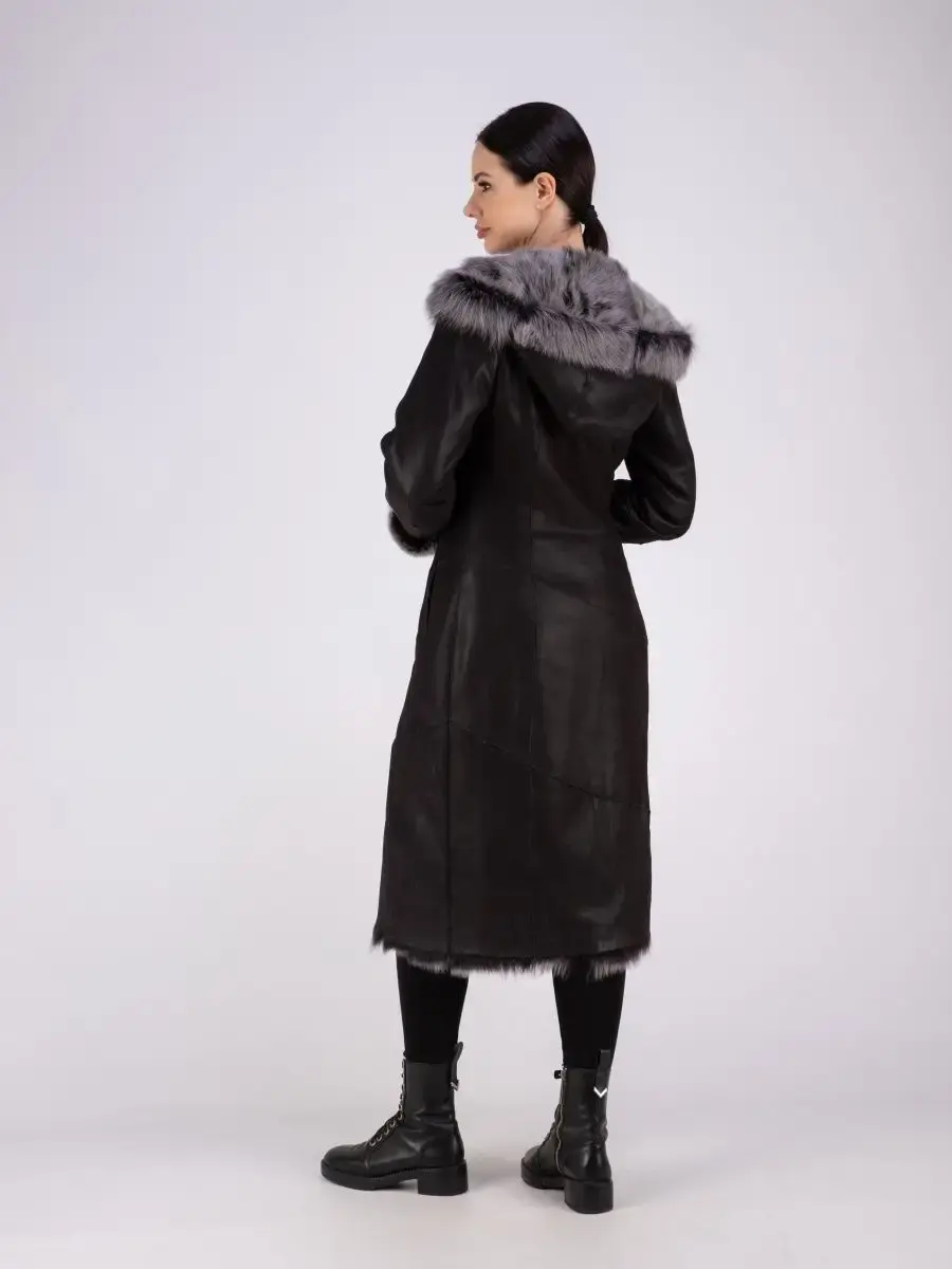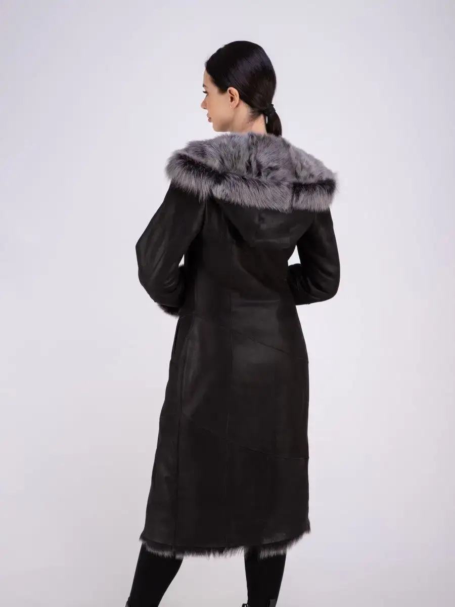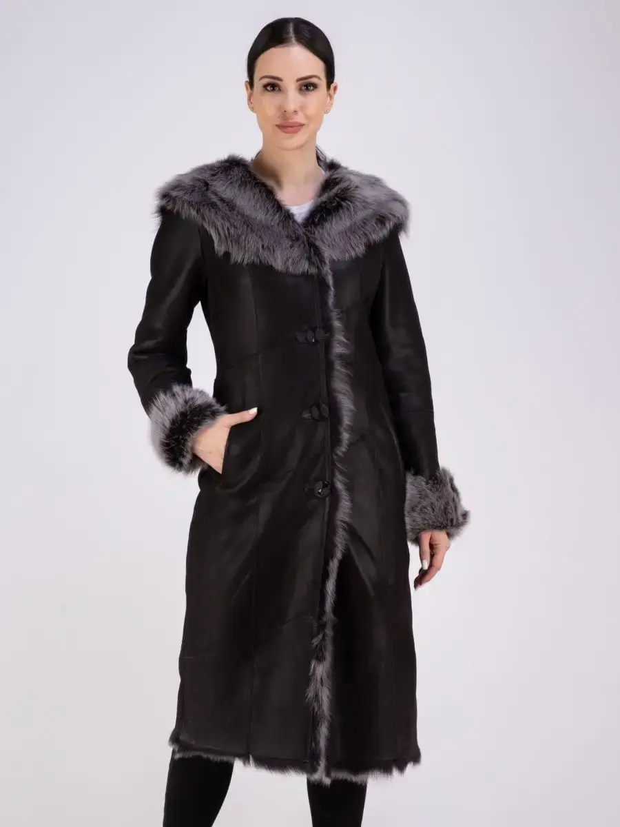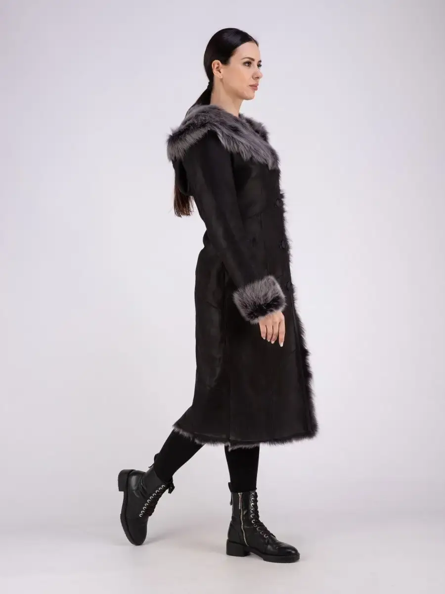 Стильная женская дубленка длинная из натуральной овчины - тоскана с объемным капюшоном. Дубленка женская натуральная приталенного кроя и прорезными карманами. В качестве застежки предусмотрена пуговицы.