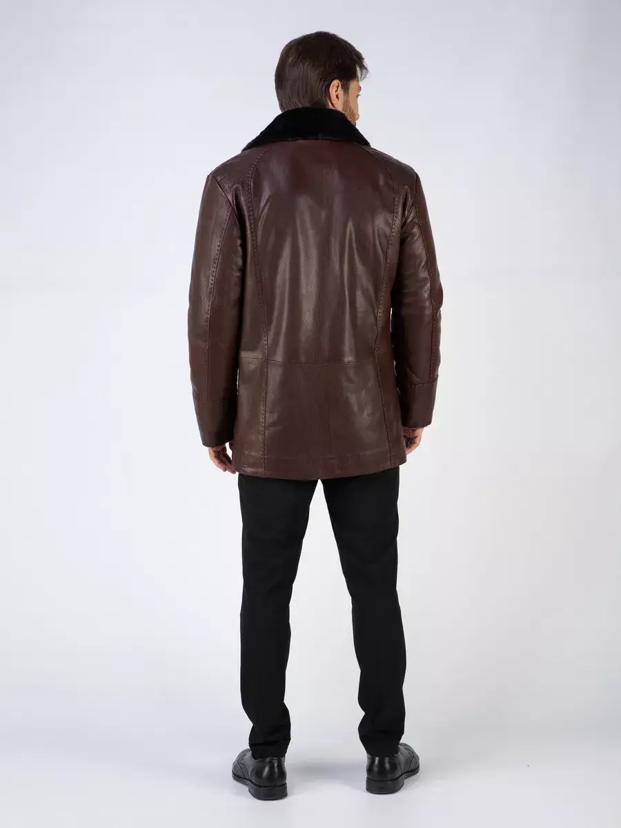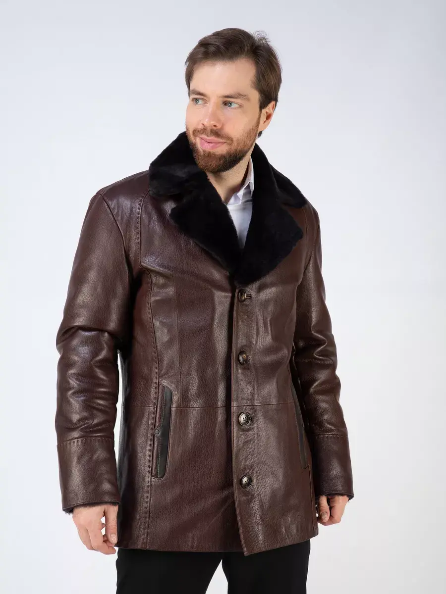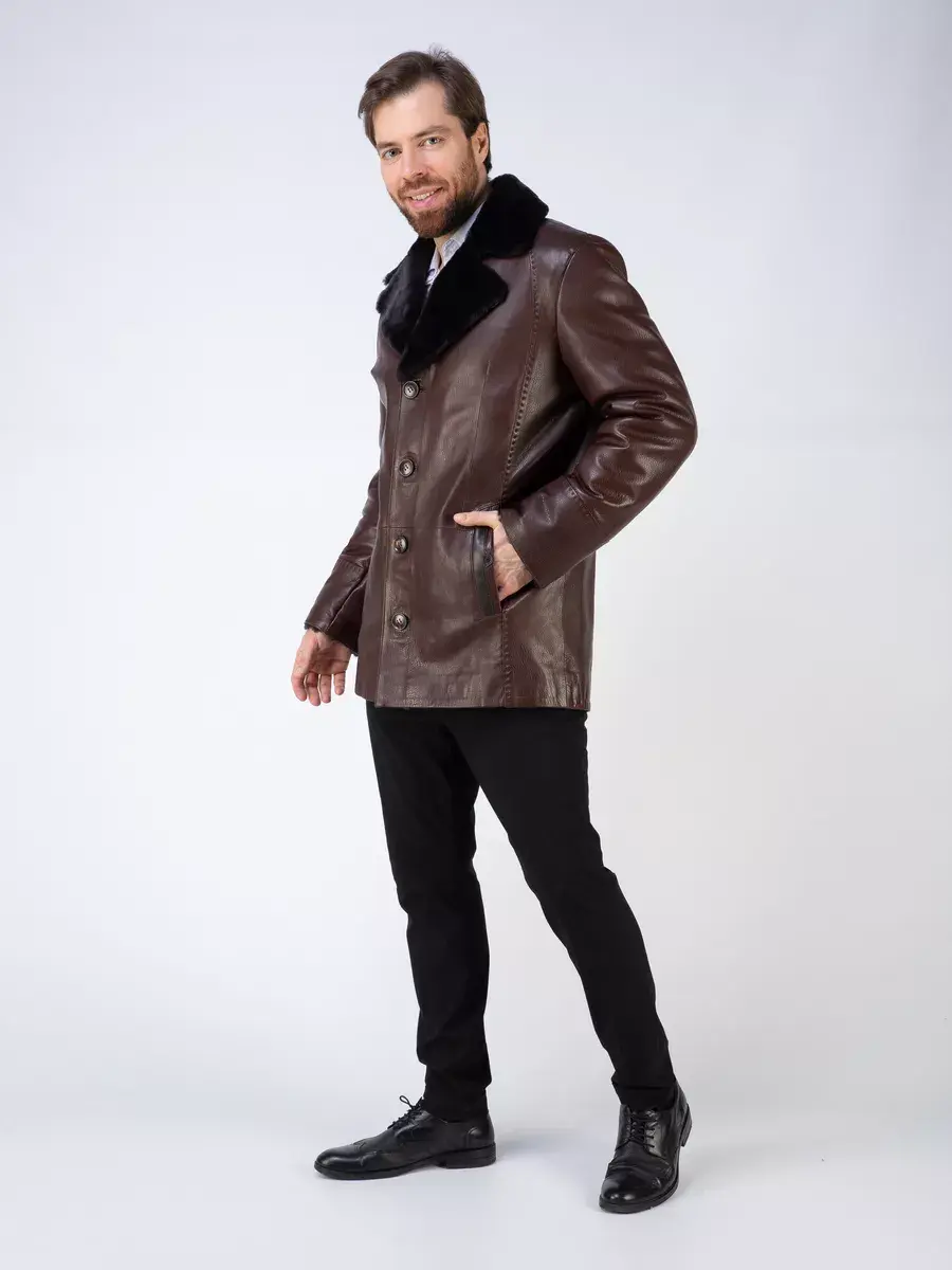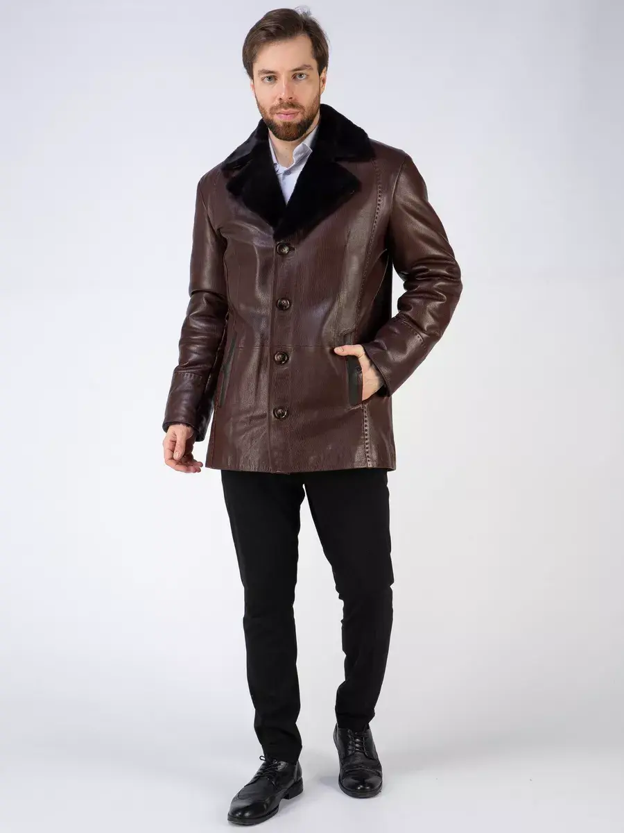 Классическая дубленка мужская натуральная зимняя из меха овчина. Мужская дубленка зимняя выполненая из натуральной фактурной кожи ягненка с меховым подкладом овчина. Дубленка мужская зимняя производство Турция, в качестве застежки пуговицы, английский воротник, декоративные строчки и вставки на карманах, карманы прорезные, рукава на синтепоне с меховым манжетом. Длина по спинке 85см.