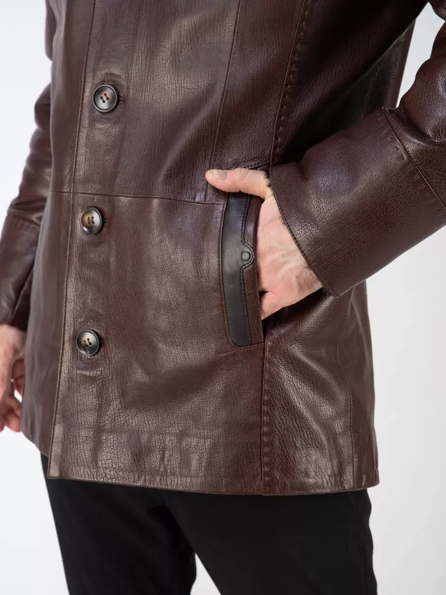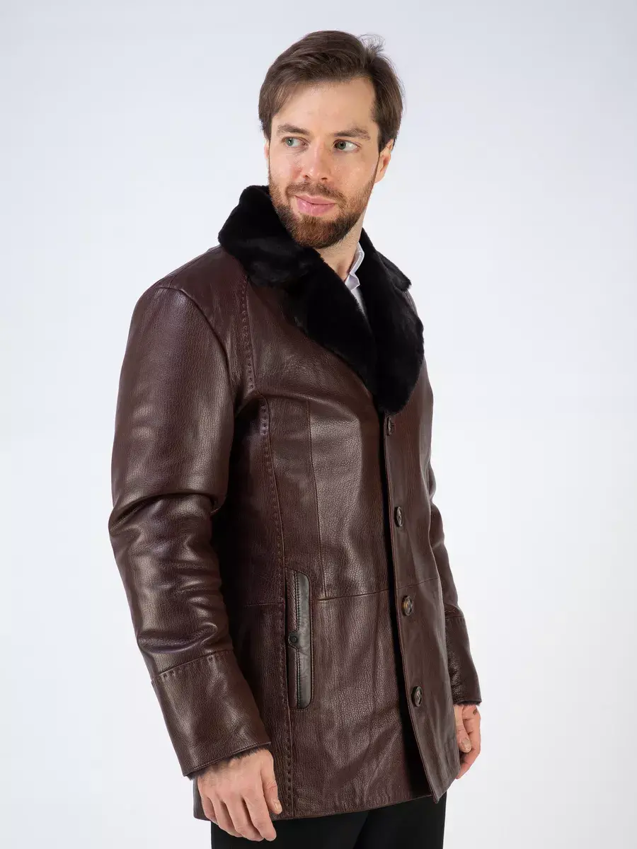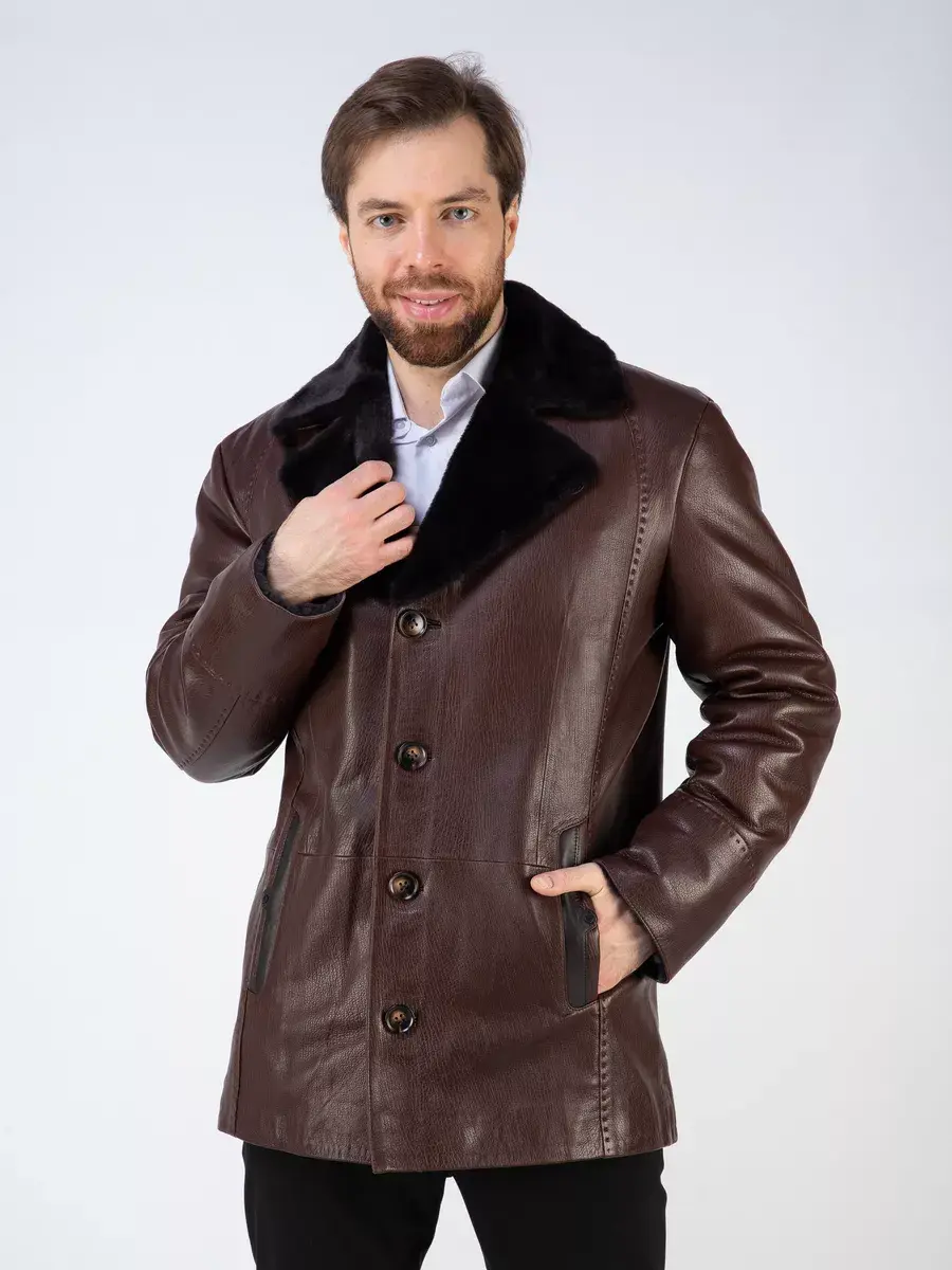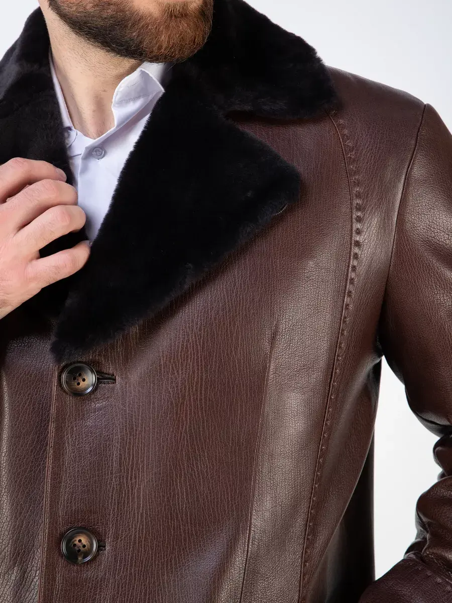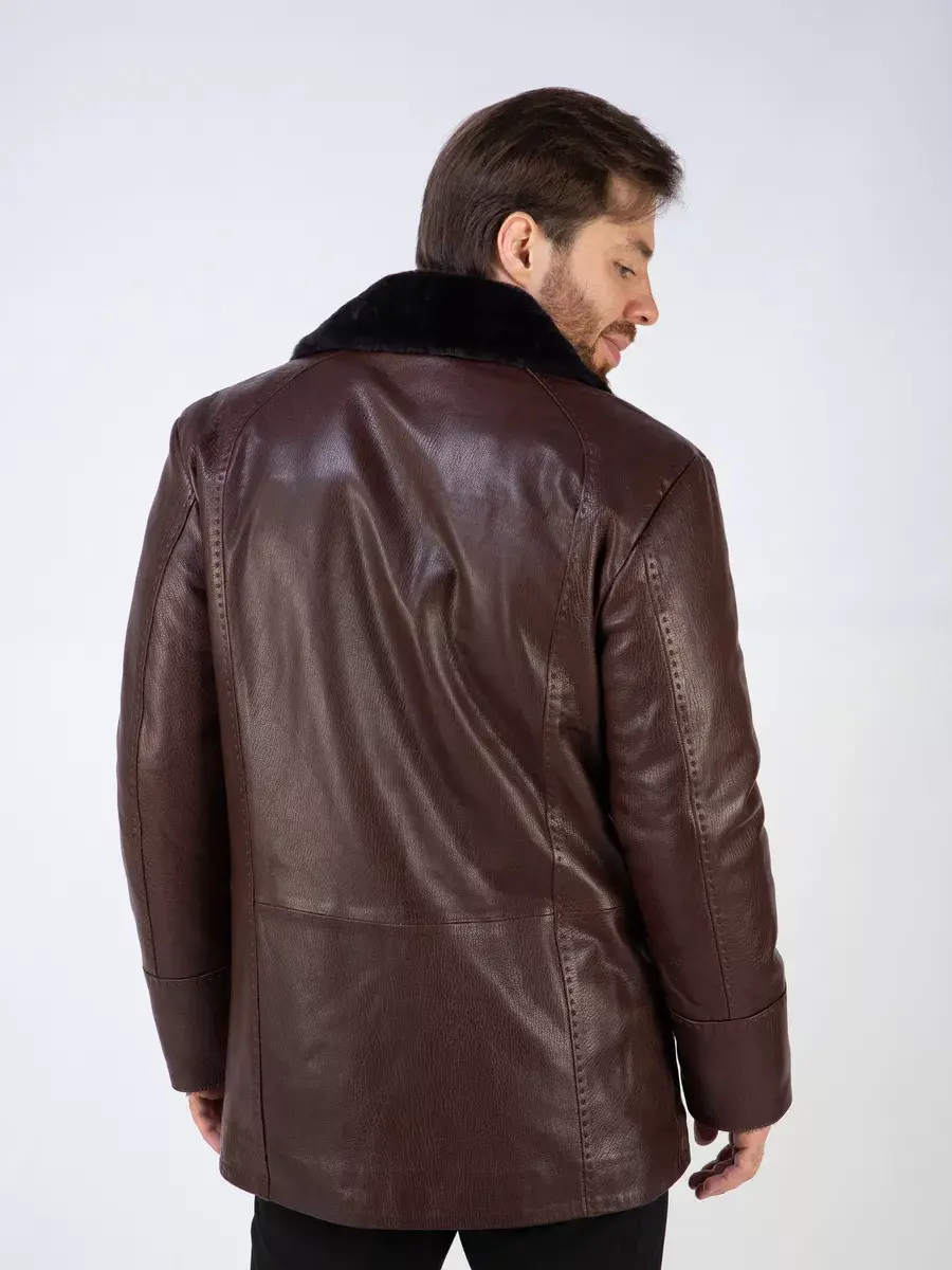 Классическая дубленка мужская натуральная зимняя из меха овчина. Мужская дубленка зимняя выполненая из натуральной фактурной кожи ягненка с меховым подкладом овчина. Дубленка мужская зимняя производство Турция, в качестве застежки пуговицы, английский воротник, декоративные строчки и вставки на карманах, карманы прорезные, рукава на синтепоне с меховым манжетом. Длина по спинке 85см.