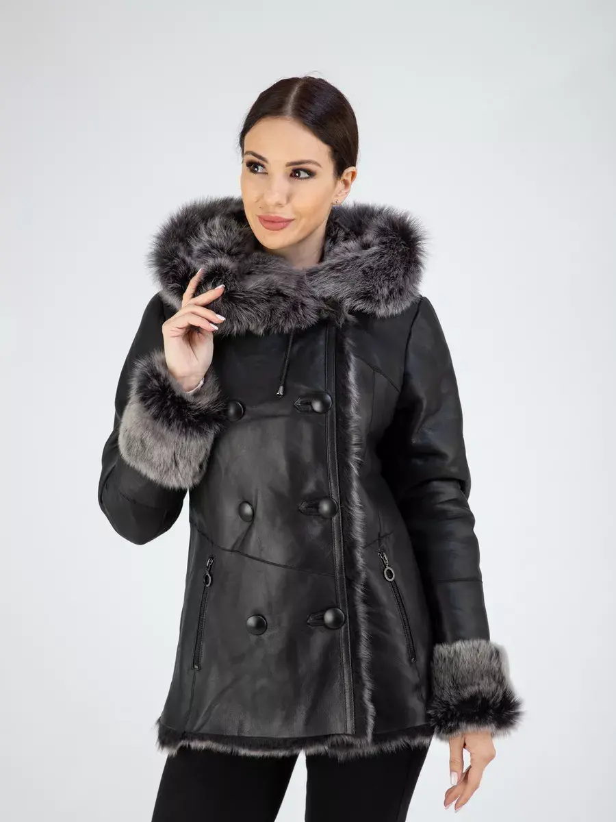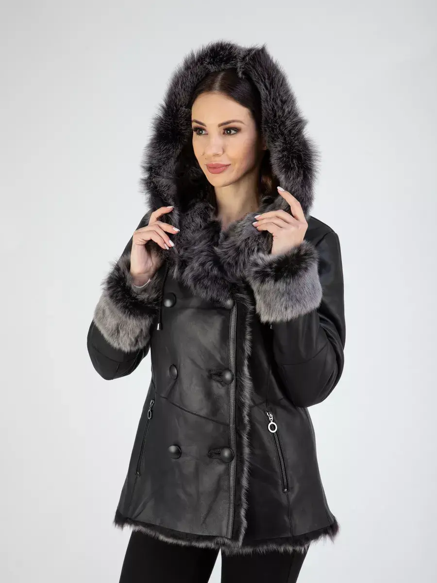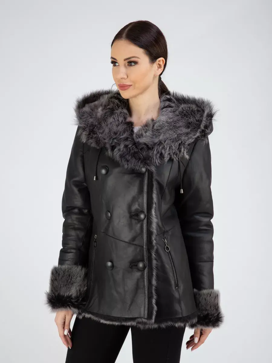 двубортная, дубленка женская зимняя натуральная, объемный капюшон
