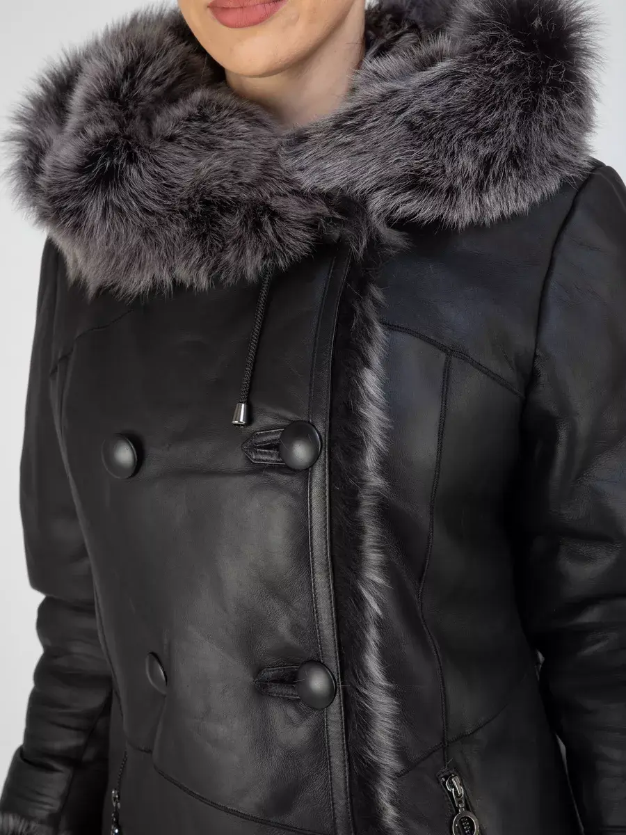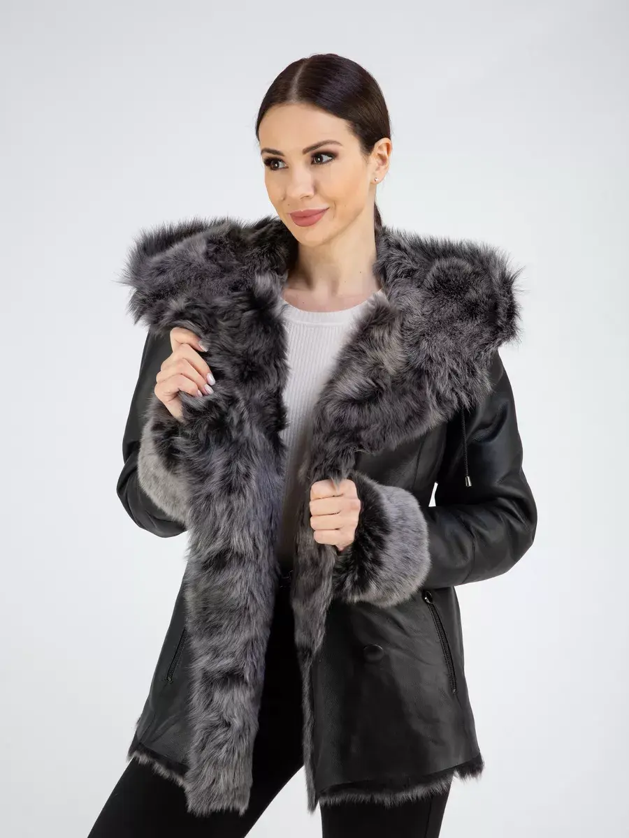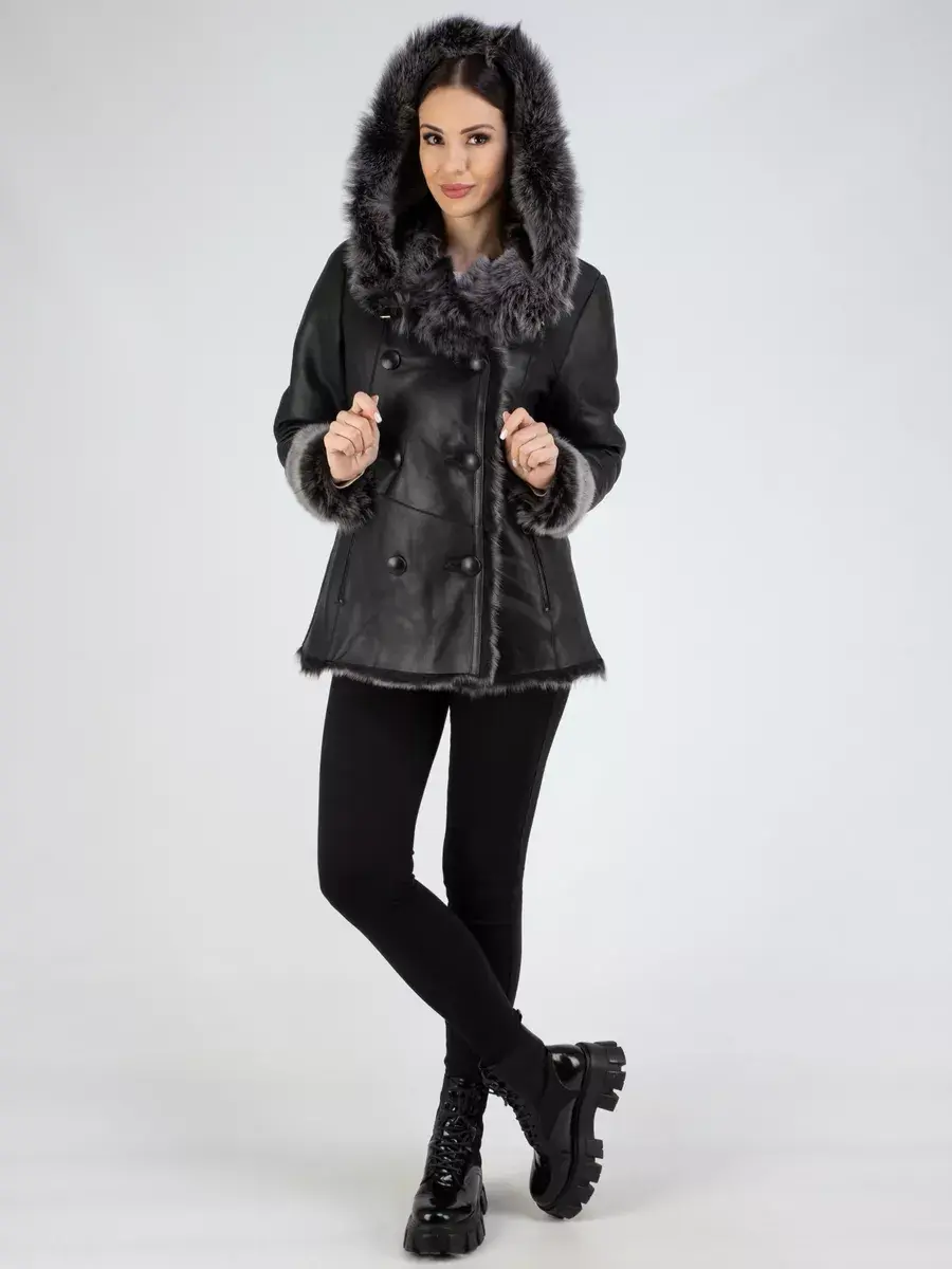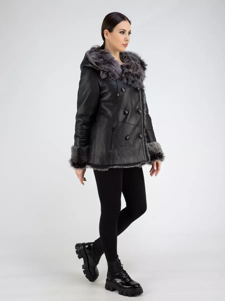 двубортная, дубленка женская зимняя натуральная, объемный капюшон
