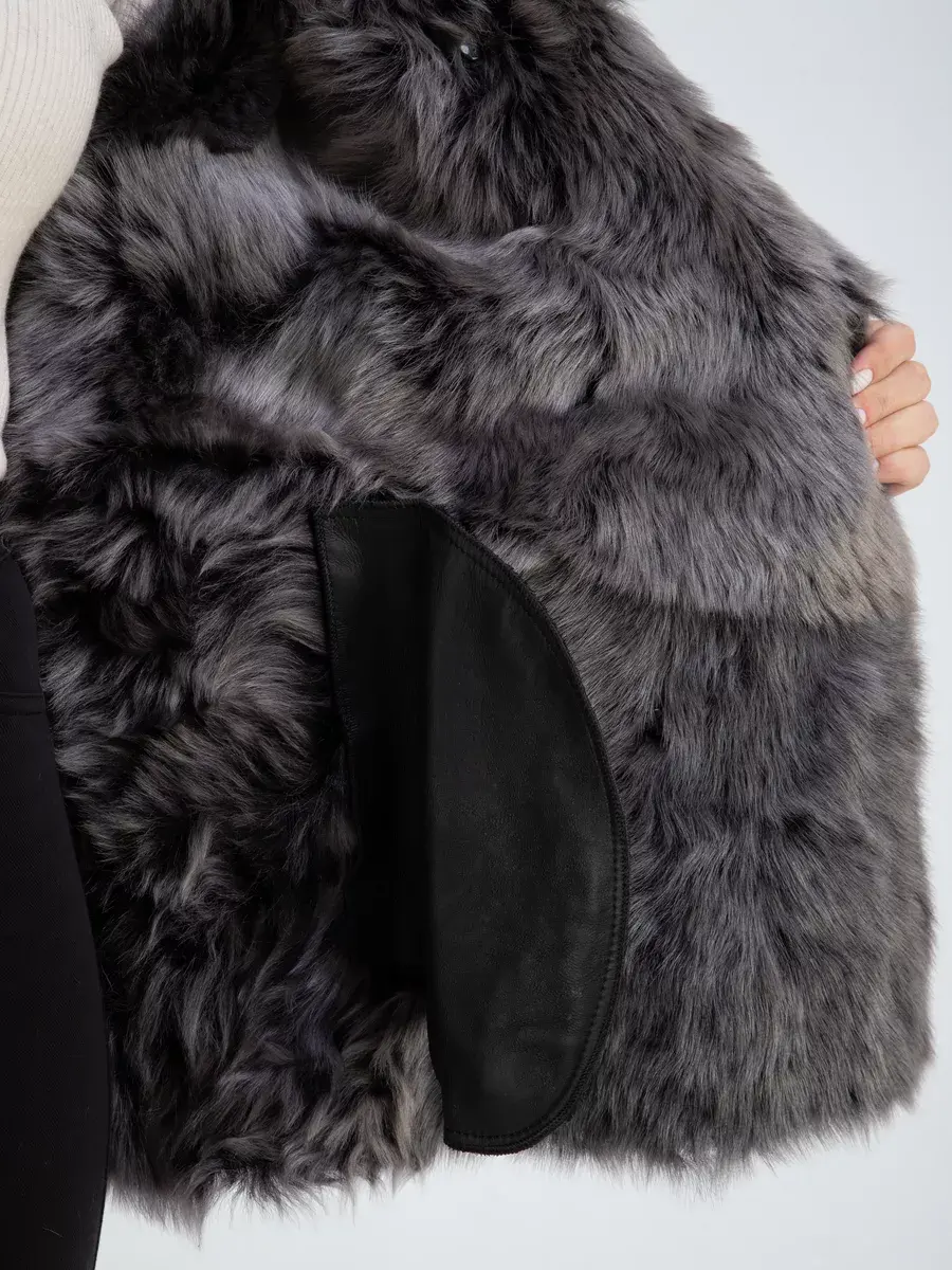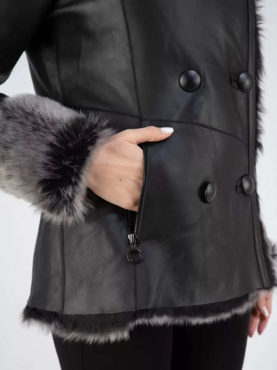Стильная натуральная дубленка также оснащена двубортной застежкой на пуговицах, которая придает ей оригинальный и элегантный вид. Прорезные карманы на молниях позволяют хранить необходимые мелочи безопасно и удобно. Ее полуприталенный крой подчеркивает женственность фигуры, сохраняя при этом свободу движений.