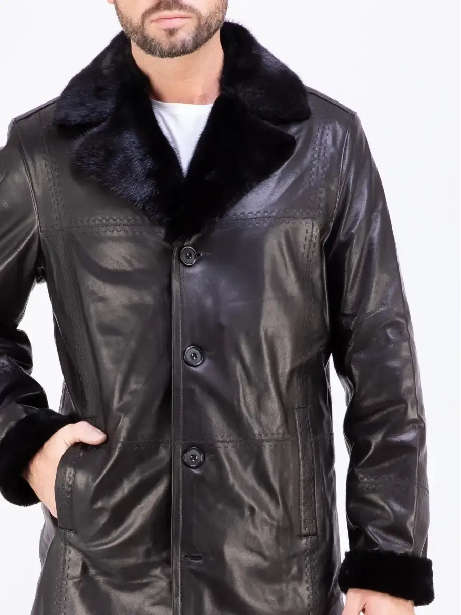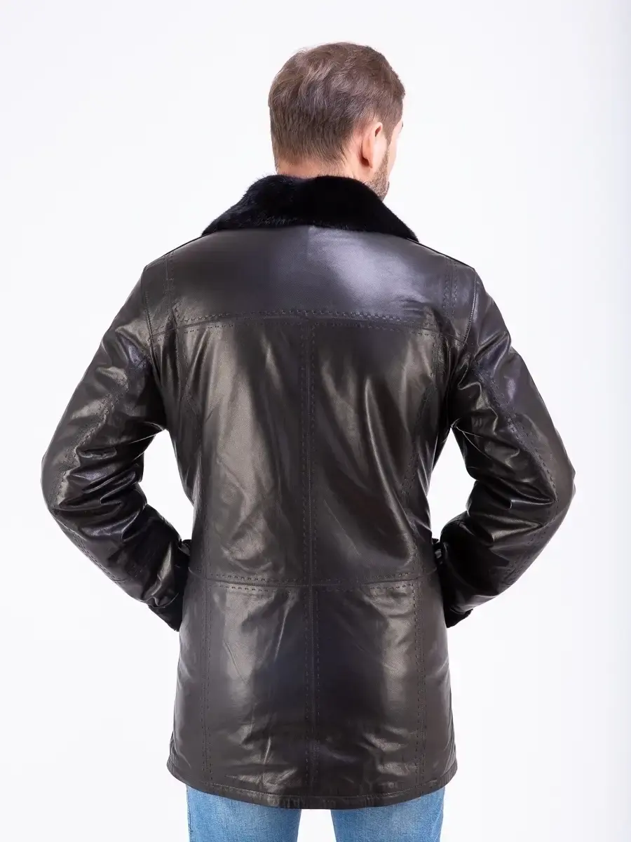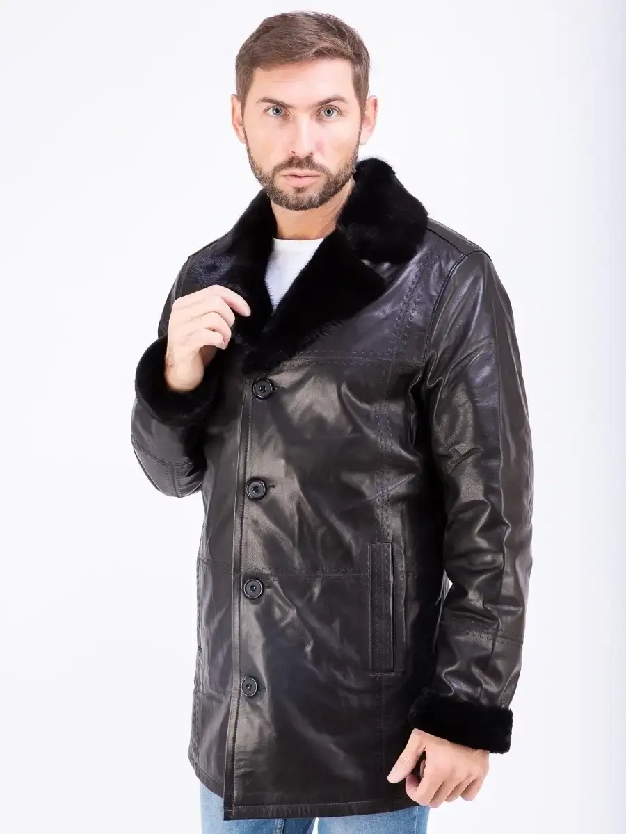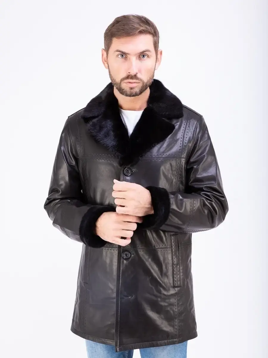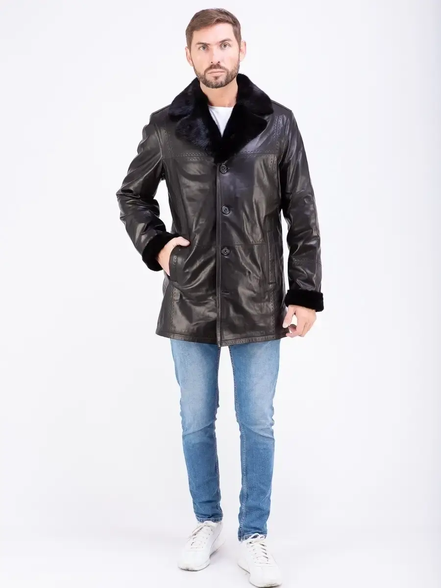 Стильный английский воротник с отделкой из меха норки и с лацканами, прямой крой, декоративная строчка придают куртке - дубленке уникальность и изысканность, идеально впишется в деловой стиль и дополнит солидный образ мужчины или парня подростка, независимо от возраста. Застежка на пуговицах обеспечивает легкость и удобство в использовании, а прорезные карманы дополнительно увеличивают функциональность и практичность куртки средней длины.