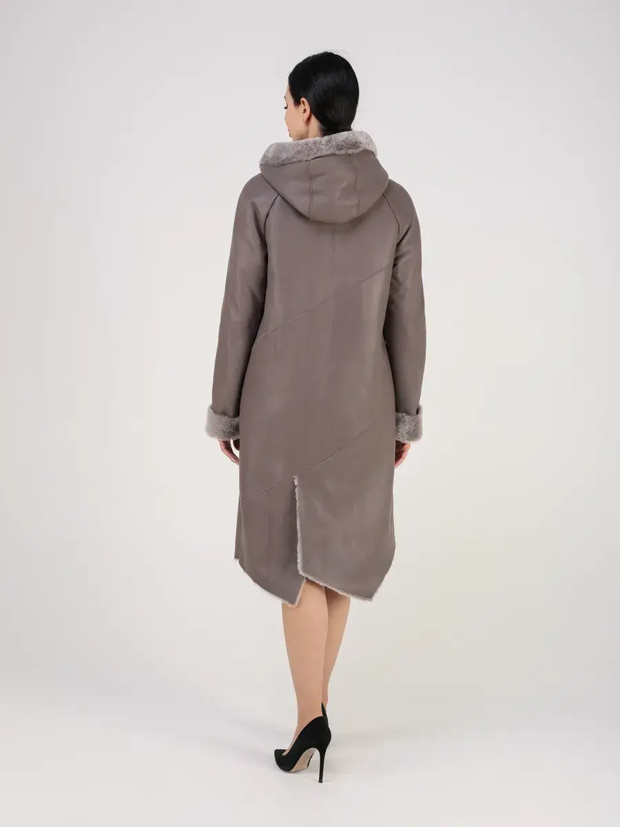 Модель с глубоким капюшоном, рукавами - реглан с меховыми манжетами, прорезными боковыми карманами и длиной ниже колена имеет удобную застежку молнию и классический дизайн в стиле минимализм. Капюшон оформлен стильной опушкой и имеет регулируемую кулиску, обеспечивая максимальную защиту от ветра и снега. Шлица и асимметричный подол придает дубленке изысканность и позволяет свободно двигаться.