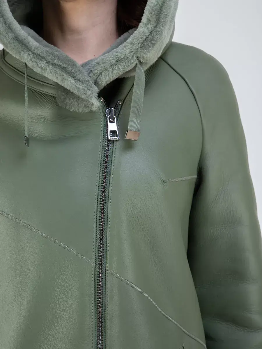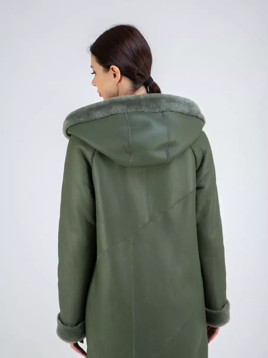 Модель с глубоким капюшоном, рукавами - реглан с меховыми манжетами, прорезными боковыми карманами и длиной ниже колена имеет удобную застежку молнию и классический дизайн в стиле минимализм. Капюшон оформлен стильной опушкой и имеет регулируемую кулиску, обеспечивая максимальную защиту от ветра и снега. Шлица и асимметричный подол придает дубленке изысканность и позволяет свободно двигаться.