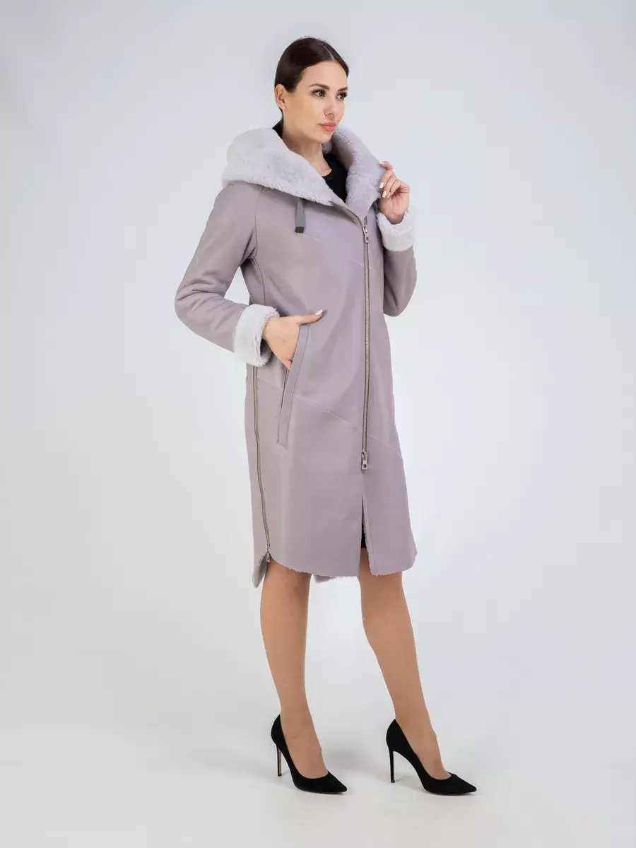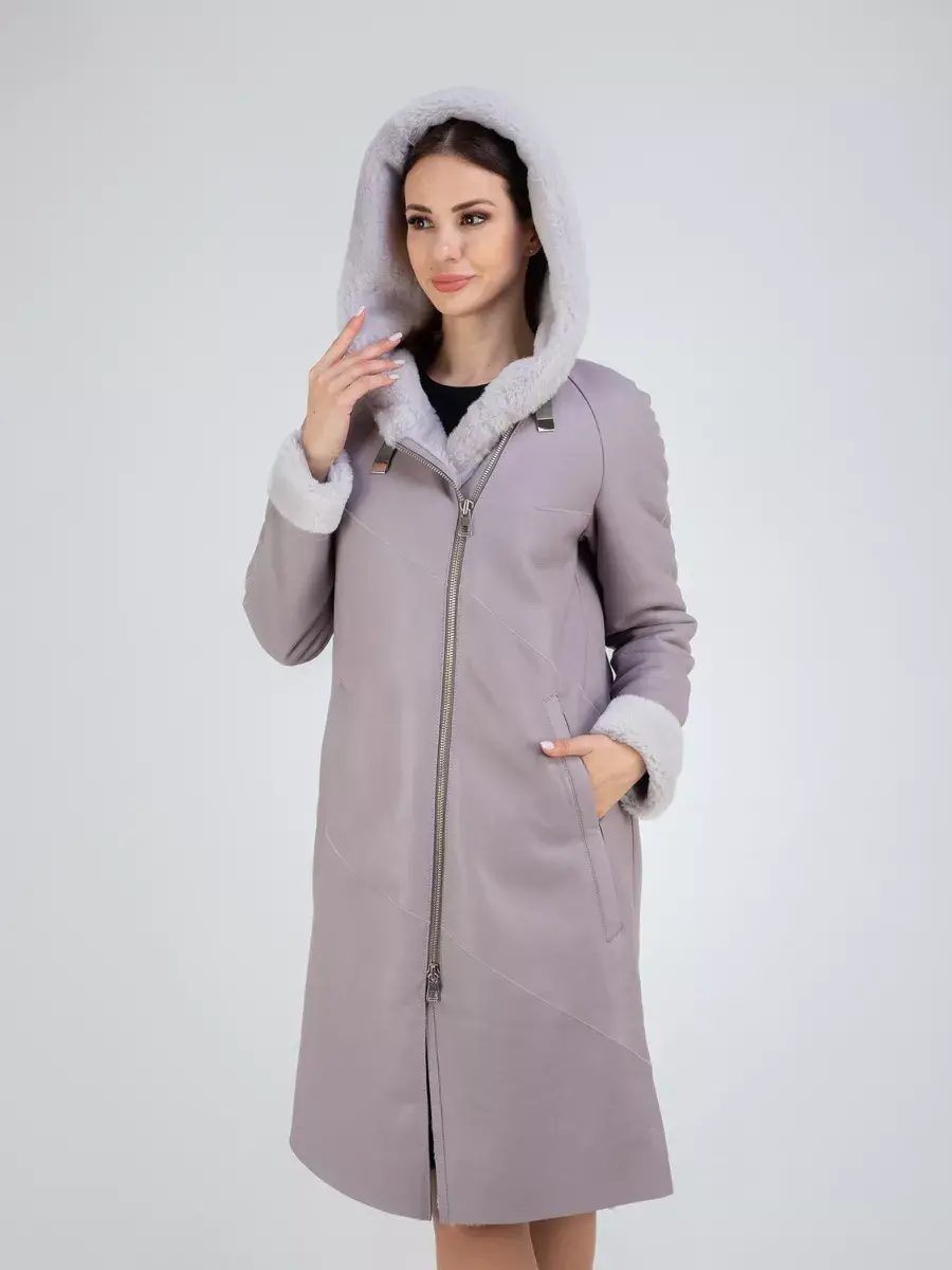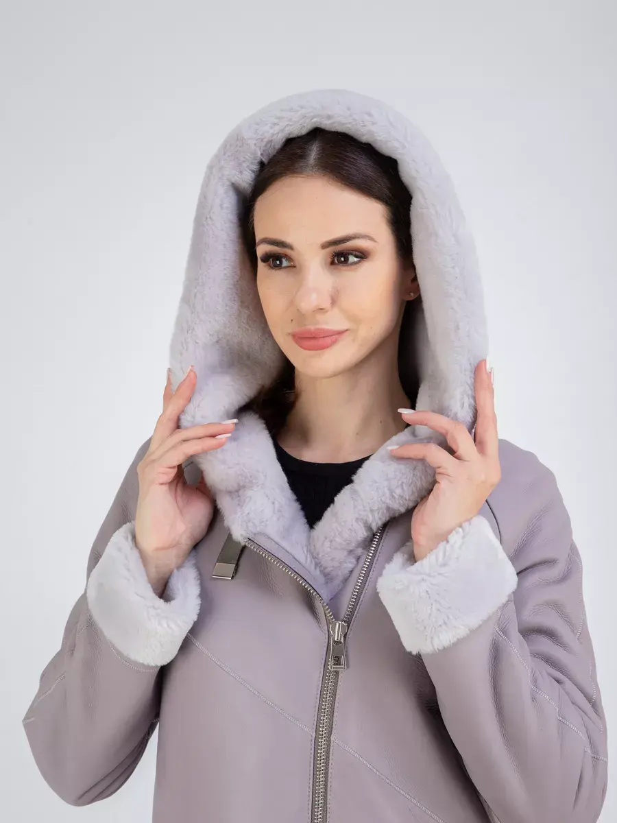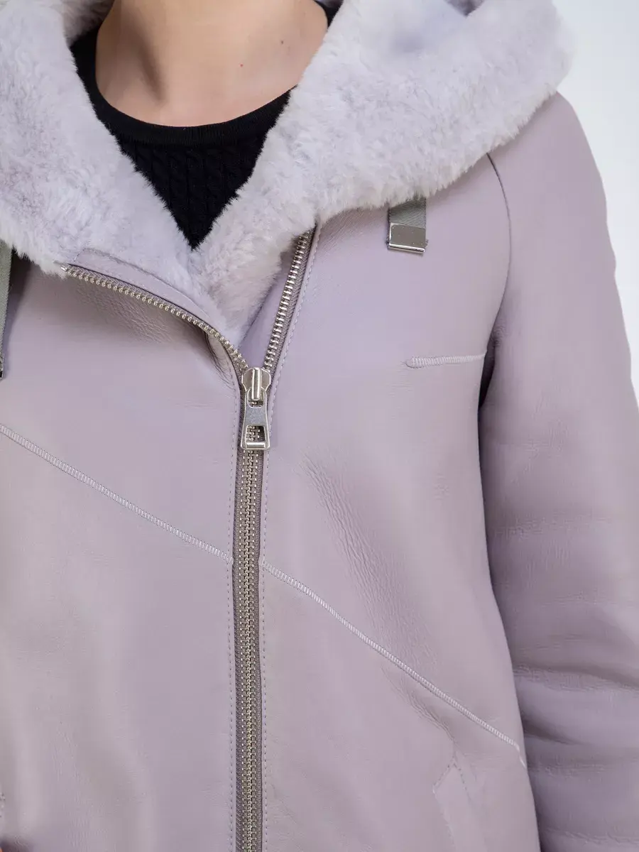 Модель с глубоким капюшоном, рукавами - реглан с меховыми манжетами, прорезными боковыми карманами и длиной ниже колена имеет удобную застежку молнию и классический дизайн в стиле минимализм. Капюшон оформлен стильной опушкой и имеет регулируемую кулиску, обеспечивая максимальную защиту от ветра и снега. Шлица и асимметричный подол придает дубленке изысканность и позволяет свободно двигаться.