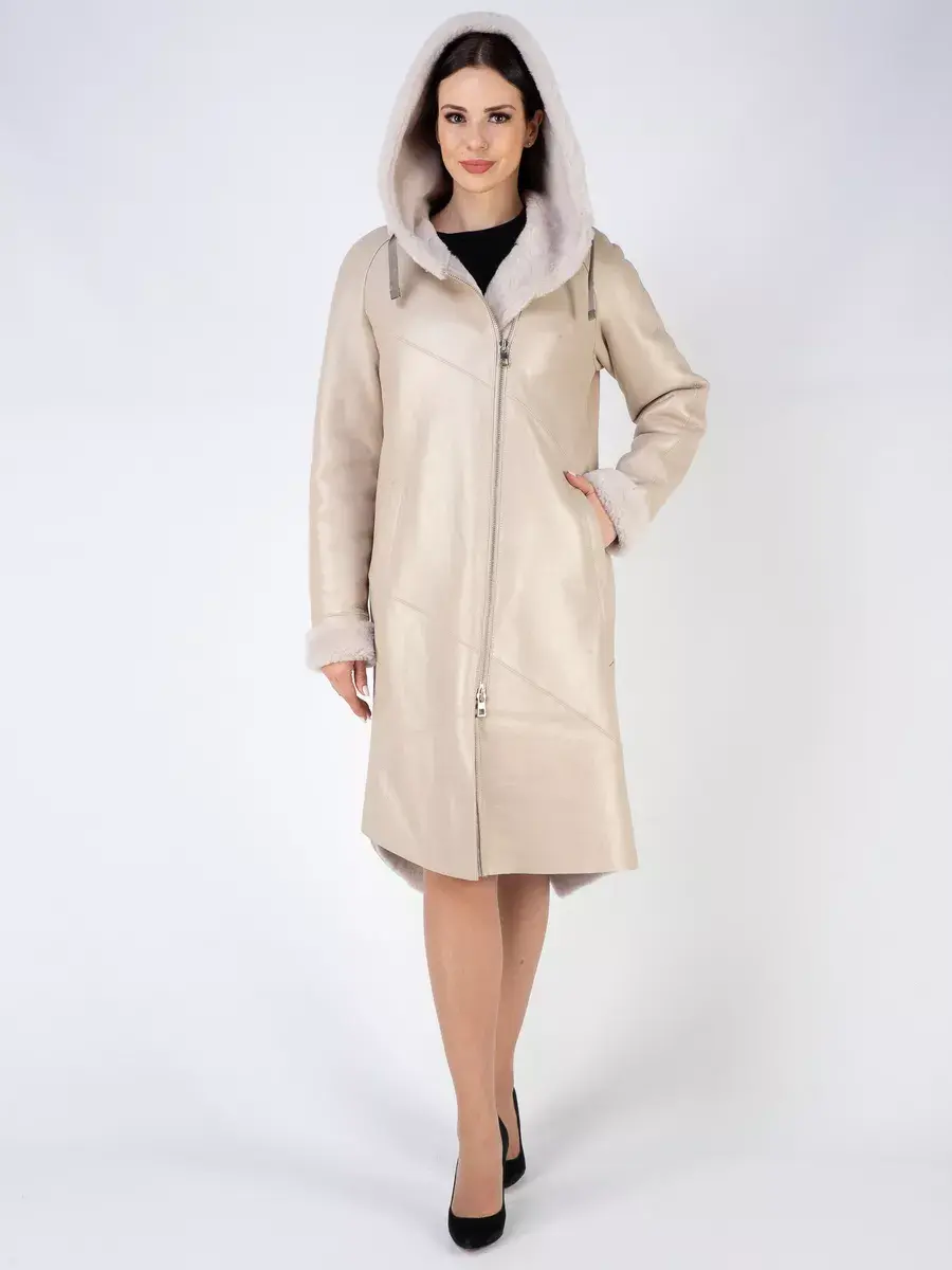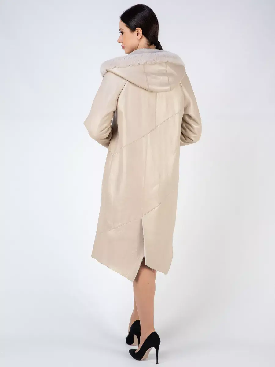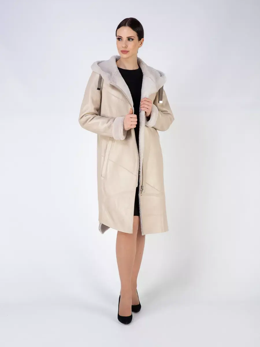 Модель с глубоким капюшоном, рукавами - реглан с меховыми манжетами, прорезными боковыми карманами и длиной ниже колена имеет удобную застежку молнию и классический дизайн в стиле минимализм. Капюшон оформлен стильной опушкой и имеет регулируемую кулиску, обеспечивая максимальную защиту от ветра и снега. Шлица и асимметричный подол придает дубленке изысканность и позволяет свободно двигаться.