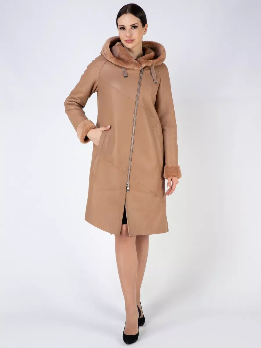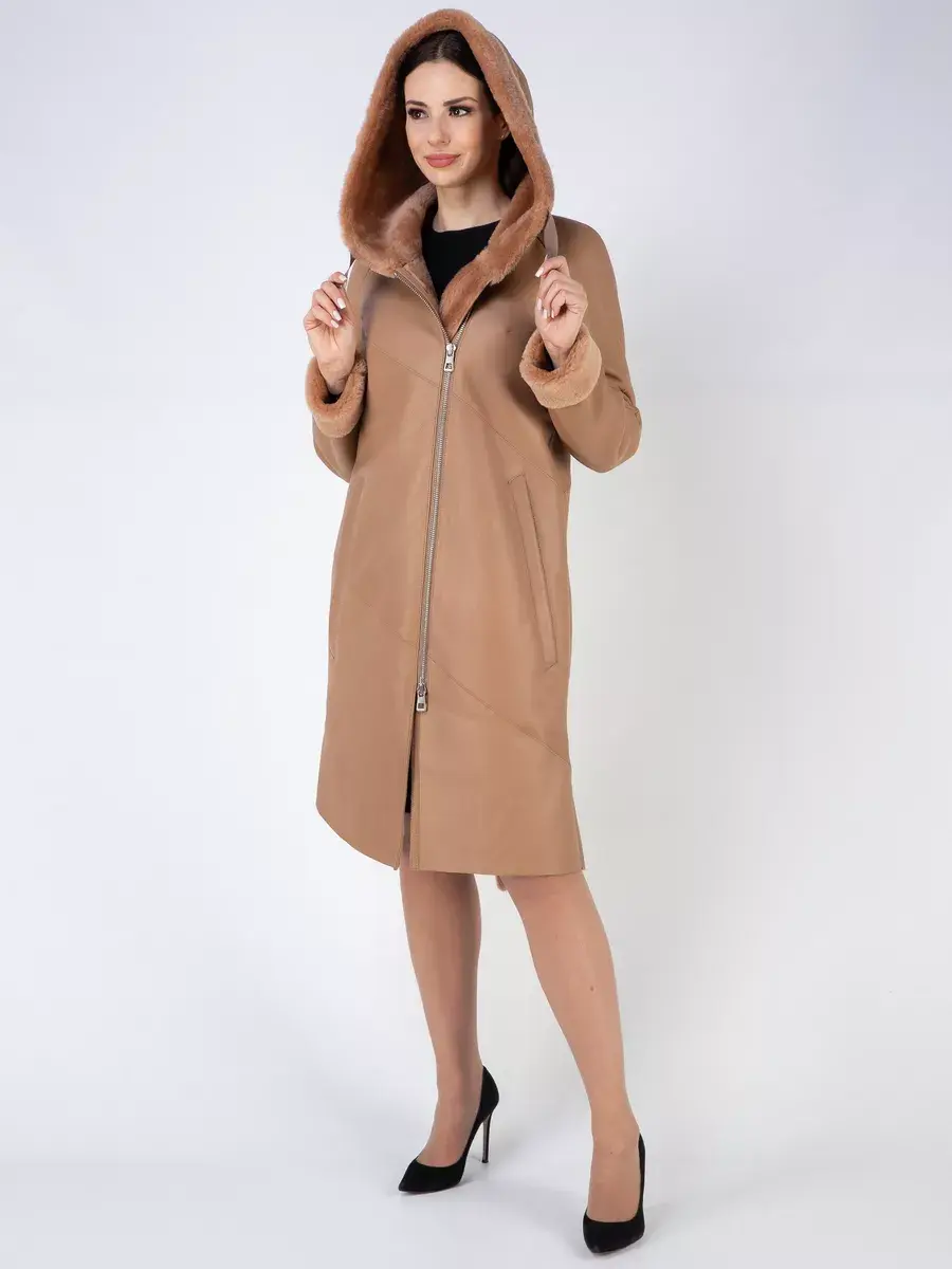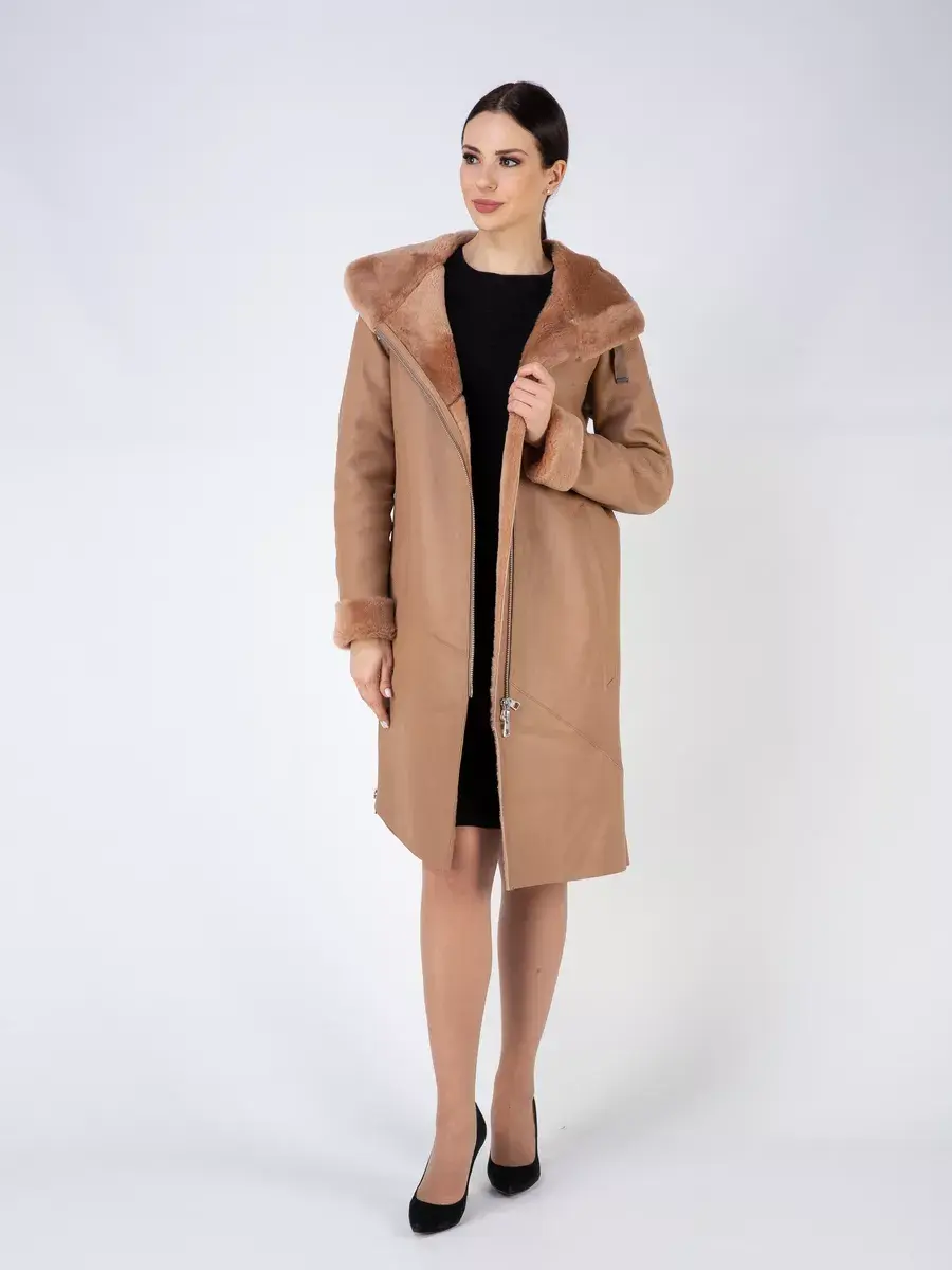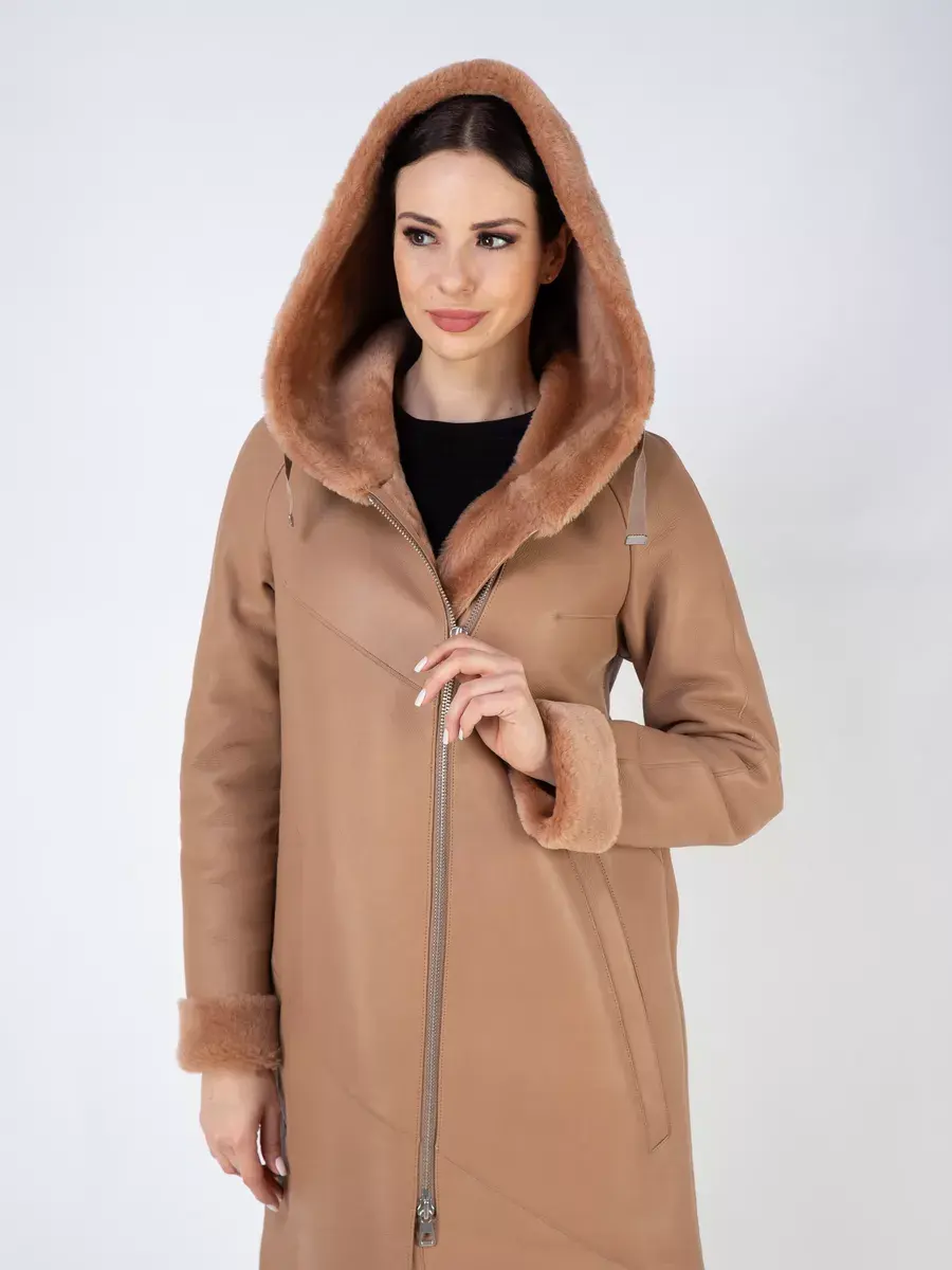 Модель с глубоким капюшоном, рукавами - реглан с меховыми манжетами, прорезными боковыми карманами и длиной ниже колена имеет удобную застежку молнию и классический дизайн в стиле минимализм. Капюшон оформлен стильной опушкой и имеет регулируемую кулиску, обеспечивая максимальную защиту от ветра и снега. Шлица и асимметричный подол придает дубленке изысканность и позволяет свободно двигаться.