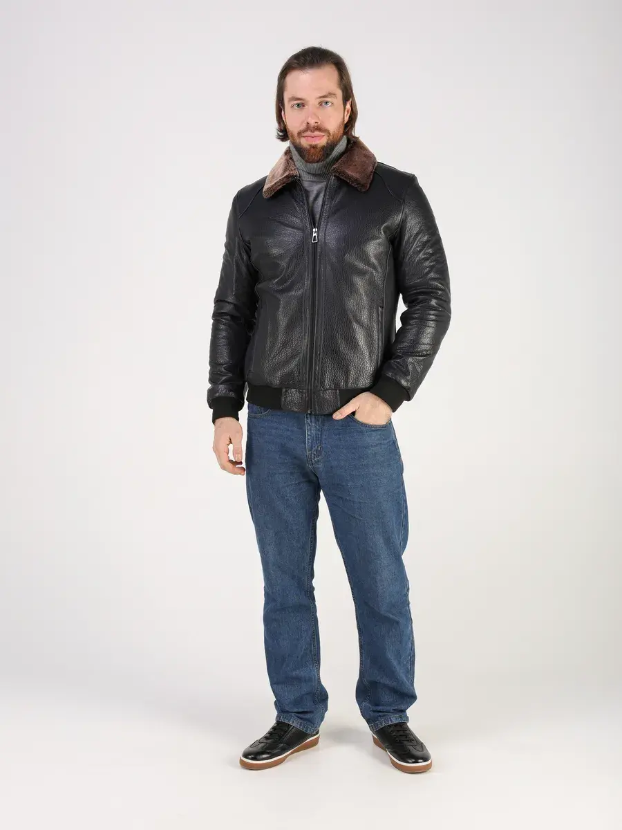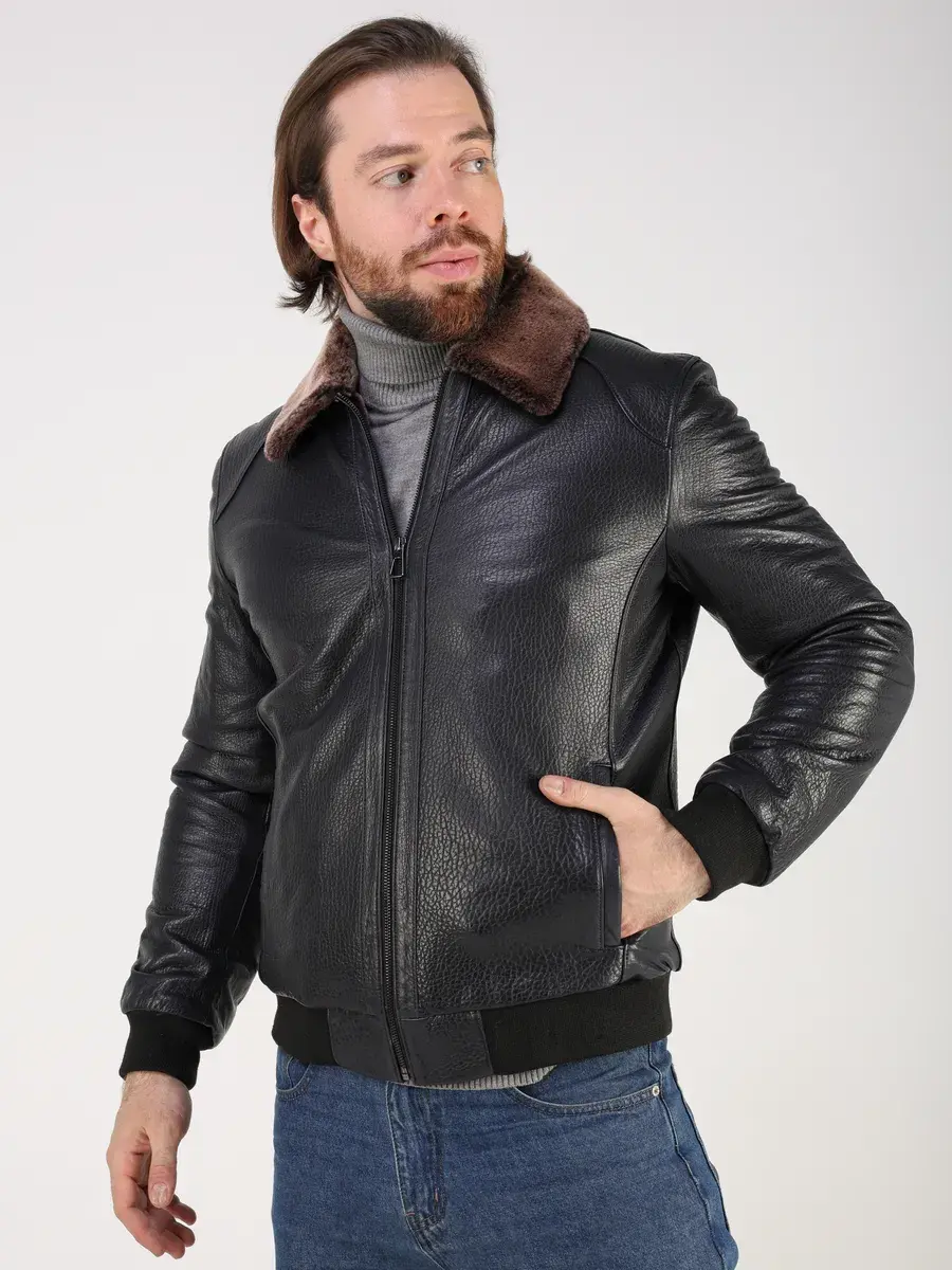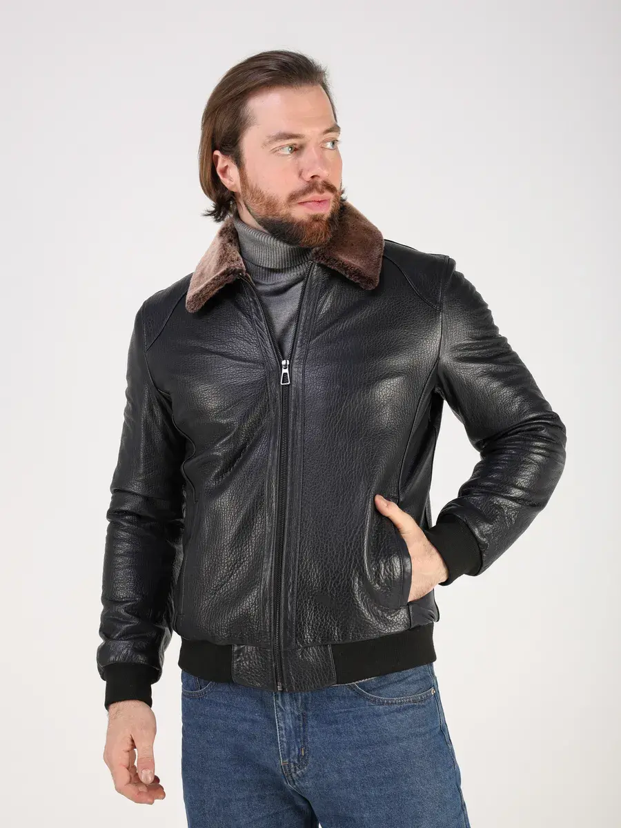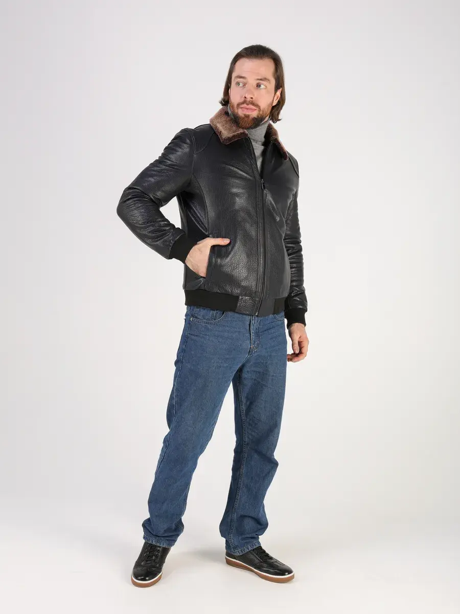 Стильный отложной - меховой воротник, прямой крой, дорогая фактурная кожа, трикотажные манжеты и утягивающий низ придают куртке - дубленке уникальность и изысканность, идеально впишется в деловой стиль и дополнит солидный образ мужчины или парня подростка, независимо от возраста. Дубленка мужская натуральная зимняя имеет застежку на молнии и прорезные карманы которые дополнительно увеличивают функциональность и практичность куртки средней длины. Рукава куртки утеплены синтепоном.