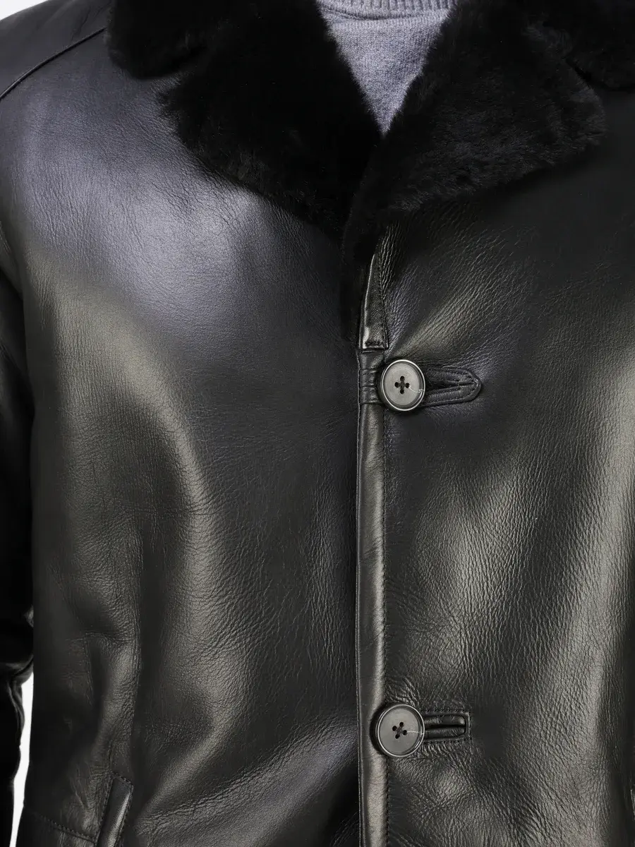 Стильный английский воротник с лацканами, прямой крой, фактура с эффектом потертости и старения придают куртке - дубленке уникальность и изысканность, идеально впишется в деловой стиль и дополнит солидный образ мужчины или парня подростка, независимо от возраста. Застежка на пуговицах обеспечивает легкость и удобство в использовании, а прорезные карманы дополнительно увеличивают функциональность и практичность куртки средней длины.