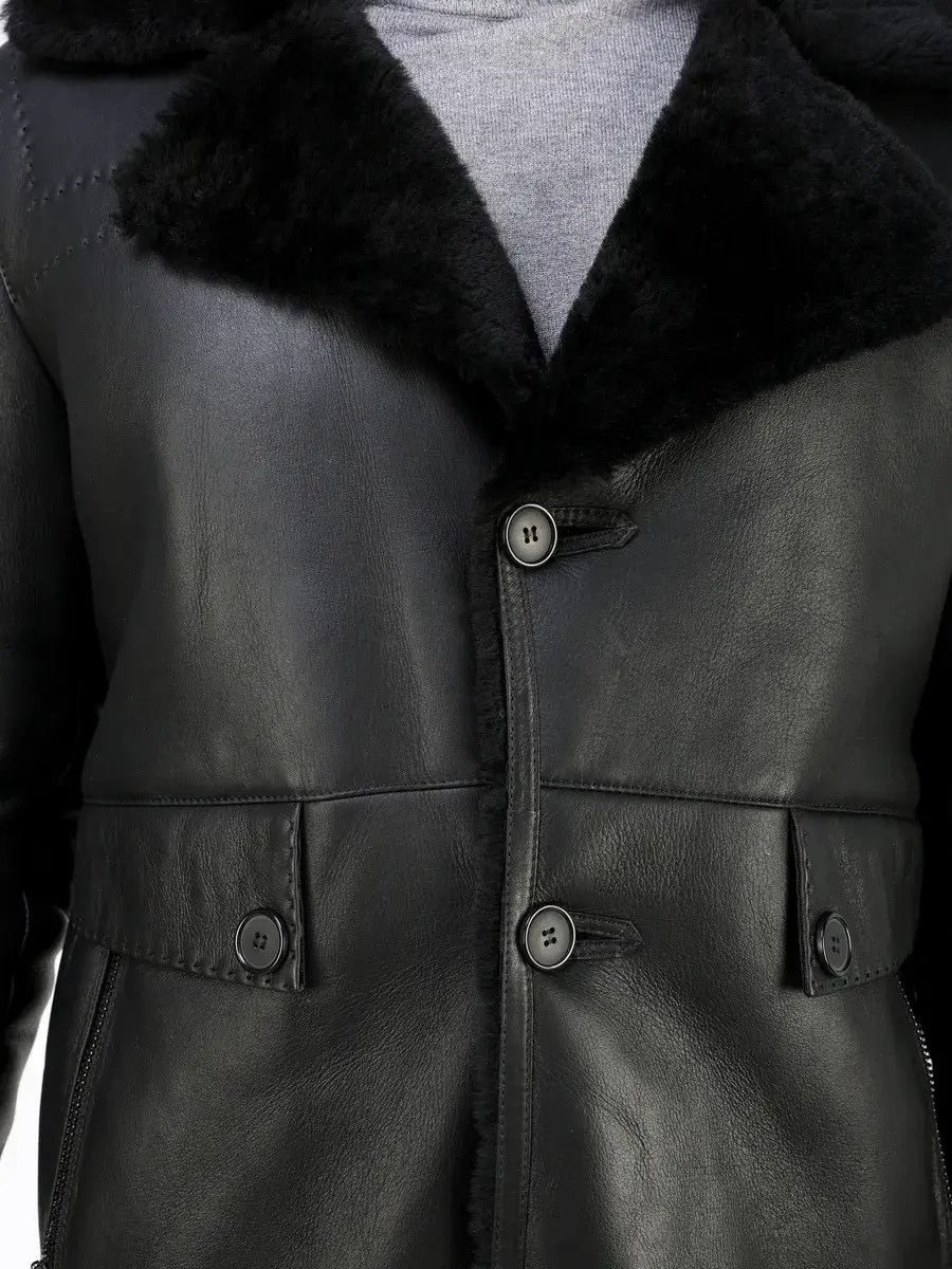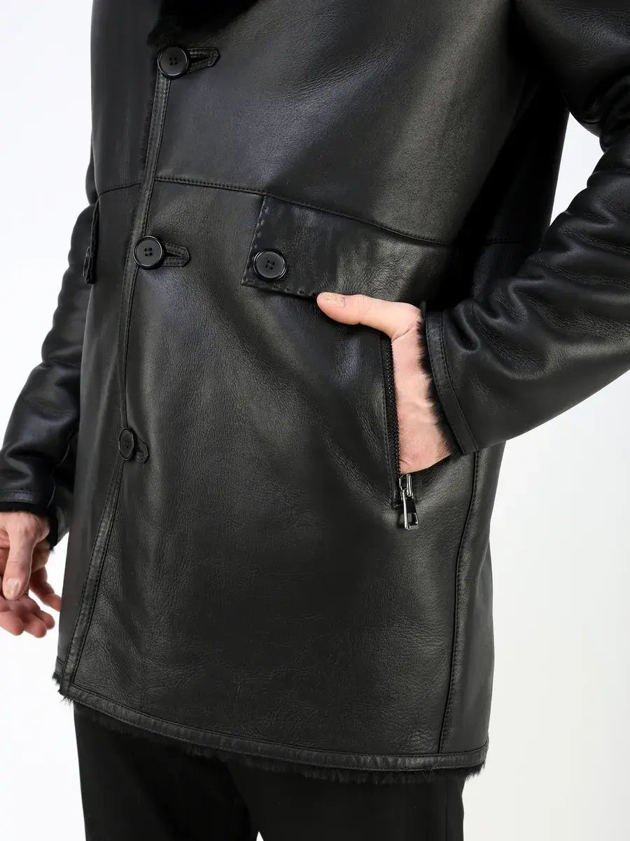 Стильный английский воротник с лацканами, прямой крой, декоративные кожаные вставки на карманах придают куртке - дубленке уникальность и изысканность, идеально впишется в деловой стиль и дополнит солидный образ мужчины или парня подростка, независимо от возраста. Застежка на пуговицах обеспечивает легкость и удобство в использовании, а прорезные карманы на молниях дополнительно увеличивают функциональность и практичность куртки средней длины.