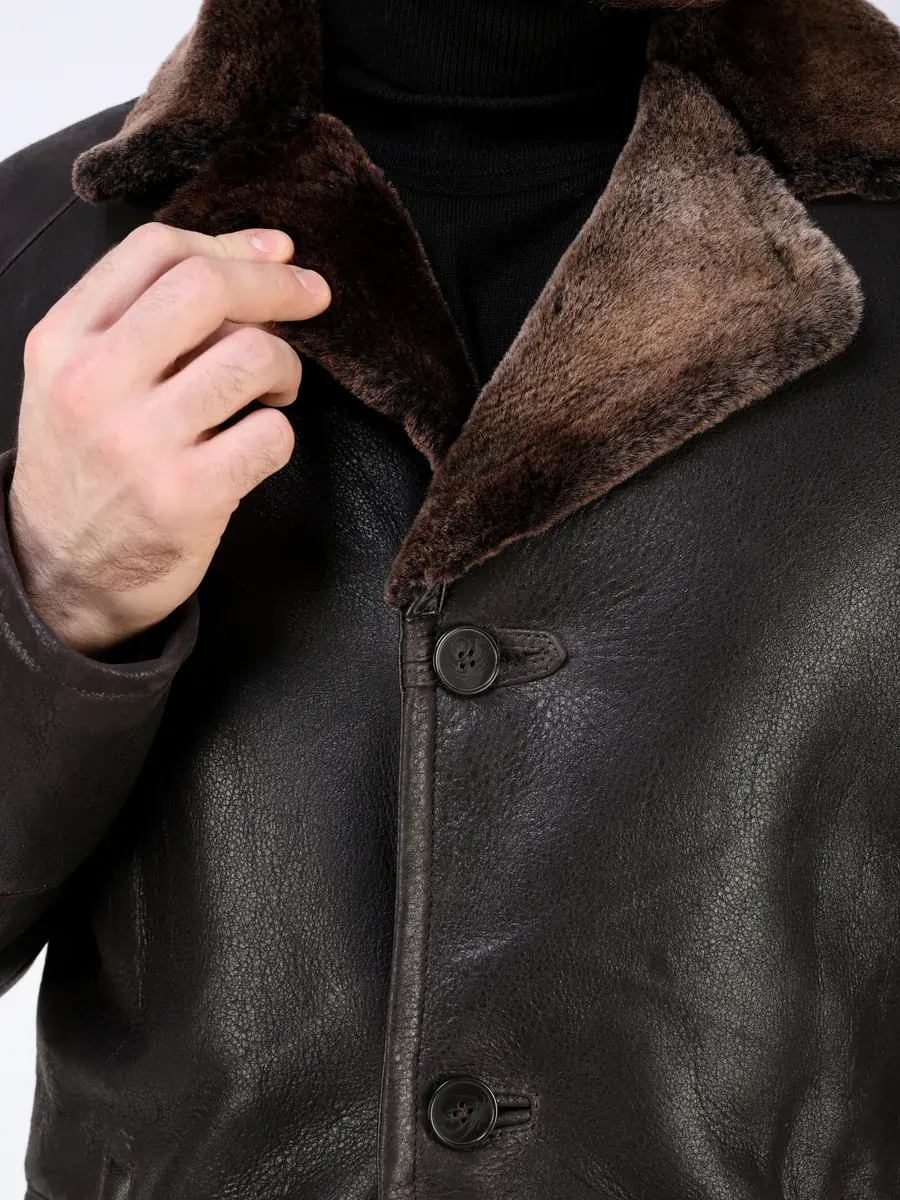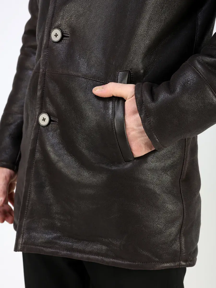 Стильный английский воротник с лацканами, прямой крой, фактура с эффектом потертости и старения придают куртке - дубленке уникальность и изысканность, идеально впишется в деловой стиль и дополнит солидный образ мужчины или парня подростка, независимо от возраста. Застежка на пуговицах обеспечивает легкость и удобство в использовании, а прорезные карманы дополнительно увеличивают функциональность и практичность куртки средней длины.