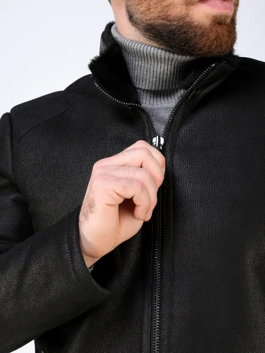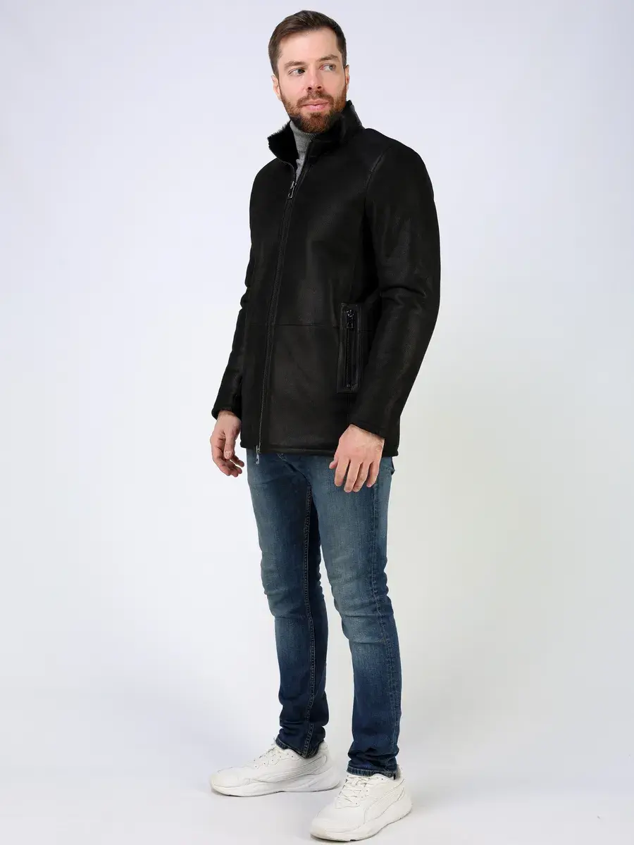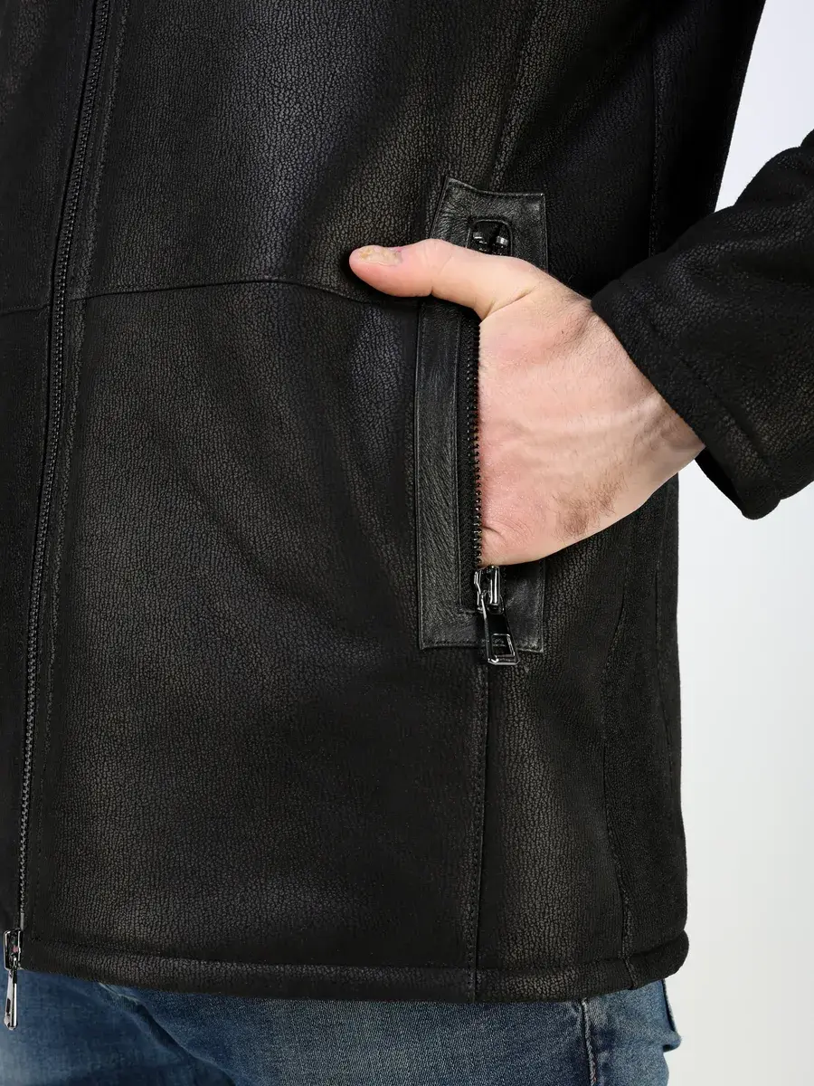 Стильный воротник стойка с отделкой из кожи, прямой крой, декоративные кожаные вставки на карманах придают куртке - дубленке уникальность и изысканность, идеально впишется в деловой стиль и дополнит солидный образ мужчины или парня подростка, независимо от возраста. Застежка на молнии обеспечивает легкость и удобство в использовании, а прорезные карманы на молниях дополнительно увеличивают функциональность и практичность куртки средней длины.