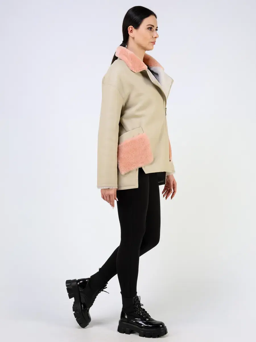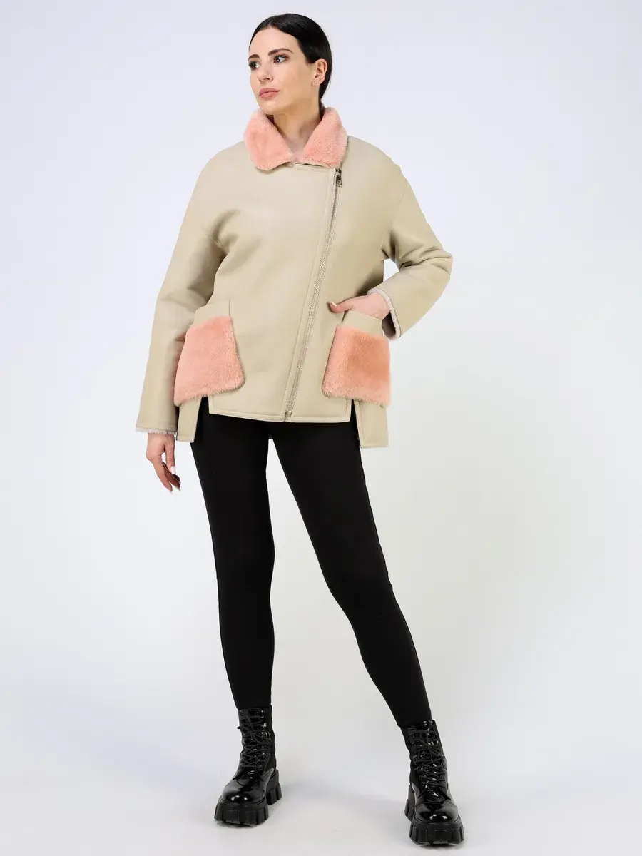 Особое внимание привлекает прямой крой с асимметричным подолом и меховые вставки, которые делают модель модной и эксклюзивной. Спущенная линия плеч добавляет комфорта, а застежка - косая молния служит не только функциональным элементом, но и оригинальной деталью дизайна. Накладные карманы и воротник украшены отделкой из меха овчины яркого цвета, придавая изделию роскошный вид.