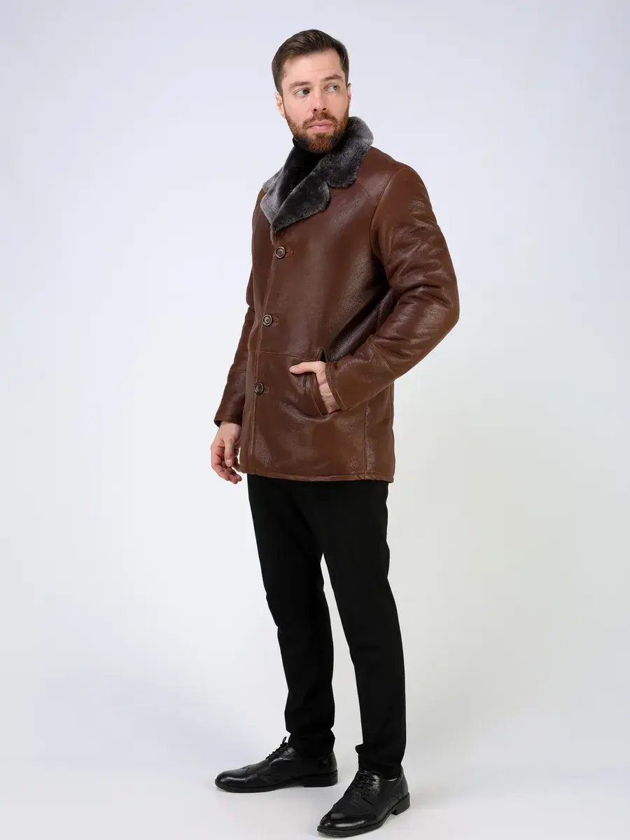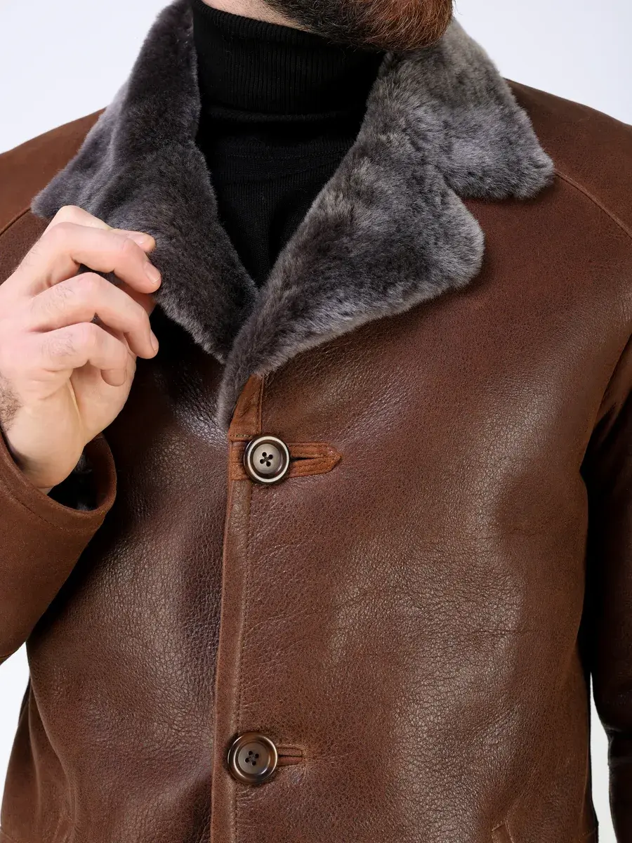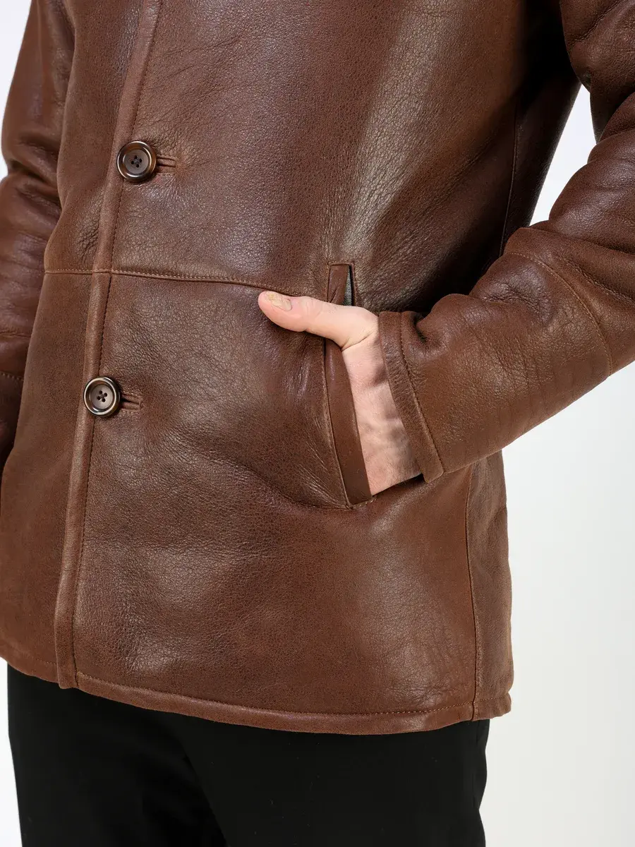 Стильный английский воротник с лацканами, прямой крой, фактура с эффектом потертости и старения придают куртке - дубленке уникальность и изысканность, идеально впишется в деловой стиль и дополнит солидный образ мужчины или парня подростка, независимо от возраста. Застежка на пуговицах обеспечивает легкость и удобство в использовании, а прорезные карманы дополнительно увеличивают функциональность и практичность куртки средней длины.
