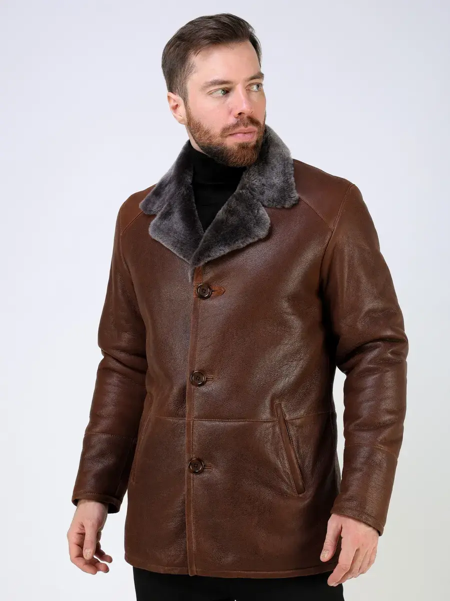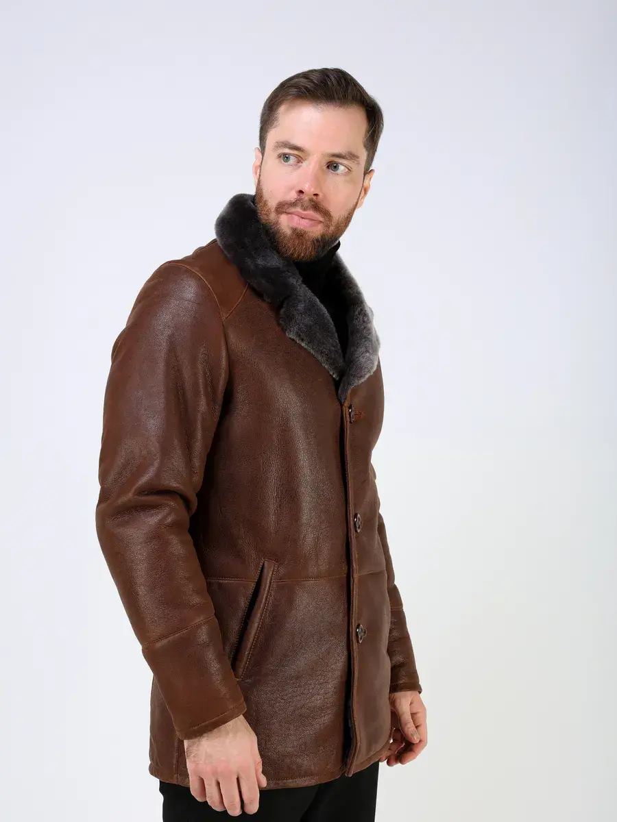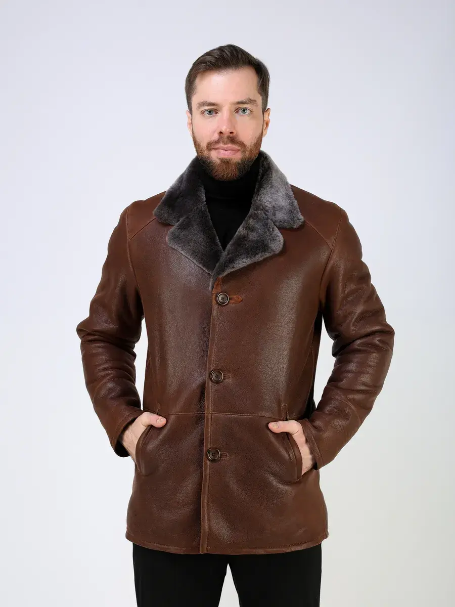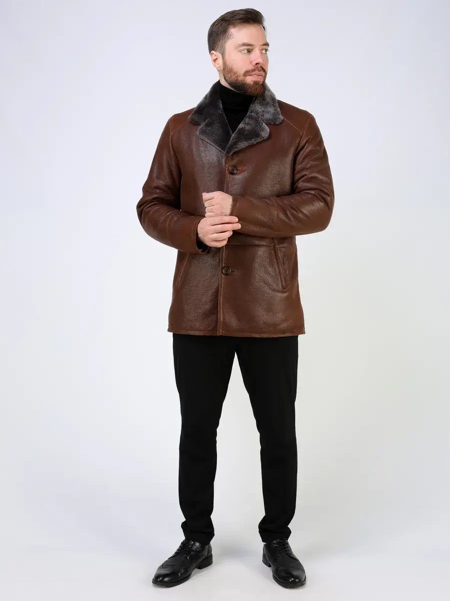 Стильный английский воротник с лацканами, прямой крой, фактура с эффектом потертости и старения придают куртке - дубленке уникальность и изысканность, идеально впишется в деловой стиль и дополнит солидный образ мужчины или парня подростка, независимо от возраста. Застежка на пуговицах обеспечивает легкость и удобство в использовании, а прорезные карманы дополнительно увеличивают функциональность и практичность куртки средней длины.