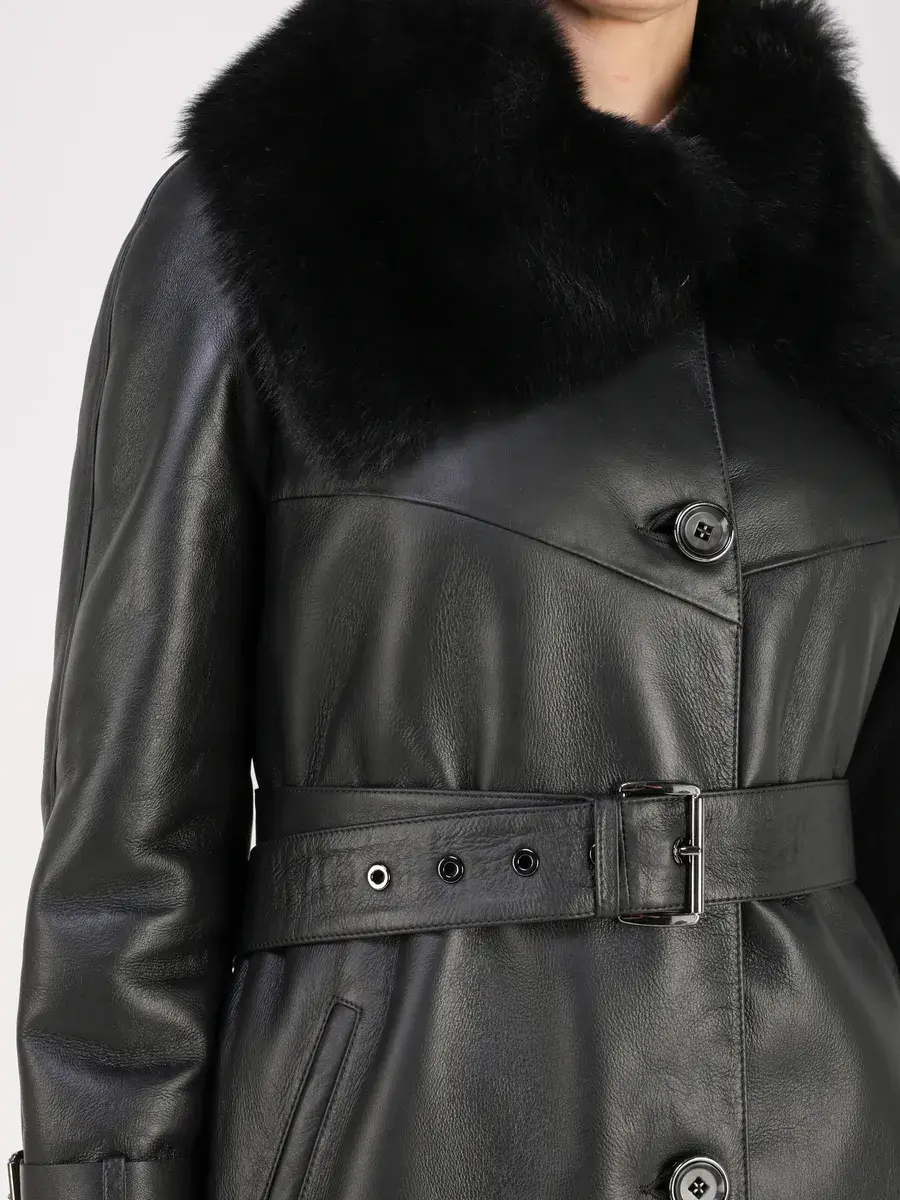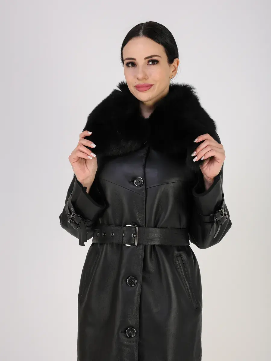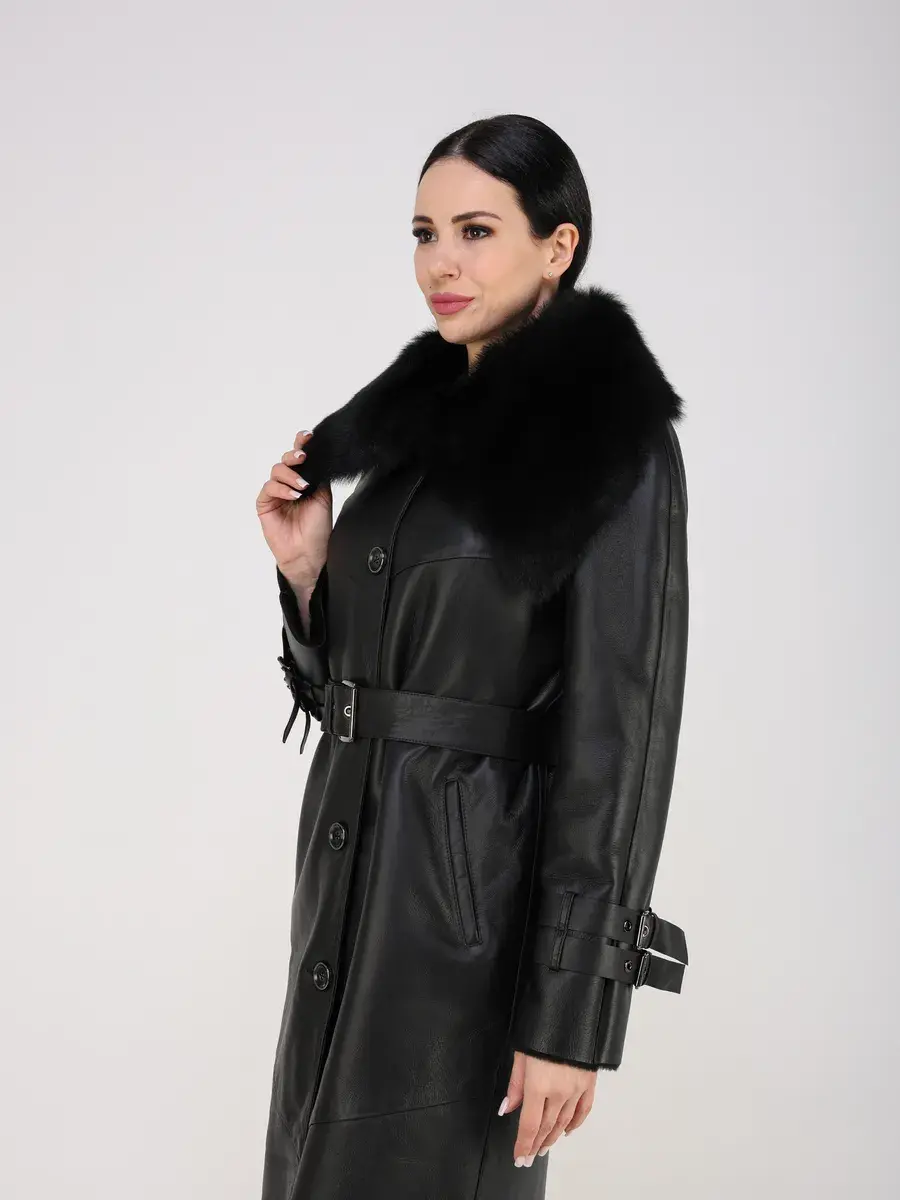 хлястики на рукавах, молния с боку, объемный меховой воротник,