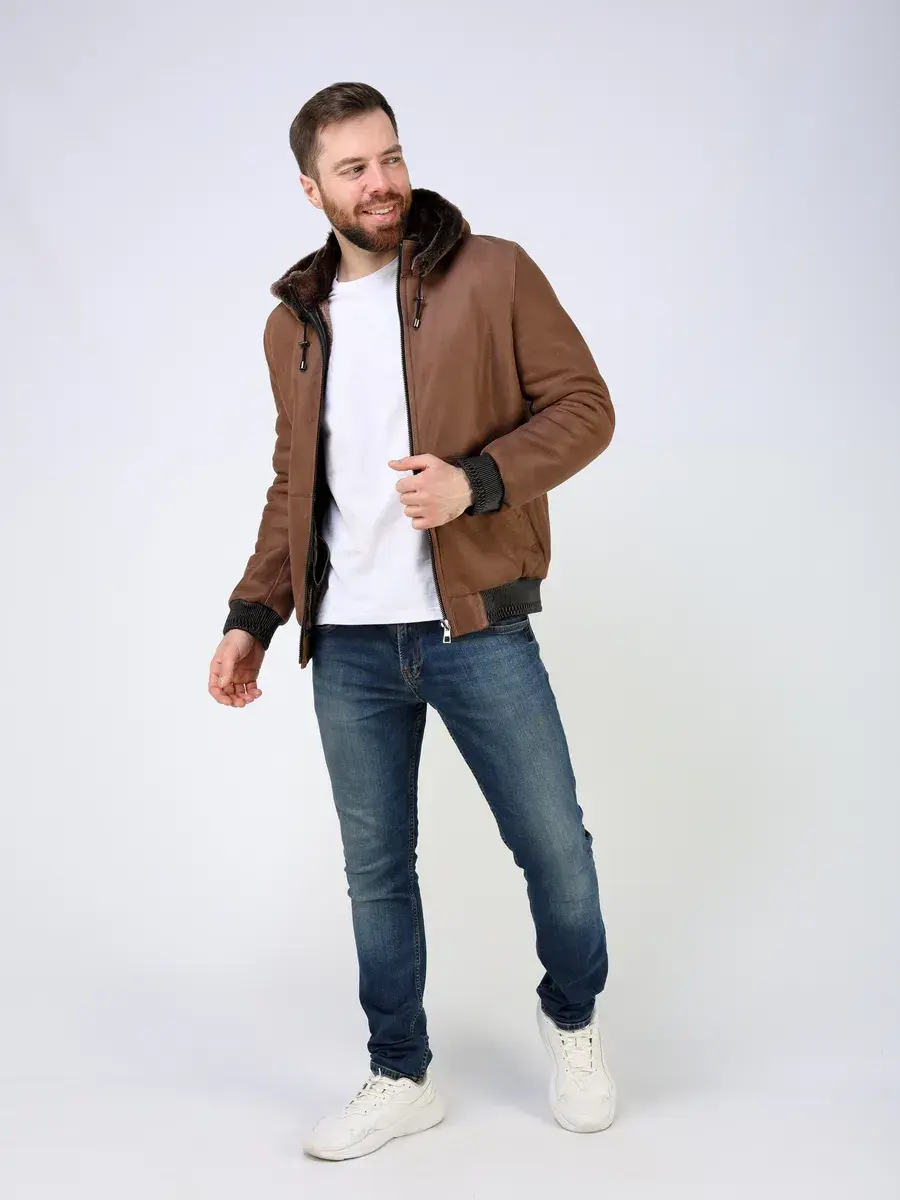 Стильный воротник стойка с съемным капюшоном на кулисках, прямой крой, декоративные кожаные манжеты и утягивающий низ придают куртке - дубленке уникальность и изысканность, идеально впишется в деловой стиль и дополнит солидный образ мужчины или парня подростка, независимо от возраста. Застежка на молнии обеспечивает легкость и удобство в использовании, а прорезные карманы дополнительно увеличивают функциональность и практичность куртки, бомбер средней длины.