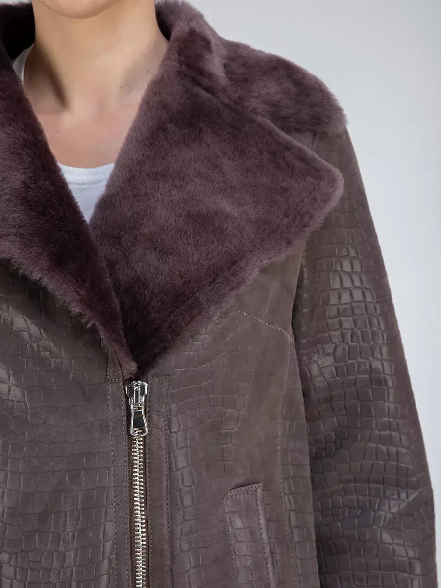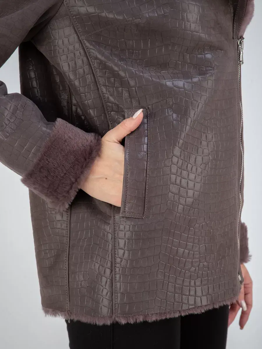 Дубленка женская авиатор натуральная - это замечательный выбор для стильного и теплого зимнего образа. Главным преимуществом данной дубленки является ее натуральность. Дубленка женская зимняя изготовлена из натуральной овчины, которая обладает невероятной теплоизоляцией и защищает от холода даже в самые суровые зимние дни. Важно отметить, что натуральная женская дубленка значительно превосходит искусственные аналоги по многим параметрам. Она более теплая, прочная и комфортная при носке. Поэтому, выбирая между натуральной и искусственной дубленкой, остановитесь на первом варианте и наслаждайтесь его преимуществами.Еще одним интересным деталем данной дубленки является тиснение, выполненное в виде имитации кожи крокодила. Это придает ей особый шарм и оригинальность, позволяя выделиться из толпы и подчеркнуть свою индивидуальность. Такой дизайн станет актуальным и модным на протяжении многих сезонов. Дубленка авиатор оснащена удобной застежкой на молнии, которая обеспечивает комфорт. Это особенно актуально в условиях быстротечной и суетливой жизни современных женщин. Кроме того, на дубленке предусмотрены прорезные карманы, в которые можно удобно положить необходимые мелочи или согреть руки в холодную погоду.Классический воротник дубленки придаст вашему образу элегантности и изысканности. Дубленка женская натуральная позволит создать сдержанный и изысканный образ в сочетании с другими предметами вашего гардероба. Длина дубленки по спинке составляет 65 сантиметров, что позволяет одновременно подчеркнуть фигуру и обеспечить комфортное движение. Дубленка женская короткая идеально сочетается с любым стилем и образом, станет отличным дополнением к вашему гардеробу и позволит создать множество интересных и стильных комбинаций. Дубленка женская весна произведена в Турции. Предлагаем широкий выбор моделей зимней верхней одежды, больших размеров, оверсайз или приталенного кроя в подарок со скидкой на странице бренда