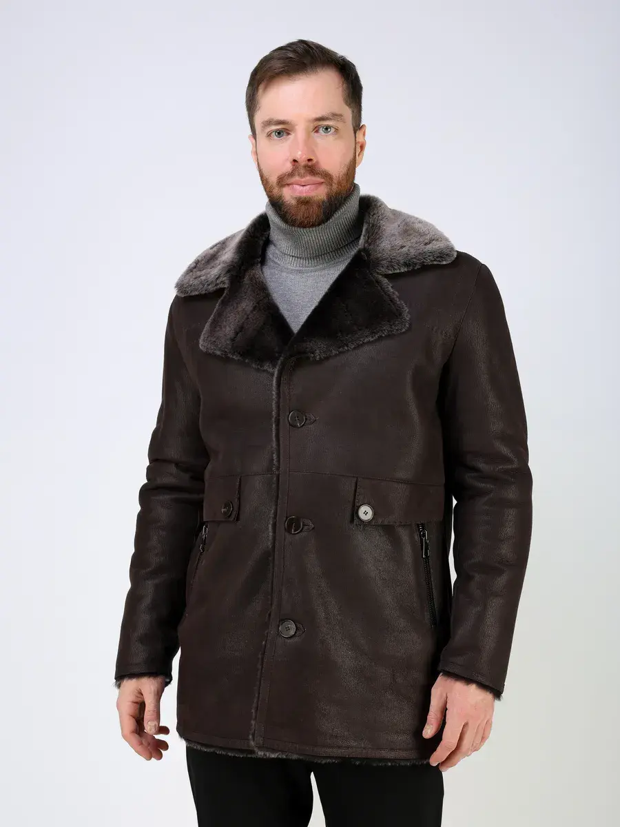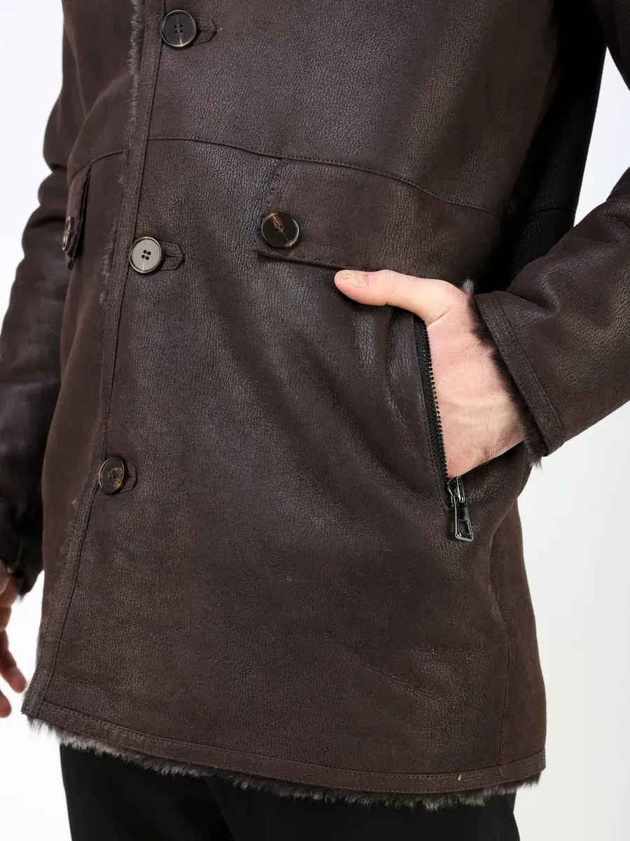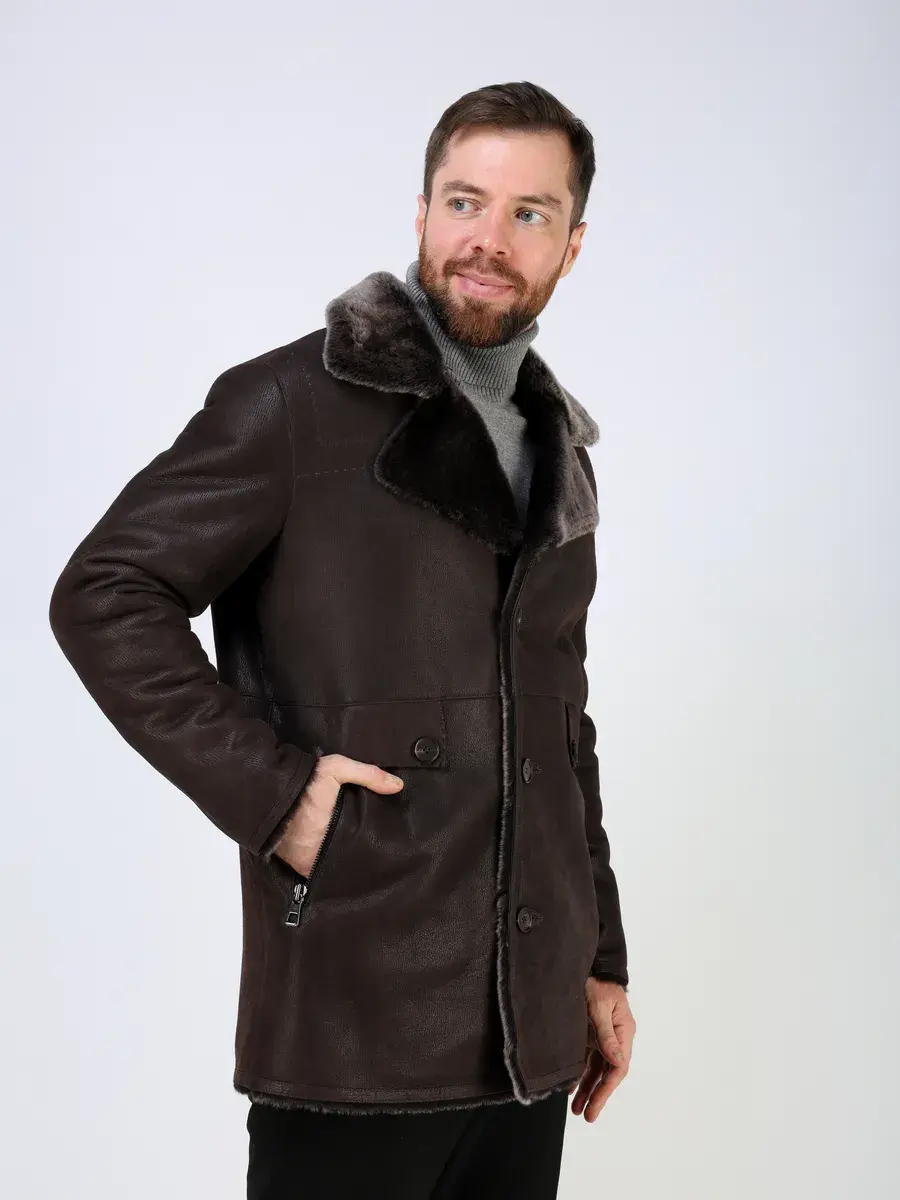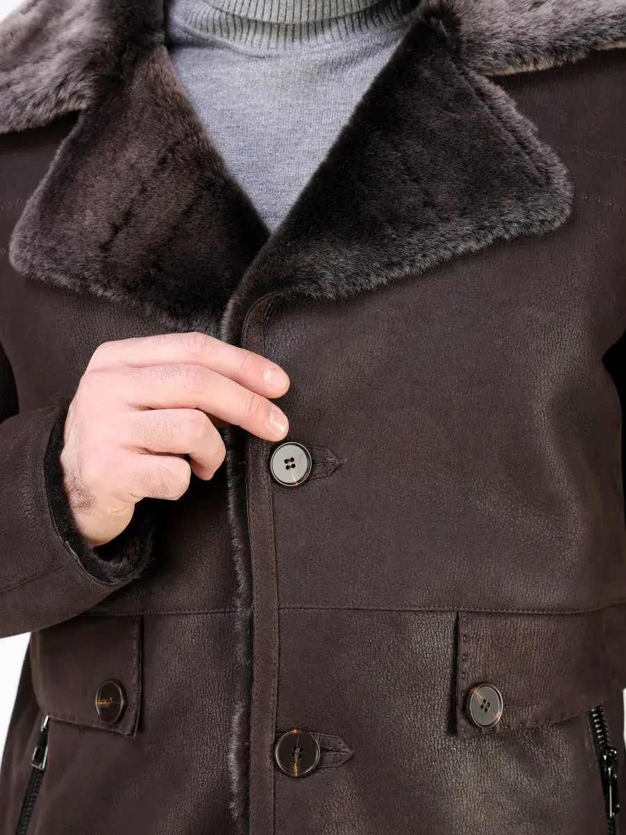 Стильный английский воротник с лацканами, прямой крой, декоративные кожаные вставки на карманах придают куртке - дубленке уникальность и изысканность, идеально впишется в деловой стиль и дополнит солидный образ мужчины или парня подростка, независимо от возраста. Застежка на пуговицах обеспечивает легкость и удобство в использовании, а прорезные карманы на молниях дополнительно увеличивают функциональность и практичность куртки средней длины.