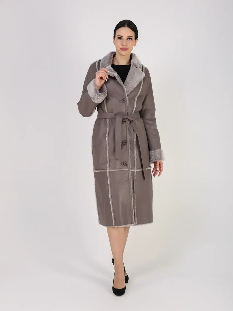 Особое внимание привлекает прямой крой с декоративной меховой строчкой, которые делают модель модной и эксклюзивной. Втачной рукав, английский - классический воротник и застежка на пуговицах служит не только функциональными элементами, но и оригинальной деталью дизайна.