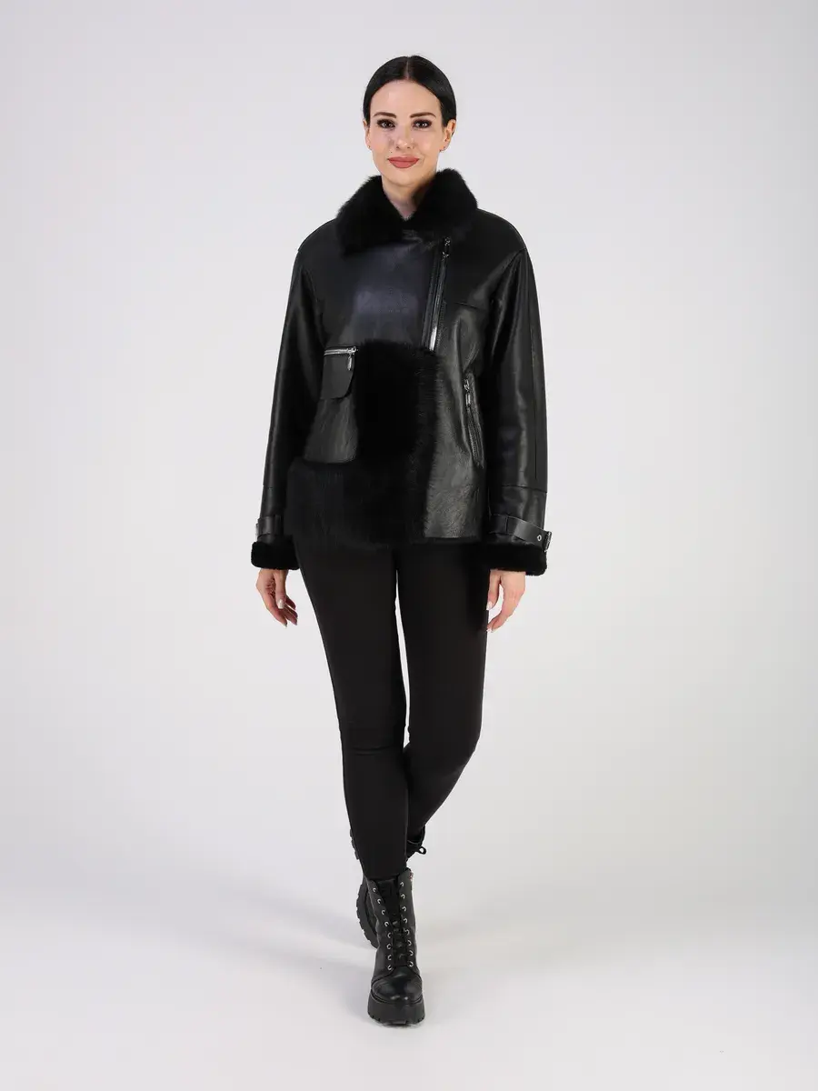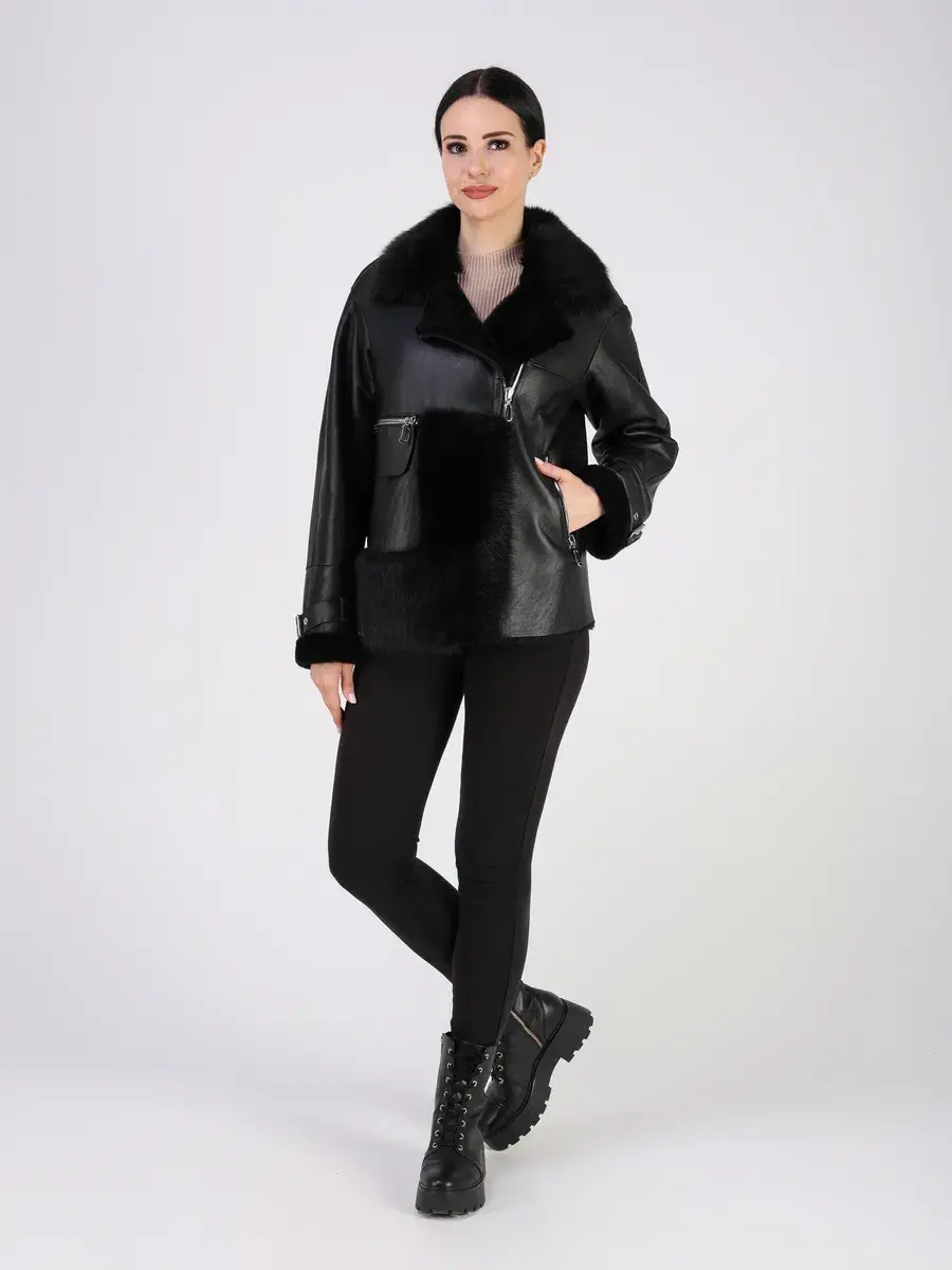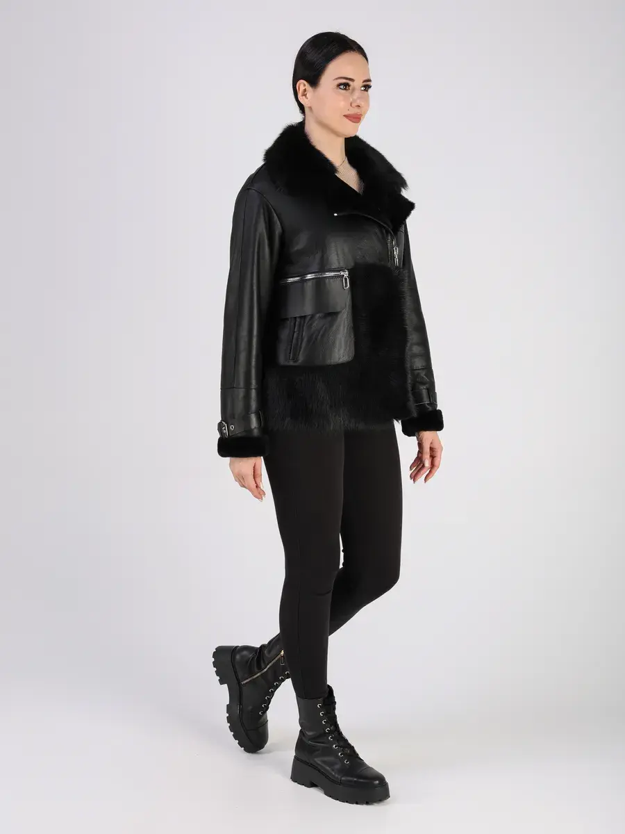 Особое внимание привлекает меховые вставки, которые делают модель модной и эксклюзивной. Спущенная линия плеч добавляет комфорта, а застежка - косая молния и хлястики на рукавах служат не только функциональным элементом, но и оригинальной деталью дизайна. Прорезные карманы и воротник с отделкой из меха овчина, придают изделию роскошный вид.