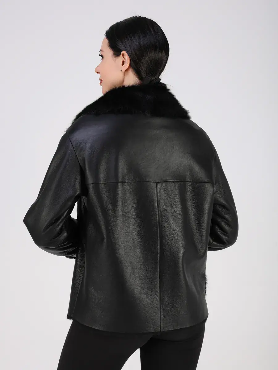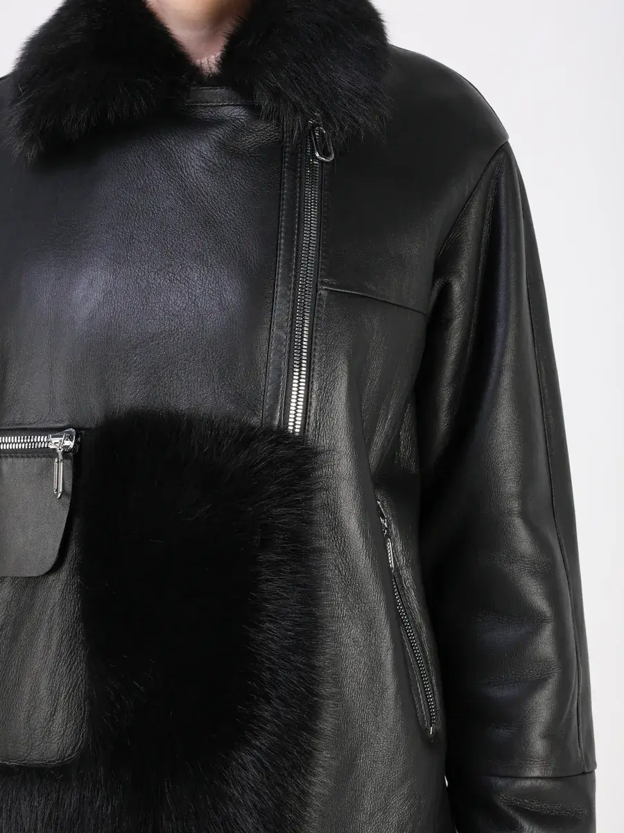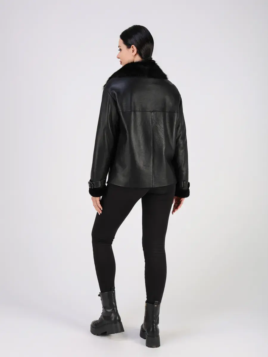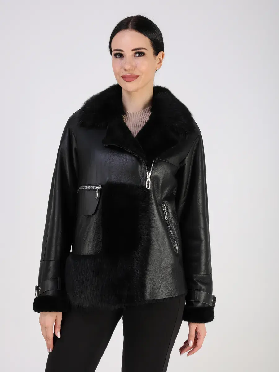Особое внимание привлекает меховые вставки, которые делают модель модной и эксклюзивной. Спущенная линия плеч добавляет комфорта, а застежка - косая молния и хлястики на рукавах служат не только функциональным элементом, но и оригинальной деталью дизайна. Прорезные карманы и воротник с отделкой из меха овчина, придают изделию роскошный вид.