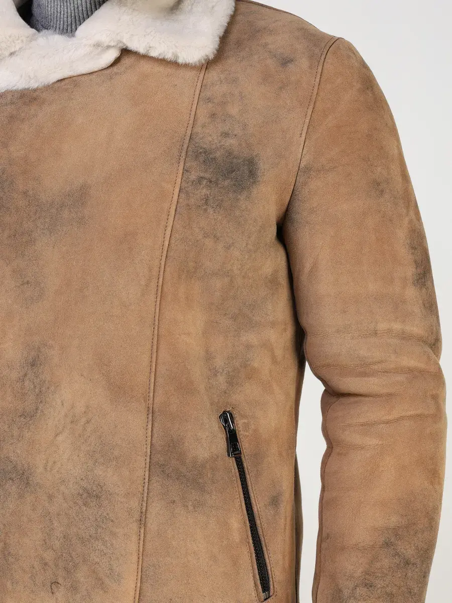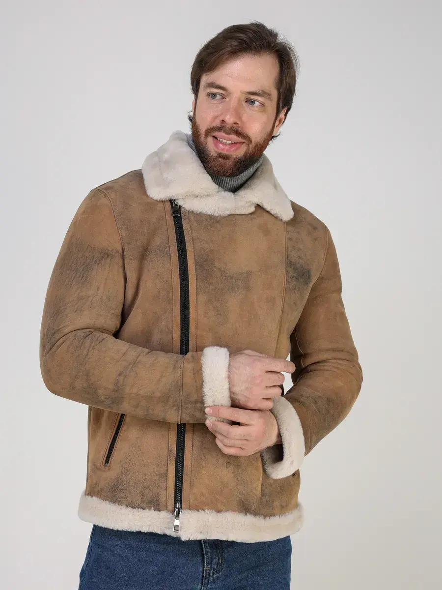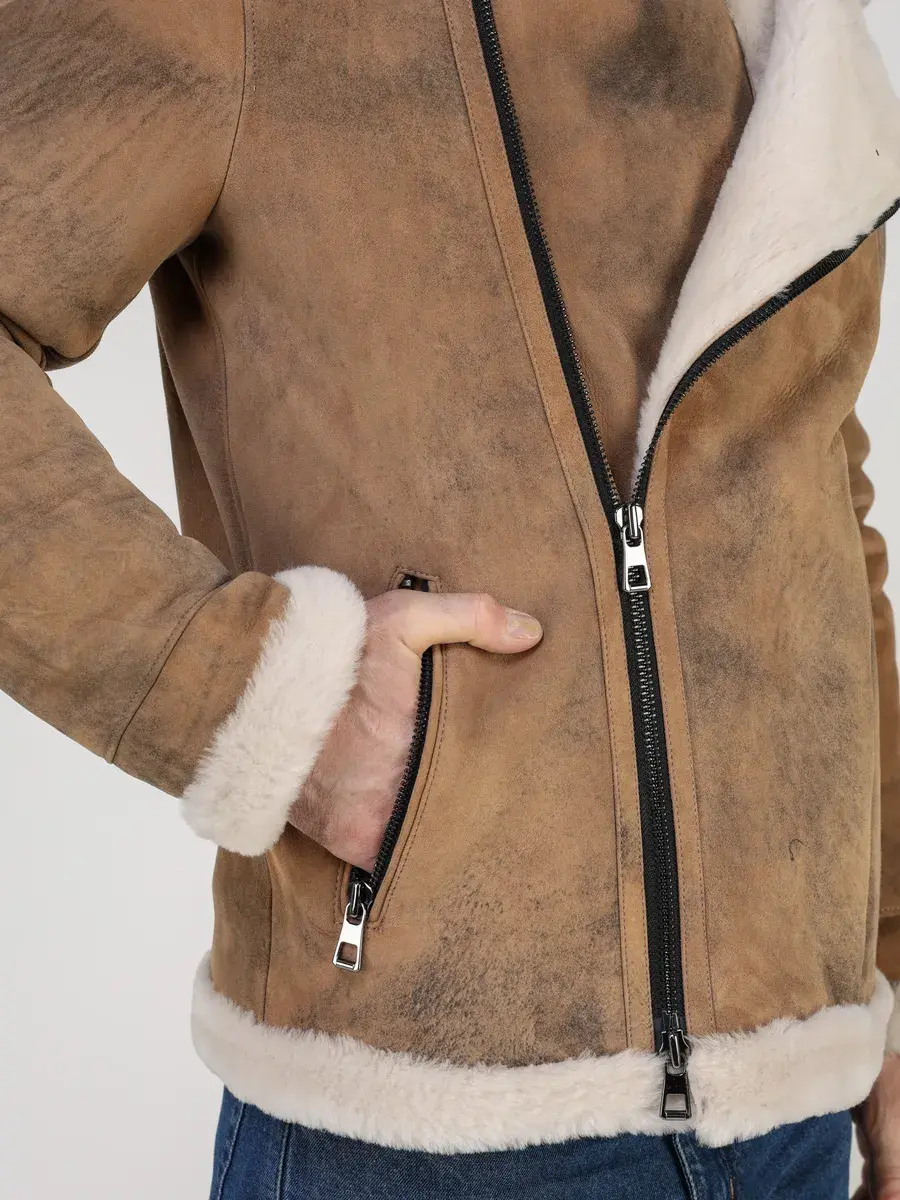 Стильный воротник, прямой крой, комбинация цвета и фактура с эффектом потертости и с неравномерным окрасом придают куртке - дубленке уникальность и изысканность, идеально впишется в брутальный стиль и дополнит солидный образ мужчины или парня подростка, независимо от возраста. Застежка на молнии обеспечивает легкость и удобство в использовании, а прорезные карманы на молниях дополнительно увеличивают функциональность и практичность куртки средней длины.