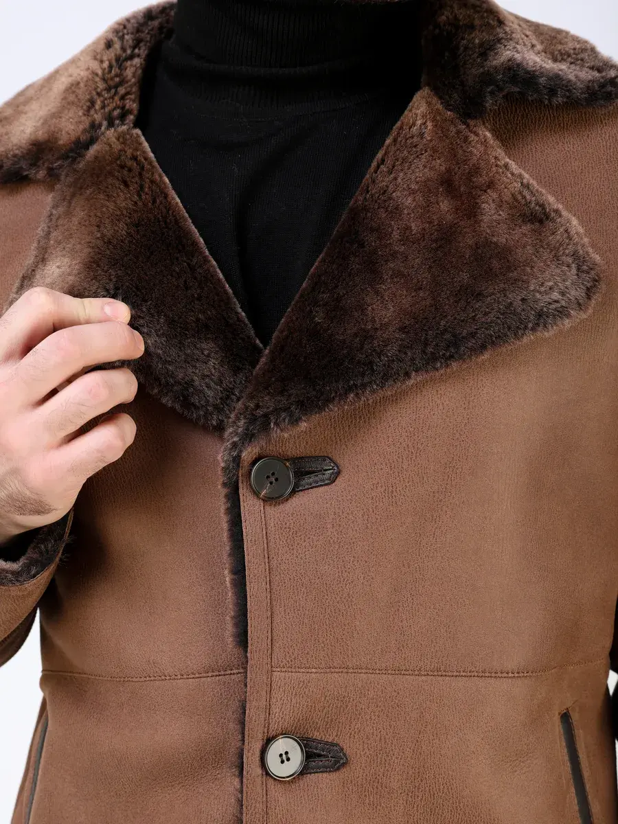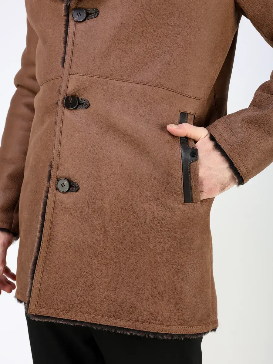 Стильный английский воротник с лацканами, прямой крой, декоративные кожаные вставки на карманах придают куртке - дубленке уникальность и изысканность, идеально впишется в деловой стиль и дополнит солидный образ мужчины или парня подростка, независимо от возраста. Застежка на пуговицах обеспечивает легкость и удобство в использовании, а прорезные карманы по бокам дополнительно увеличивают функциональность и практичность куртки средней длины.