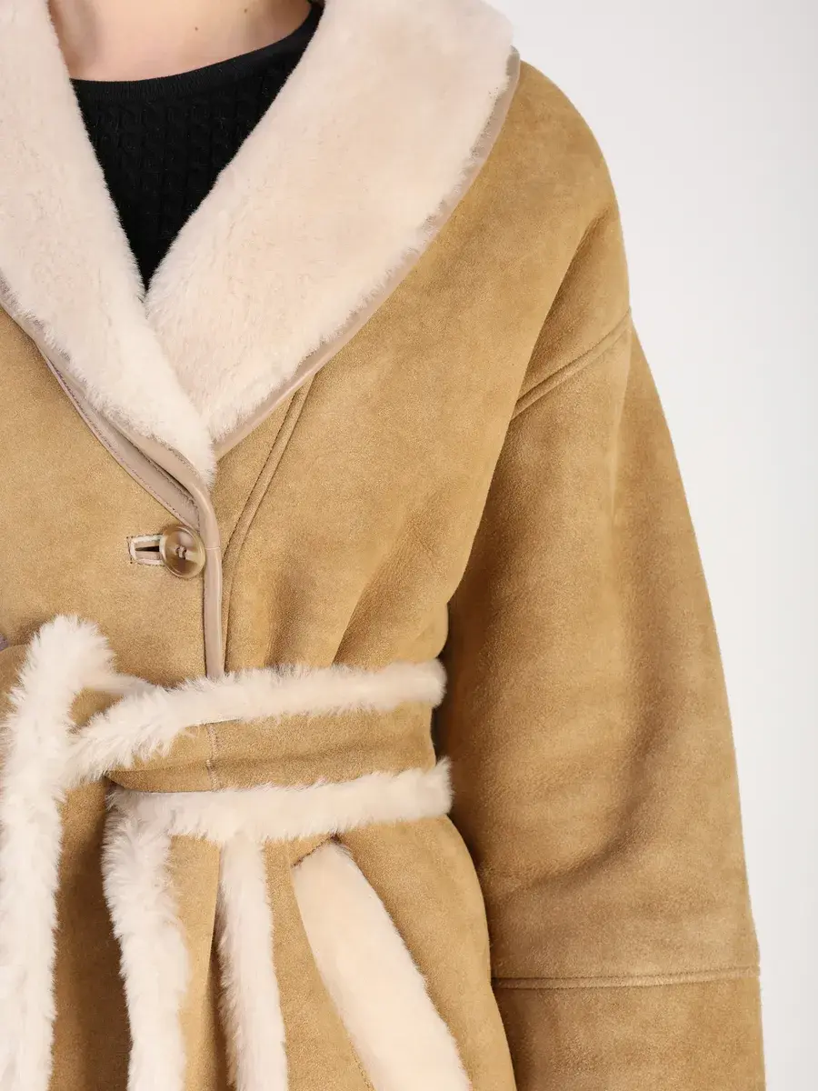 Особое внимание привлекает свободный - оверсайз крой и эффект потертости, которые делают модель модной и эксклюзивной. Спущенная линия плеча и вставки из кожи и меха, воротник апаш, застежка на пуговицах служат не только функциональным элементом, но и оригинальной деталью дизайна. В комплекте меховой пояс.
