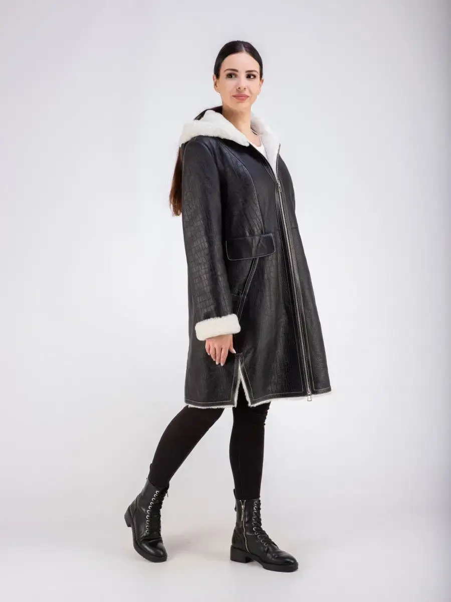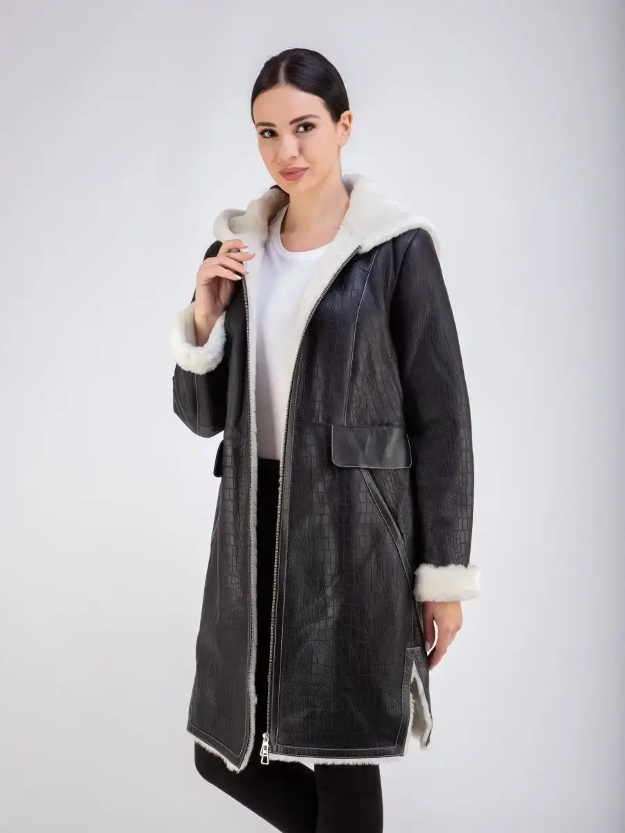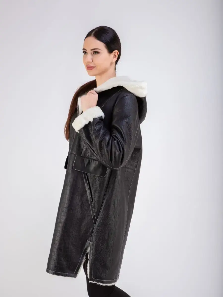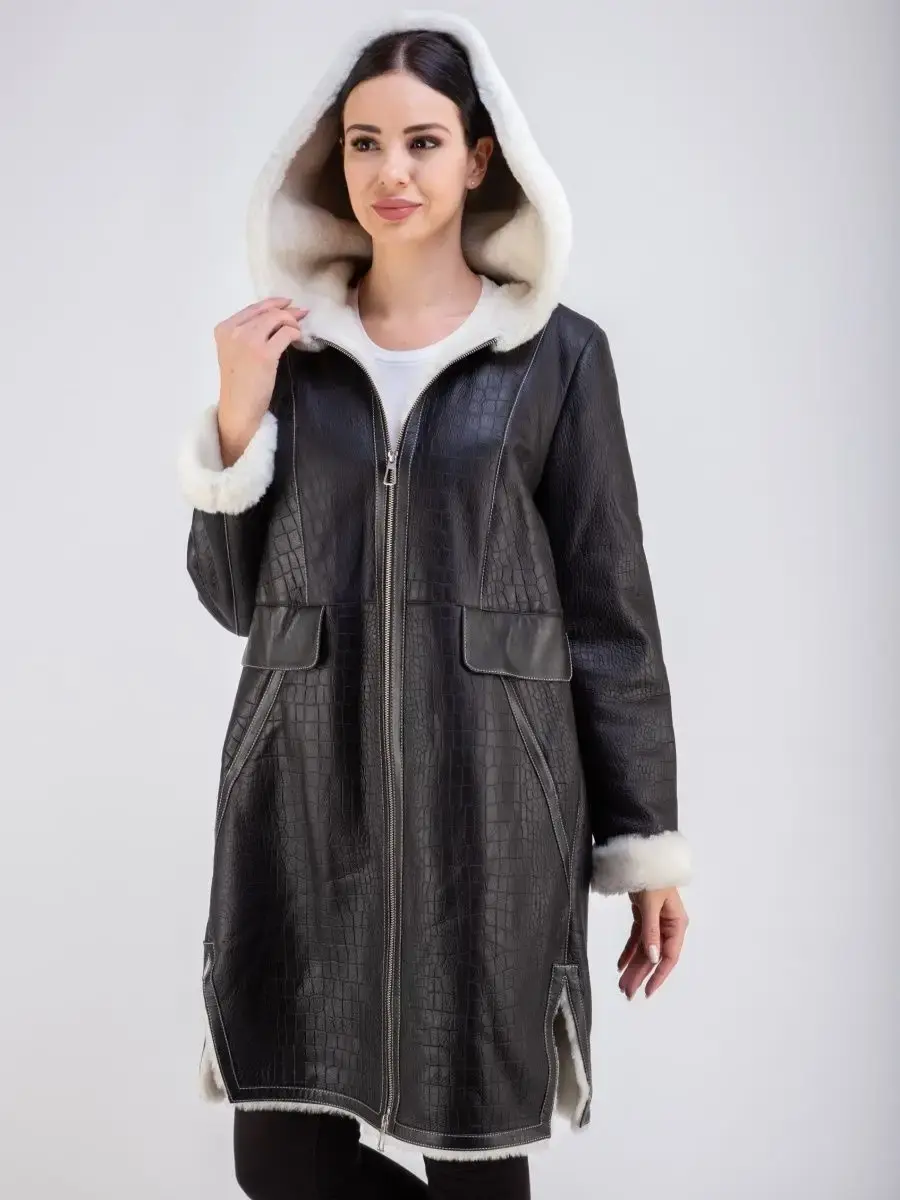 Стильная удлиненная дубленка женская зимняя с капюшоном бренда MONDIAL - это модная верхняя одежда для женщин, идеальная для ношения в холодное время зимой и осенью. Модель в популярном стиле оверсайз длиной до колена имеет свободный и прямой крой, прорезные боковые карманы, удобную застежку на молнию и разрезы внизу по бокам для удобства ходьбы. Изделие выполнено из мягкой натуральной кожи премиум - качества с покрытием силки и имеет теплую меховую подкладку из овчины. Покрытие силки и тиснение под кожу крокодила придают этой дубленке стильный и модный вид.