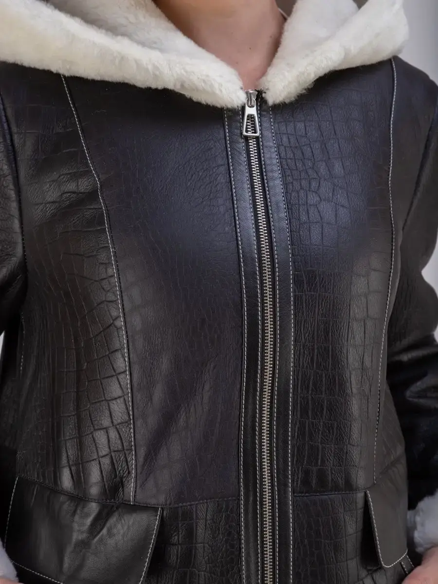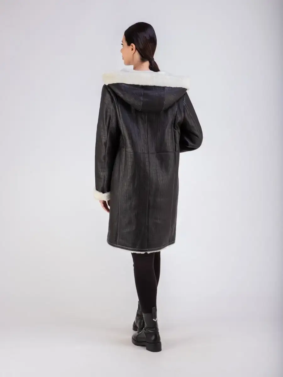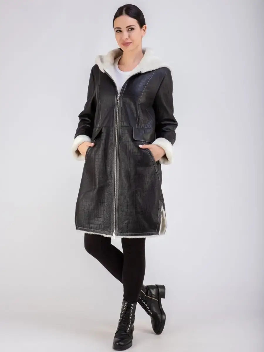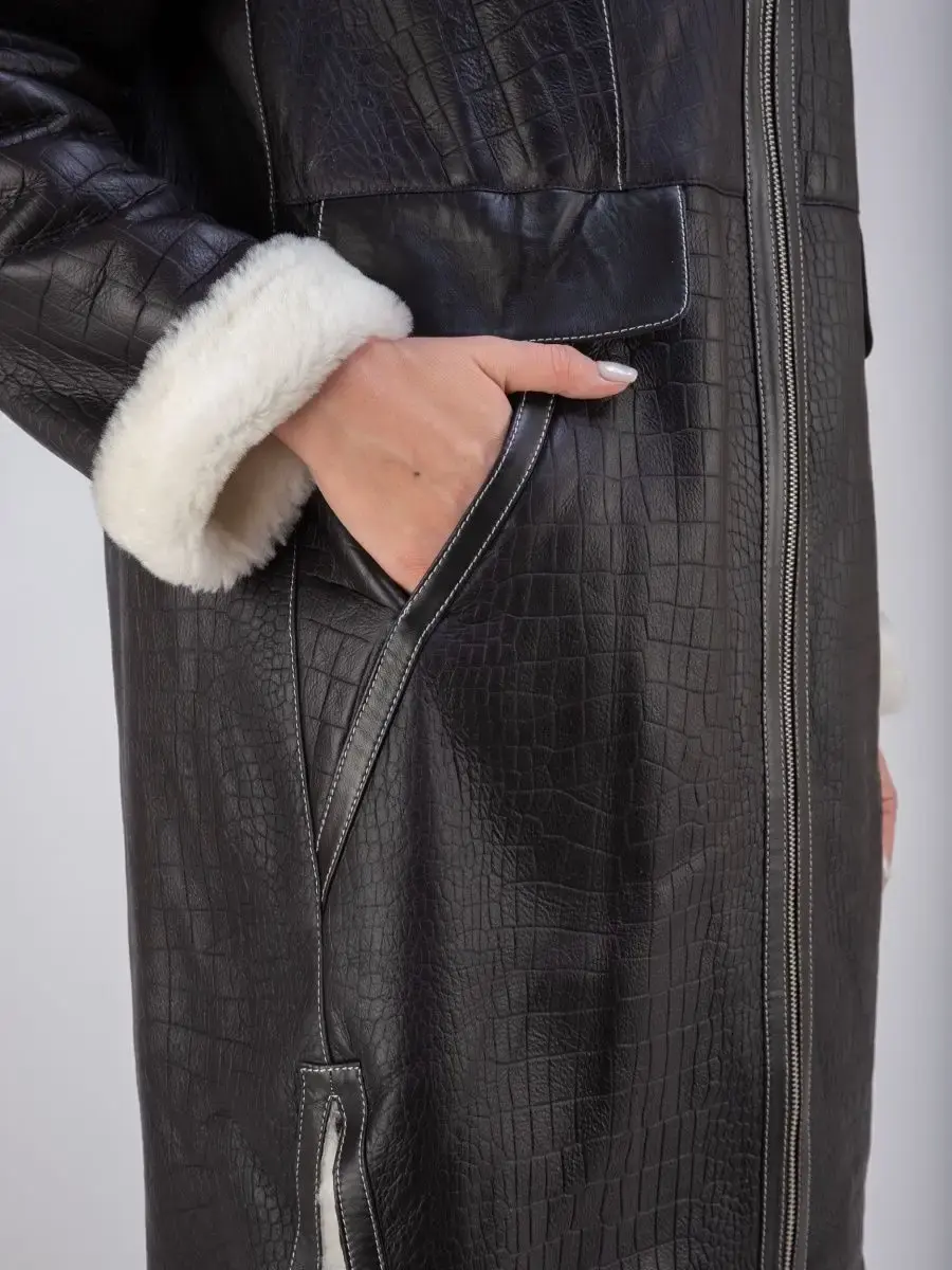 Стильная удлиненная дубленка женская зимняя с капюшоном бренда MONDIAL - это модная верхняя одежда для женщин, идеальная для ношения в холодное время зимой и осенью. Модель в популярном стиле оверсайз длиной до колена имеет свободный и прямой крой, прорезные боковые карманы, удобную застежку на молнию и разрезы внизу по бокам для удобства ходьбы. Изделие выполнено из мягкой натуральной кожи премиум - качества с покрытием силки и имеет теплую меховую подкладку из овчины. Покрытие силки и тиснение под кожу крокодила придают этой дубленке стильный и модный вид.