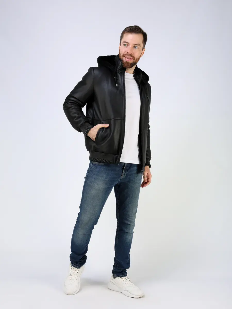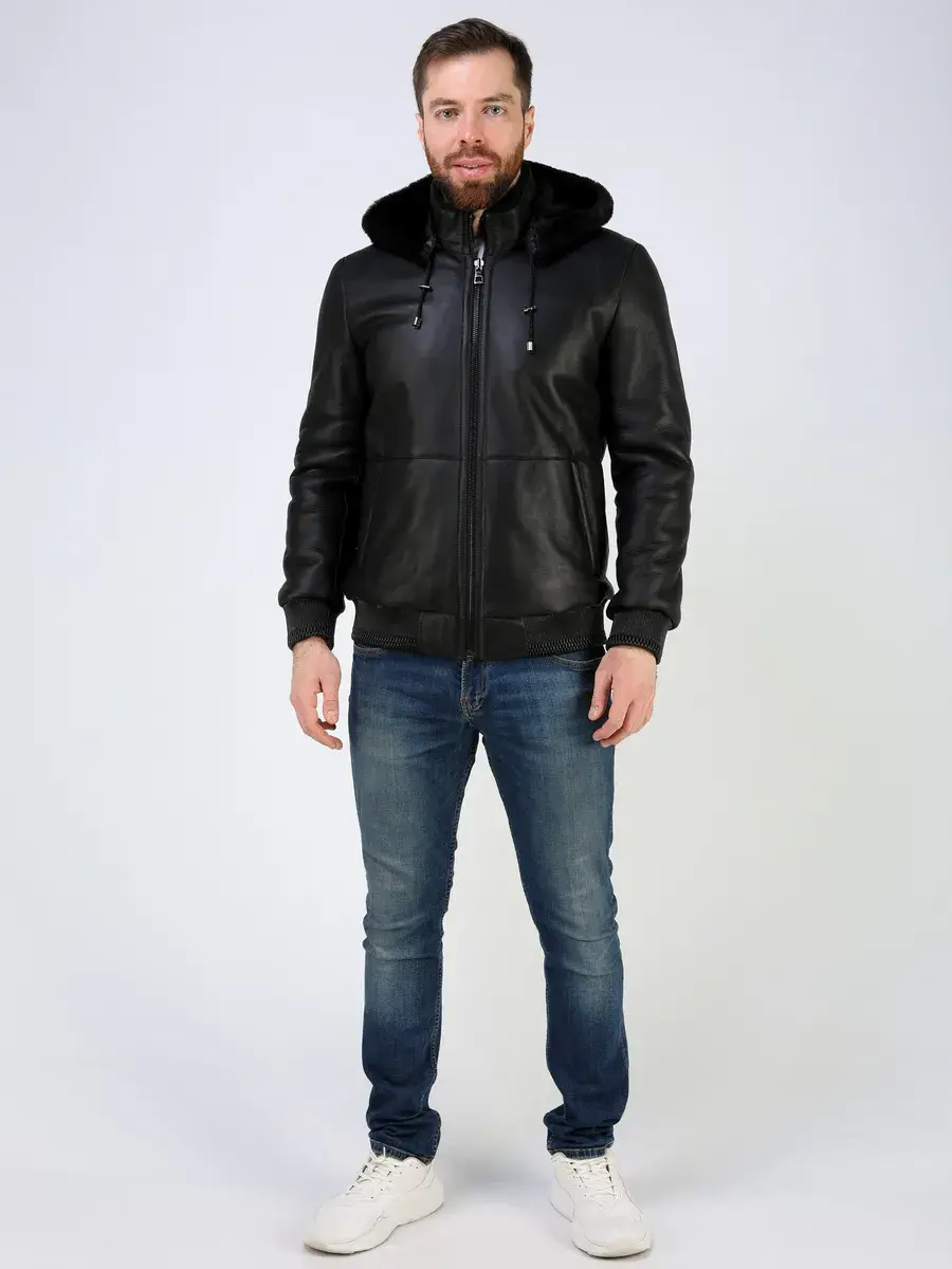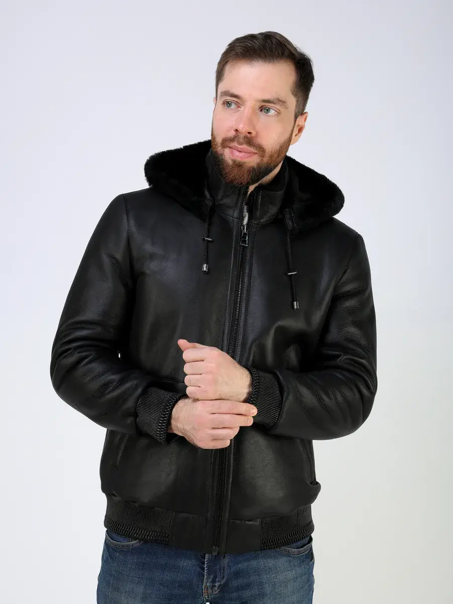 Стильный воротник стойка с съемным капюшоном на кулисках, прямой крой, декоративные кожаные манжеты и утягивающий низ придают куртке - дубленке уникальность и изысканность, идеально впишется в деловой стиль и дополнит солидный образ мужчины или парня подростка, независимо от возраста. Застежка на молнии обеспечивает легкость и удобство в использовании, а прорезные карманы дополнительно увеличивают функциональность и практичность куртки, бомбер средней длины.