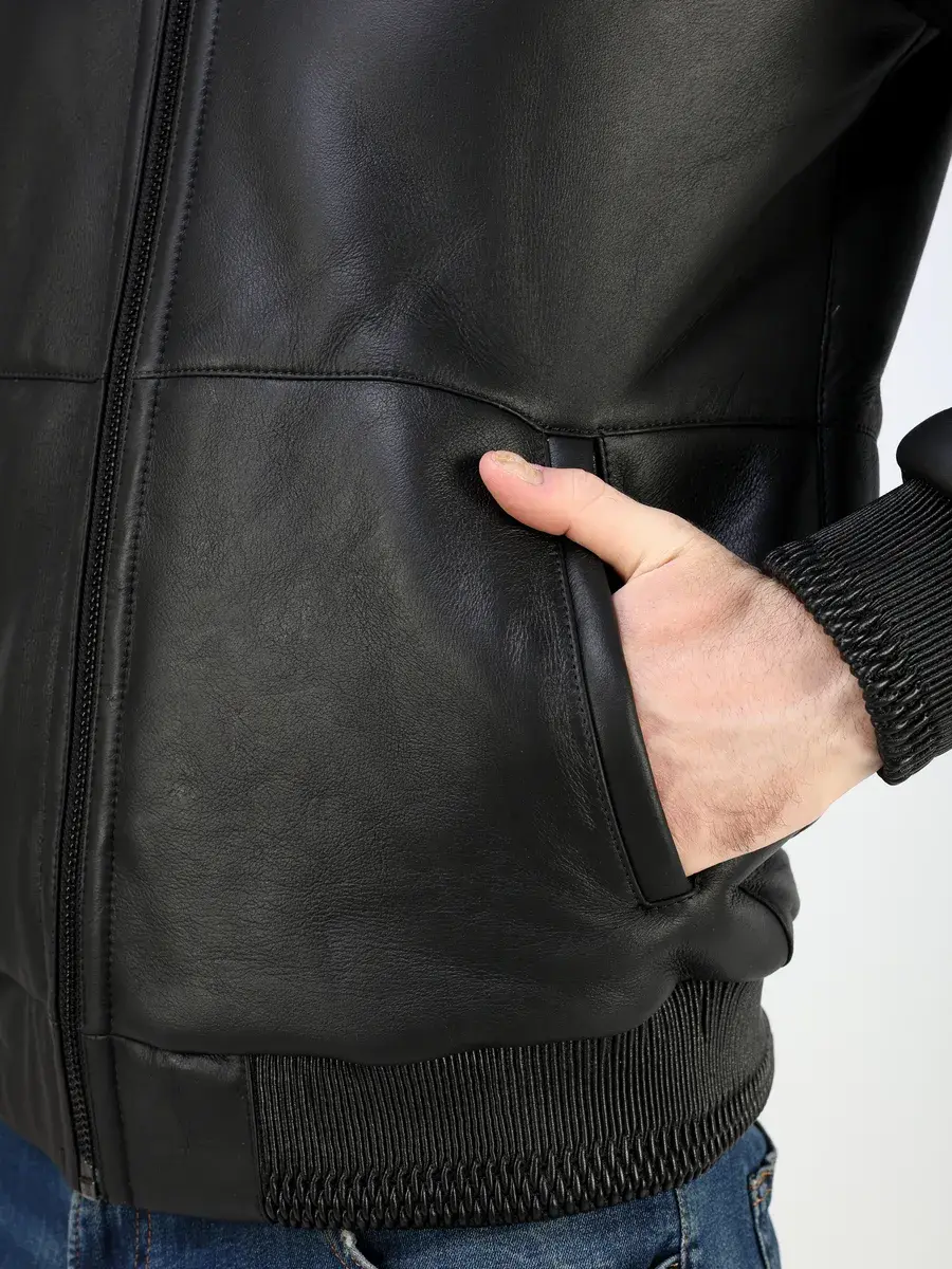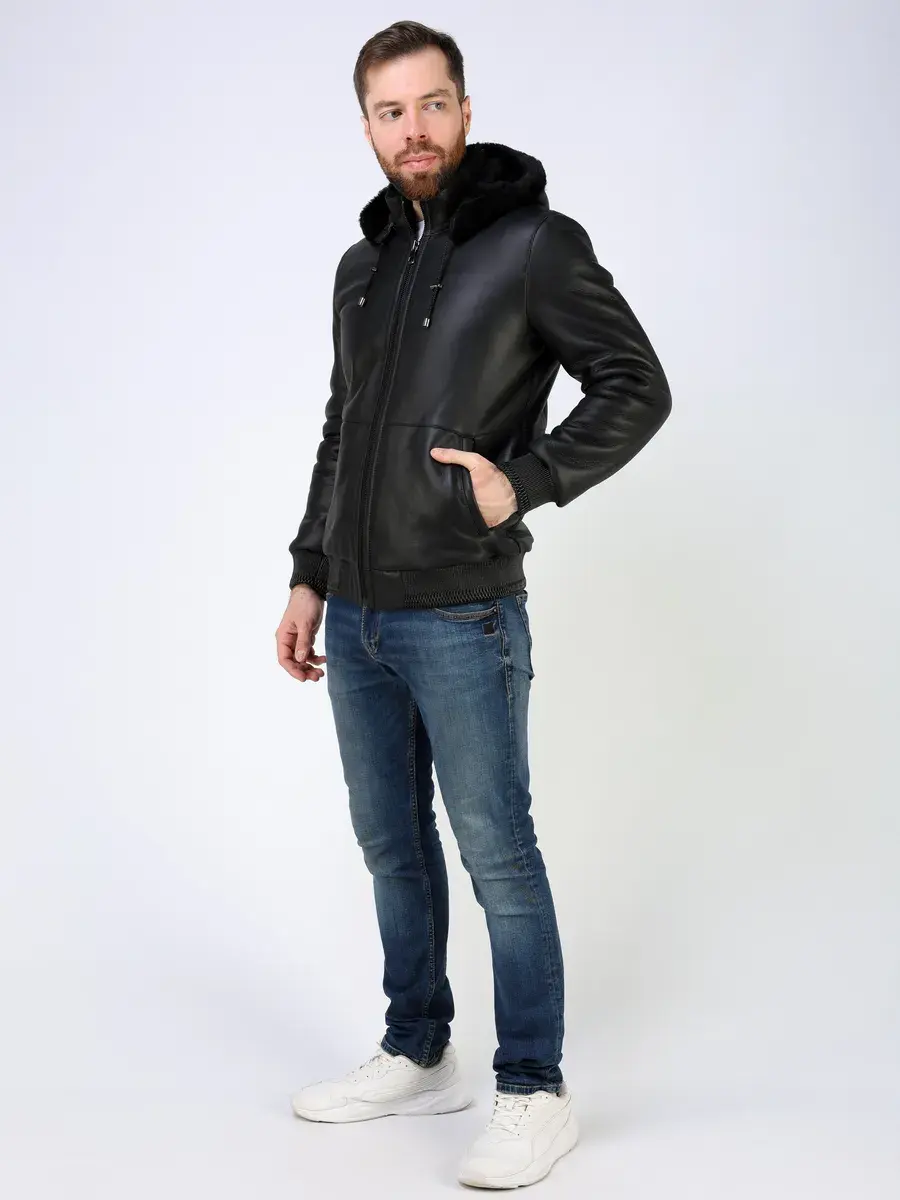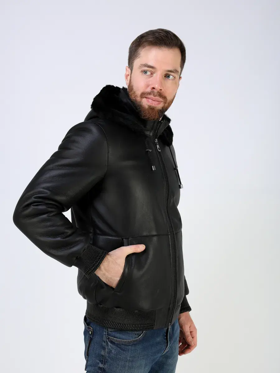 Стильный воротник стойка с съемным капюшоном на кулисках, прямой крой, декоративные кожаные манжеты и утягивающий низ придают куртке - дубленке уникальность и изысканность, идеально впишется в деловой стиль и дополнит солидный образ мужчины или парня подростка, независимо от возраста. Застежка на молнии обеспечивает легкость и удобство в использовании, а прорезные карманы дополнительно увеличивают функциональность и практичность куртки, бомбер средней длины.