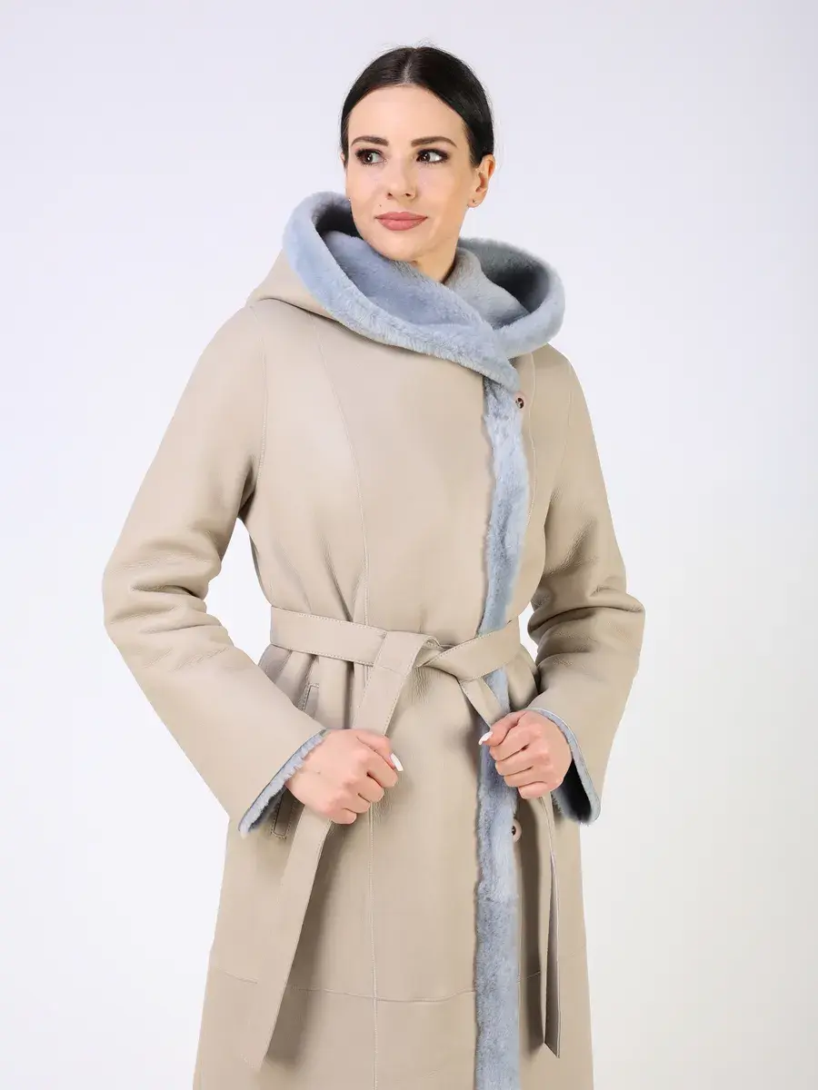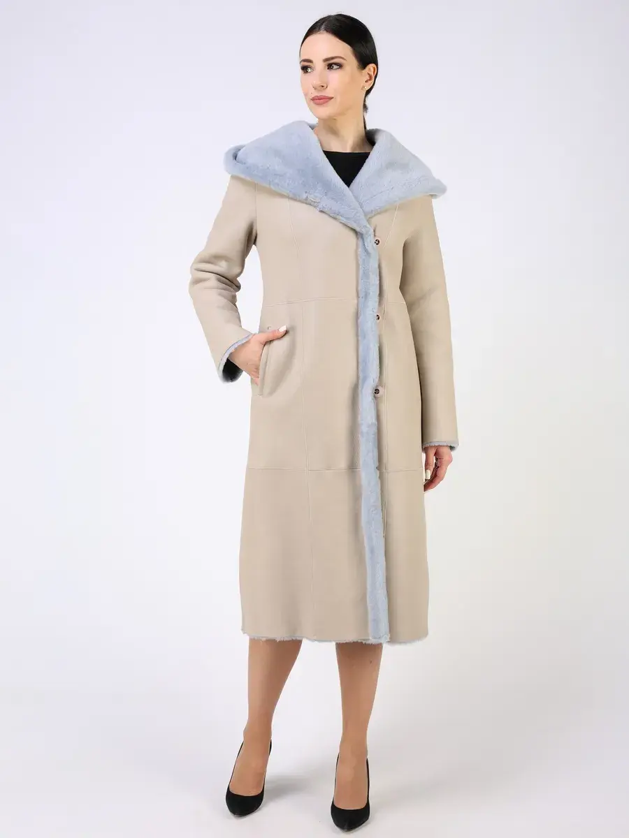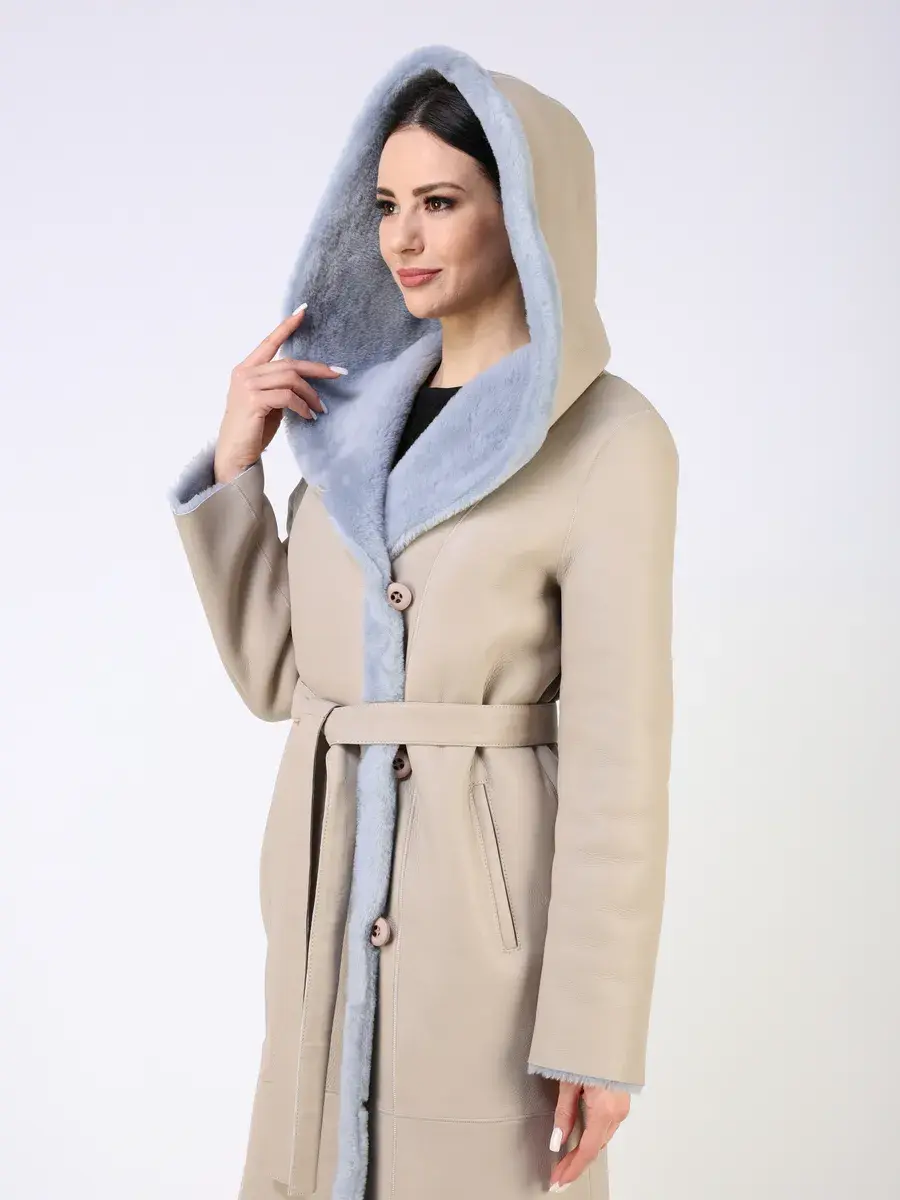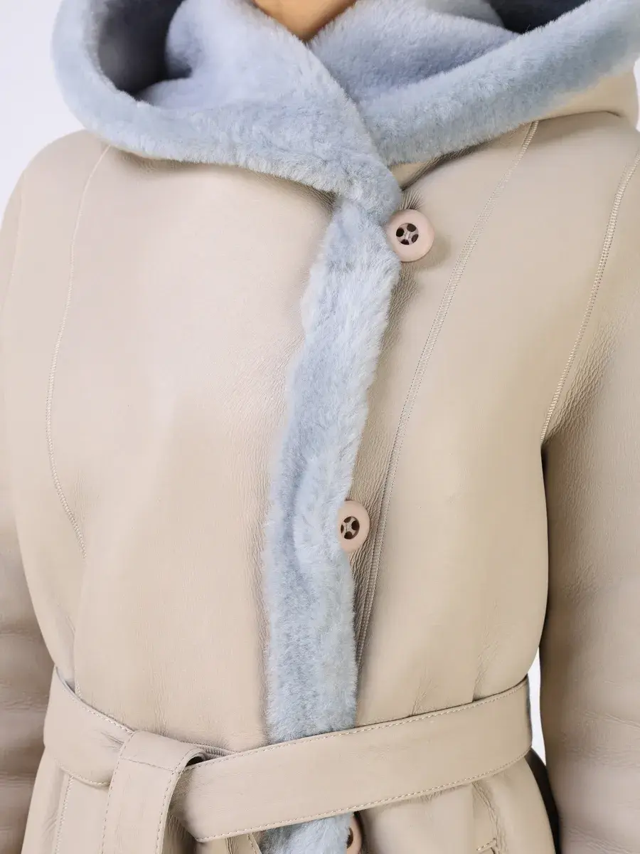 Каждая деталь этой дубленки выполнена с особым вниманием к качеству. Модель с глубоким капюшоном, с меховыми манжетами, прорезными боковыми карманами и длиной ниже колена имеет удобную застежку на пуговицах и классический дизайн в стиле минимализм. Капюшон оформлен стильной опушкой, обеспечивая максимальную защиту от ветра и снега.
