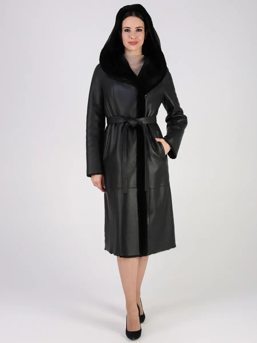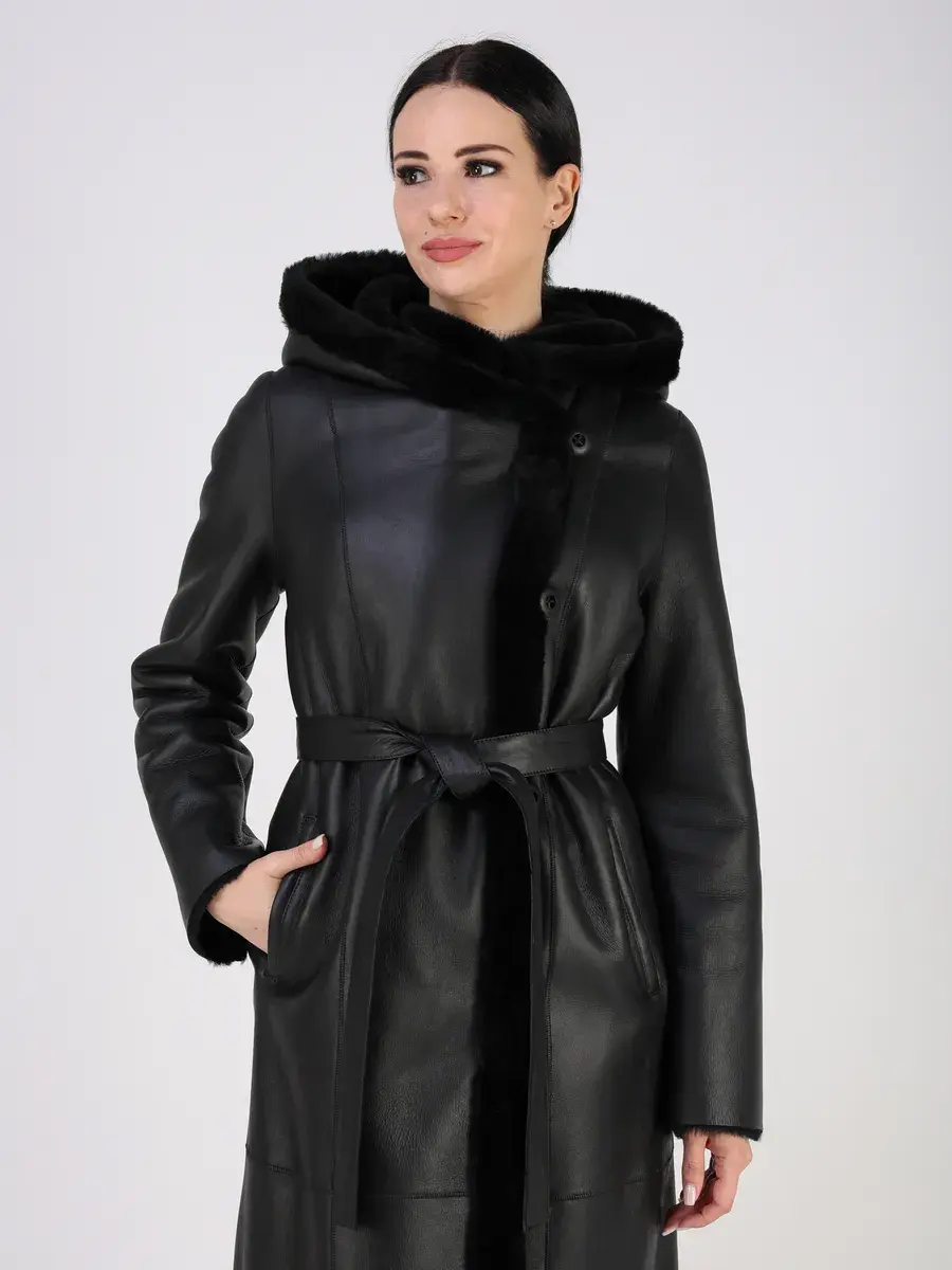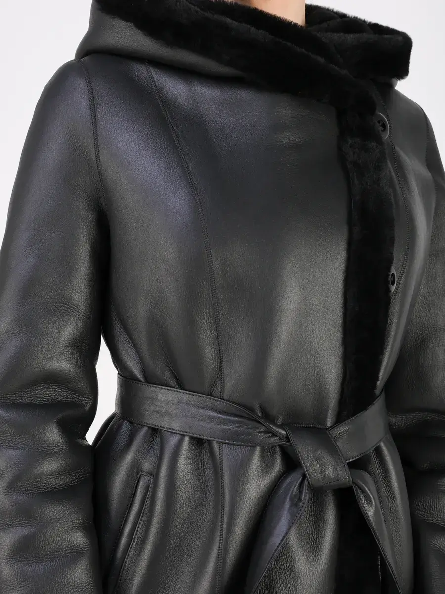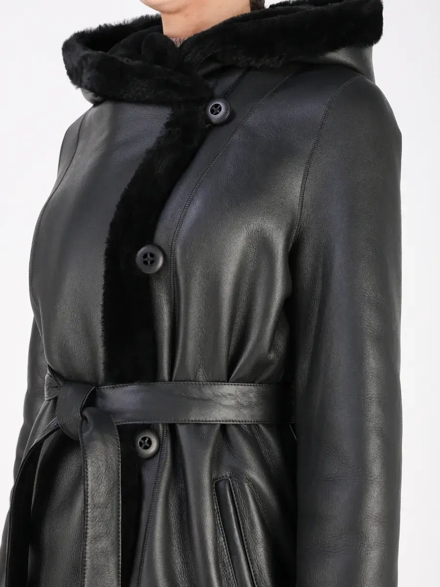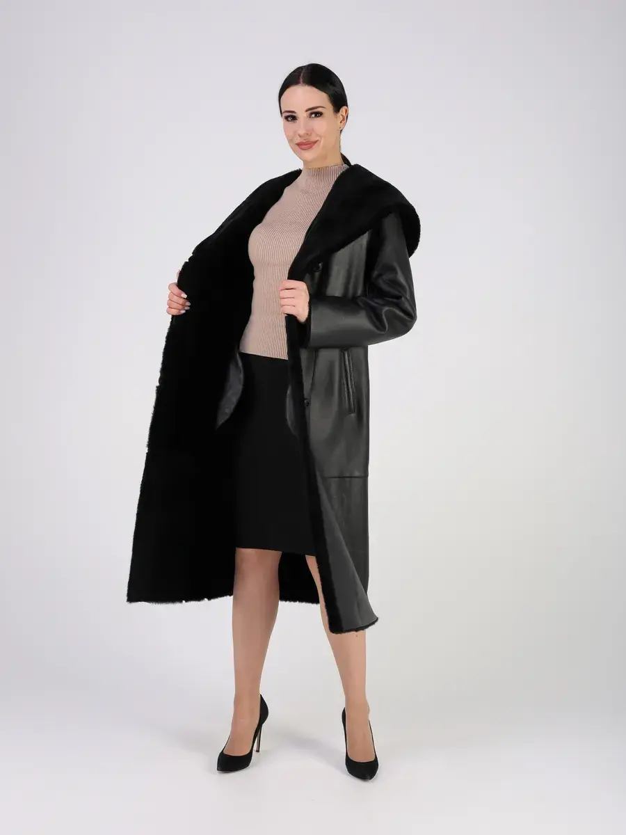 Каждая деталь этой дубленки выполнена с особым вниманием к качеству. Модель с глубоким капюшоном, с меховыми манжетами, прорезными боковыми карманами и длиной ниже колена имеет удобную застежку на пуговицах и классический дизайн в стиле минимализм. Капюшон оформлен стильной опушкой, обеспечивая максимальную защиту от ветра и снега.