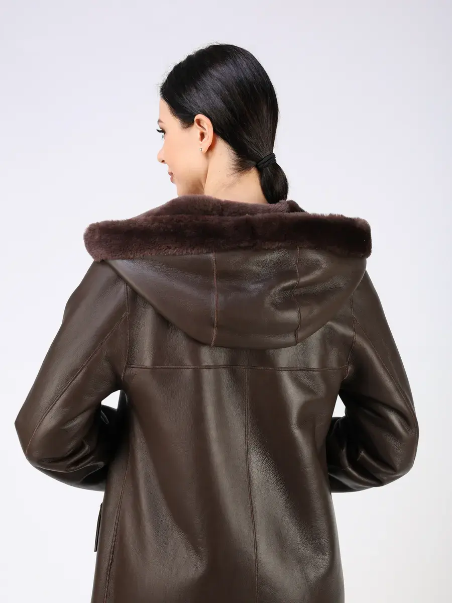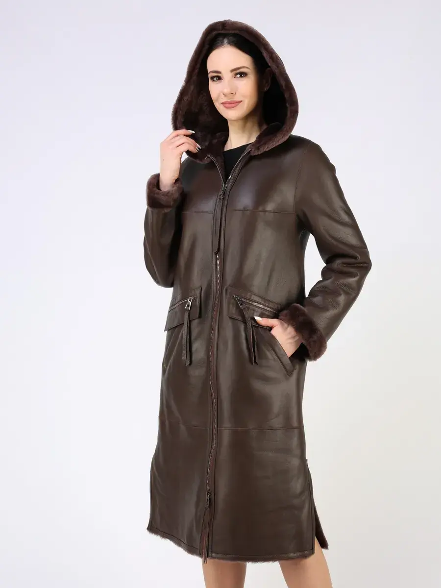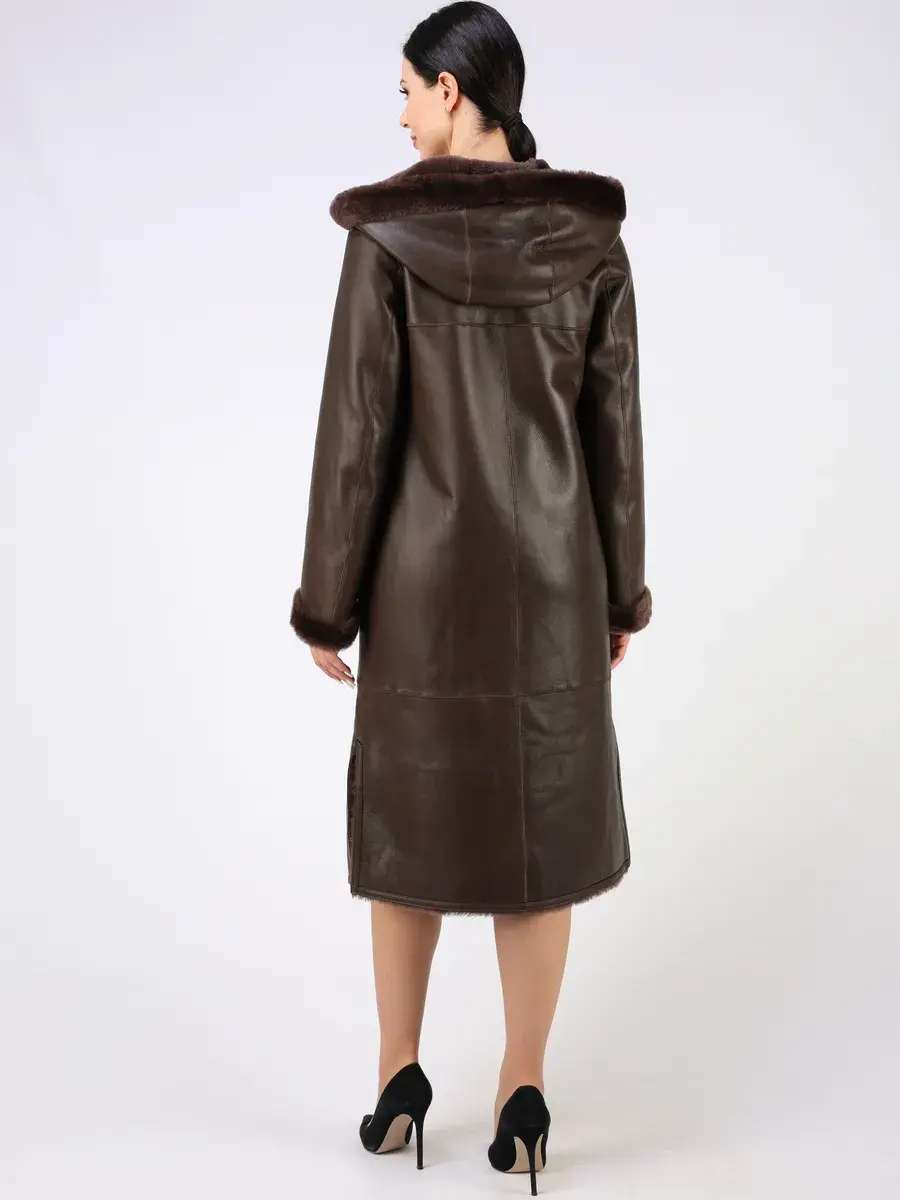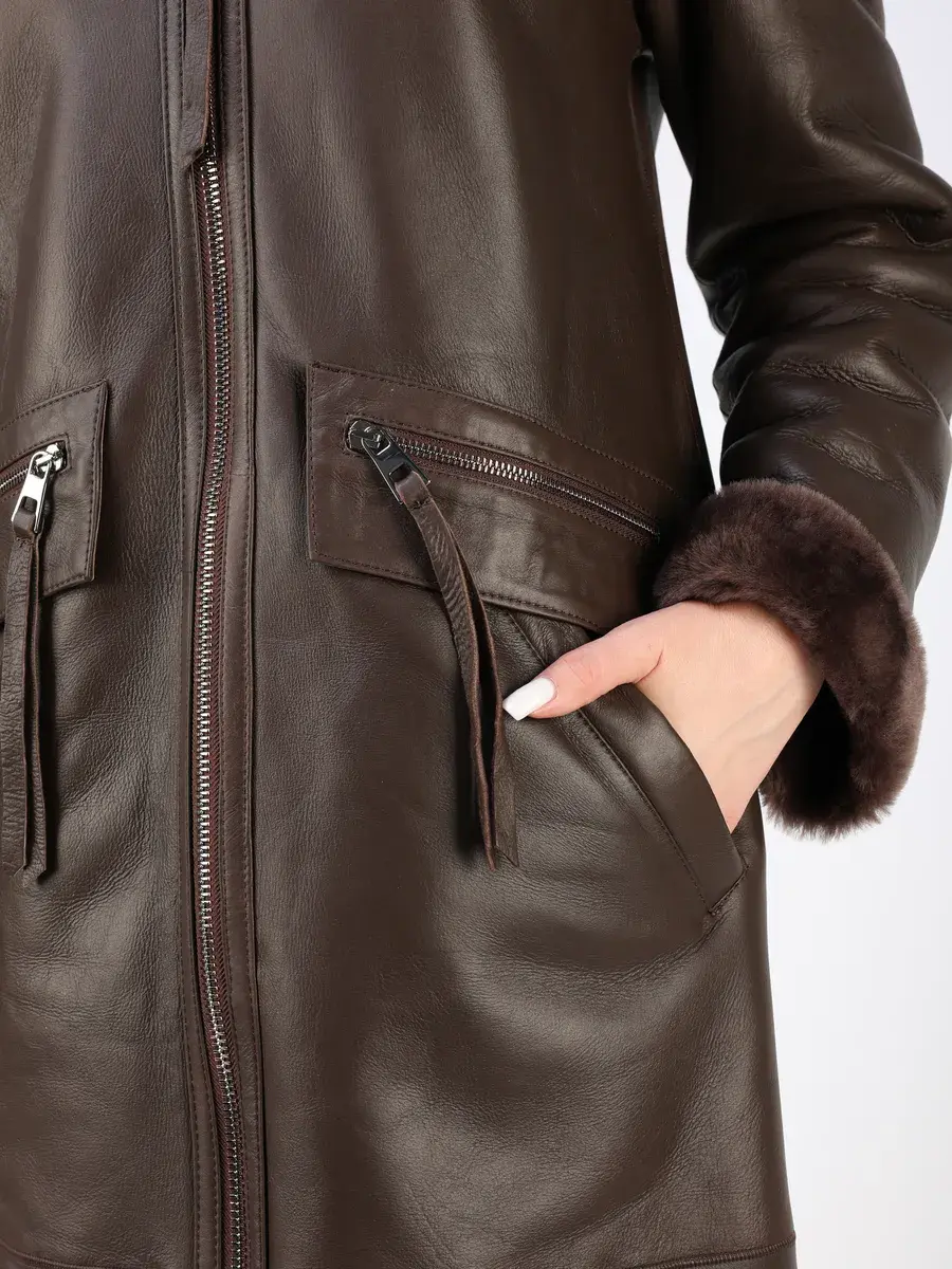 Каждая деталь этой дубленки выполнена с особым вниманием к качеству. Модель с глубоким капюшоном, с меховыми манжетами, шлицей на молнии по бокам, прорезными боковыми карманами и длиной ниже колена имеет удобную застежку на молнии и классический дизайн в стиле минимализм. Капюшон оформлен стильной опушкой, обеспечивая максимальную защиту от ветра и снега.