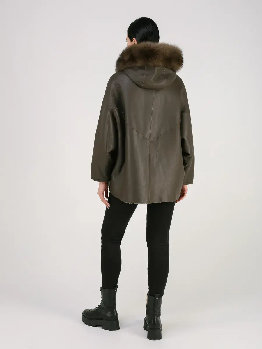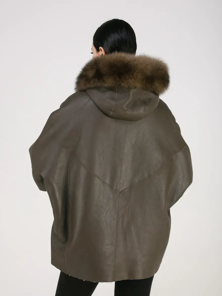 объемный мех лисы на капюшоне, асимметричный подол,